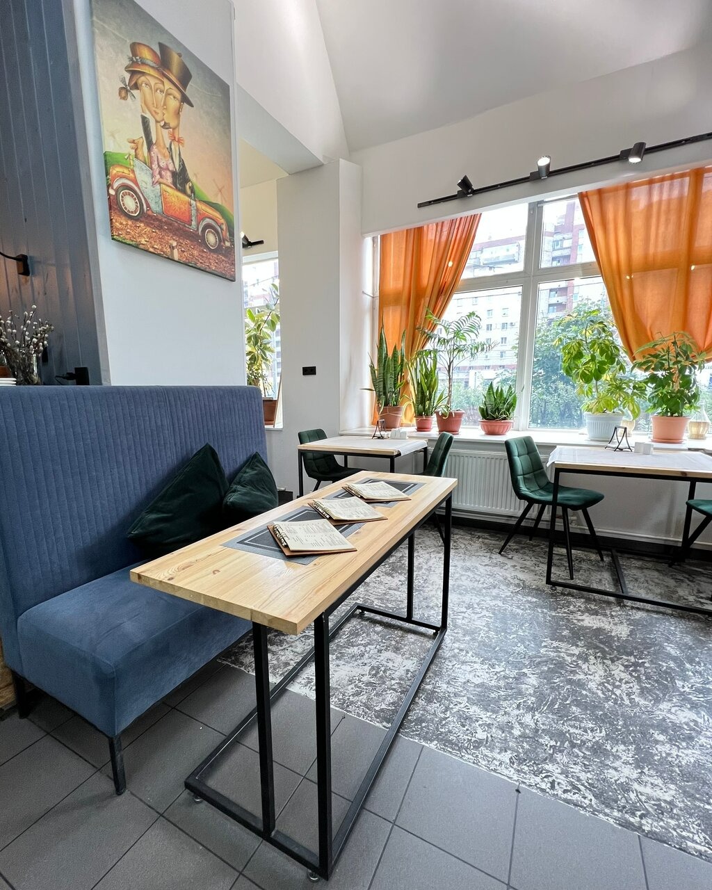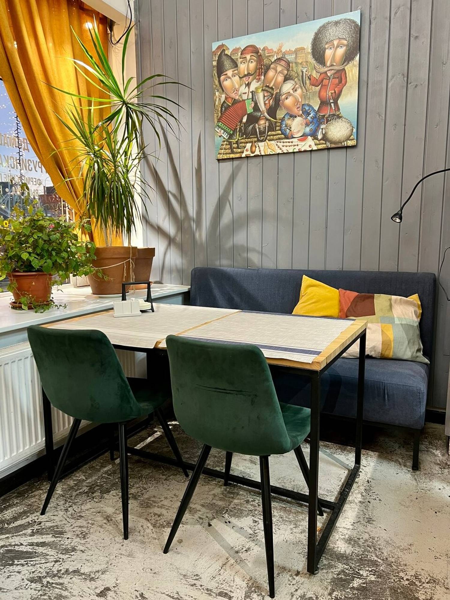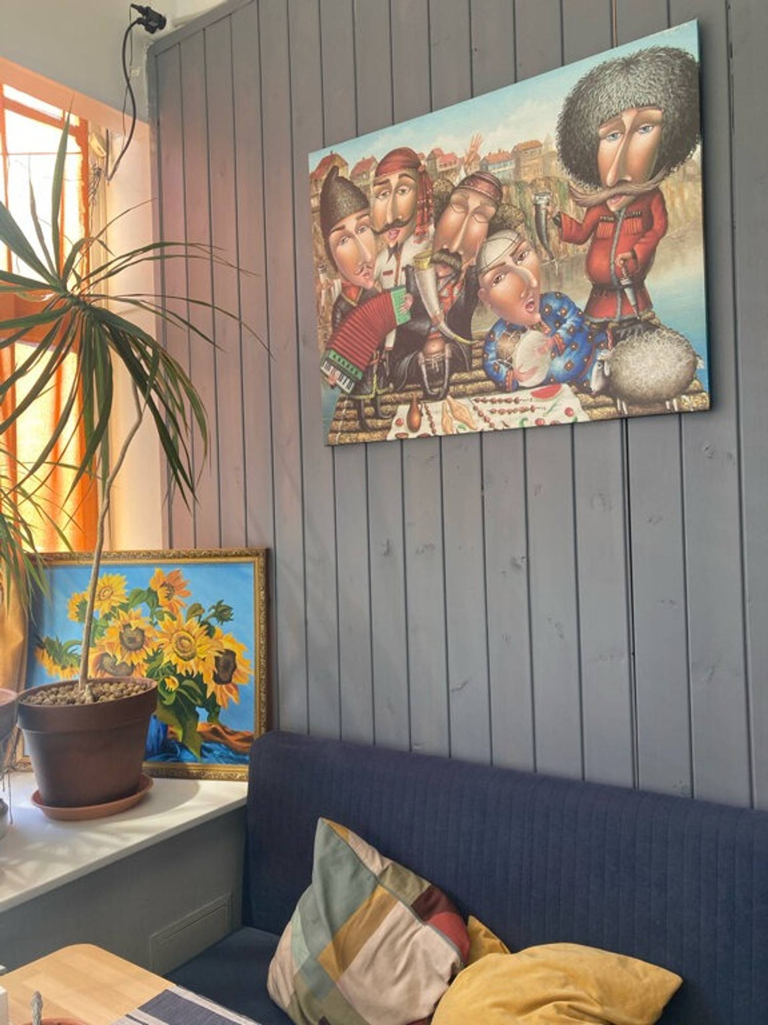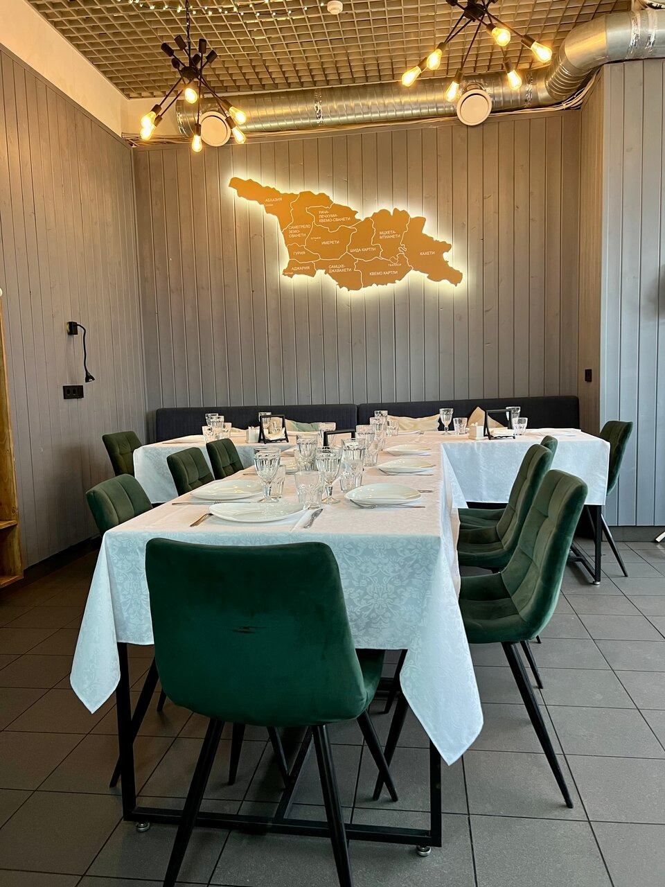 Атмосфера. Яркие детали создают ощущение грузинского дома: оранжевые занавески, шаржи грузин на стенах, карта мира с подсветкой и традиционная папаха, которую гости могут примерить. Открытый шкаф с национальной посудой на полках добавляет пространству национального шарма.