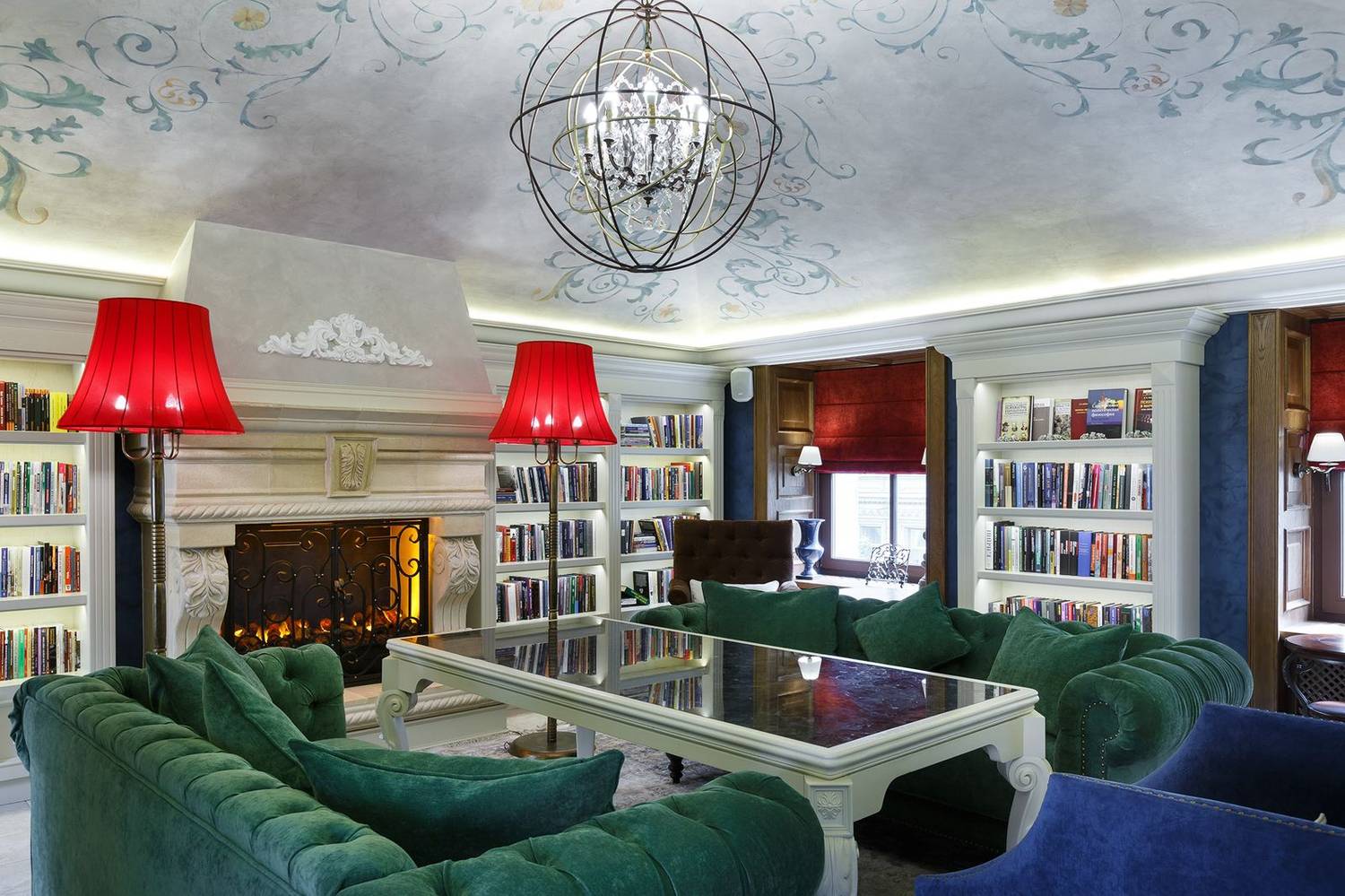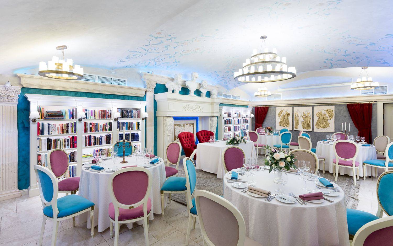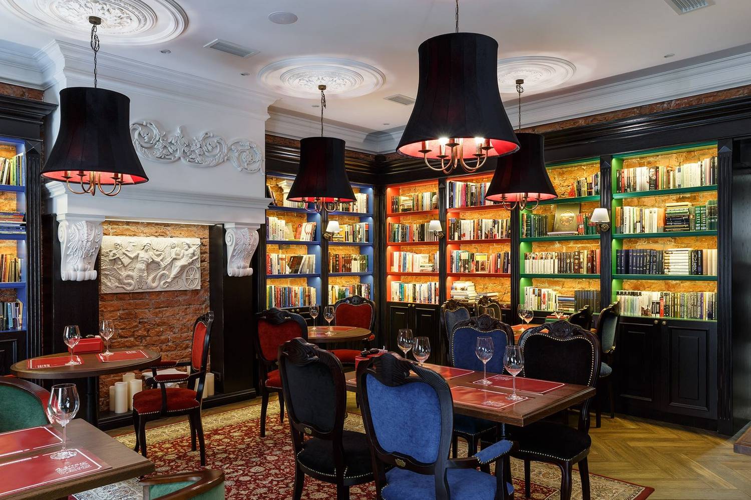 Атмосфера. Двухуровневый ресторан с разной атмосферой: на первом этаже — зал с кирпичной кладкой и камином, а на втором — элегантный со светлой мебелью, сводчатыми потолками с художественной росписью и мраморными колоннами. Но это не просто ресторан, но еще и книжный магазин с коллекцией из 2000 книг.
