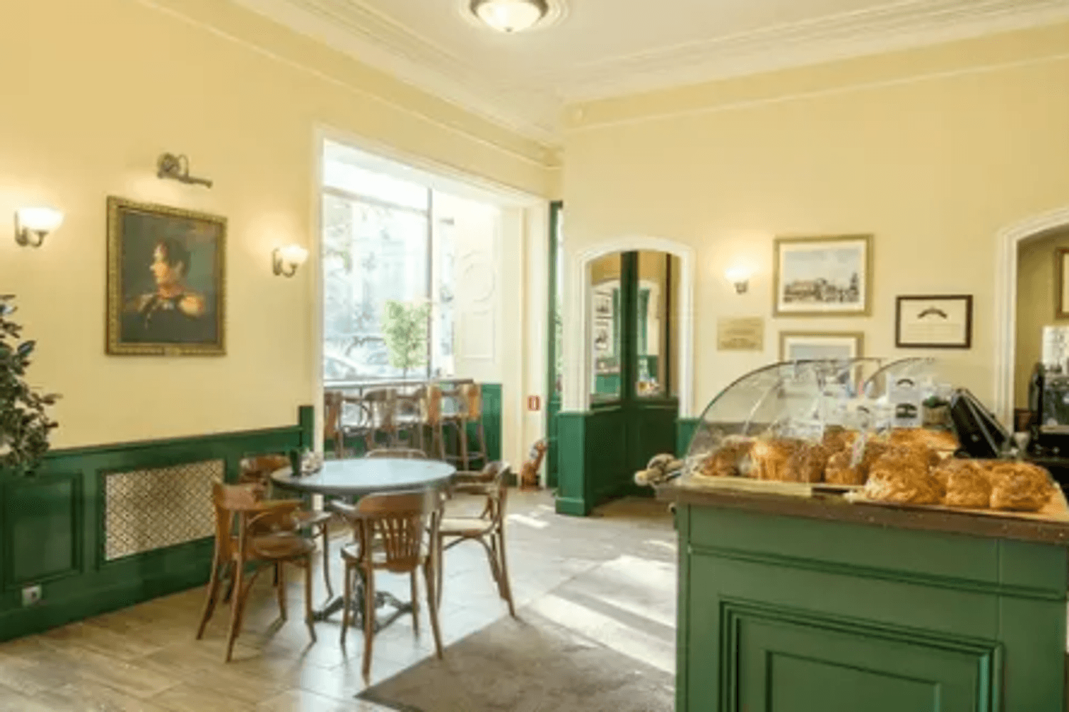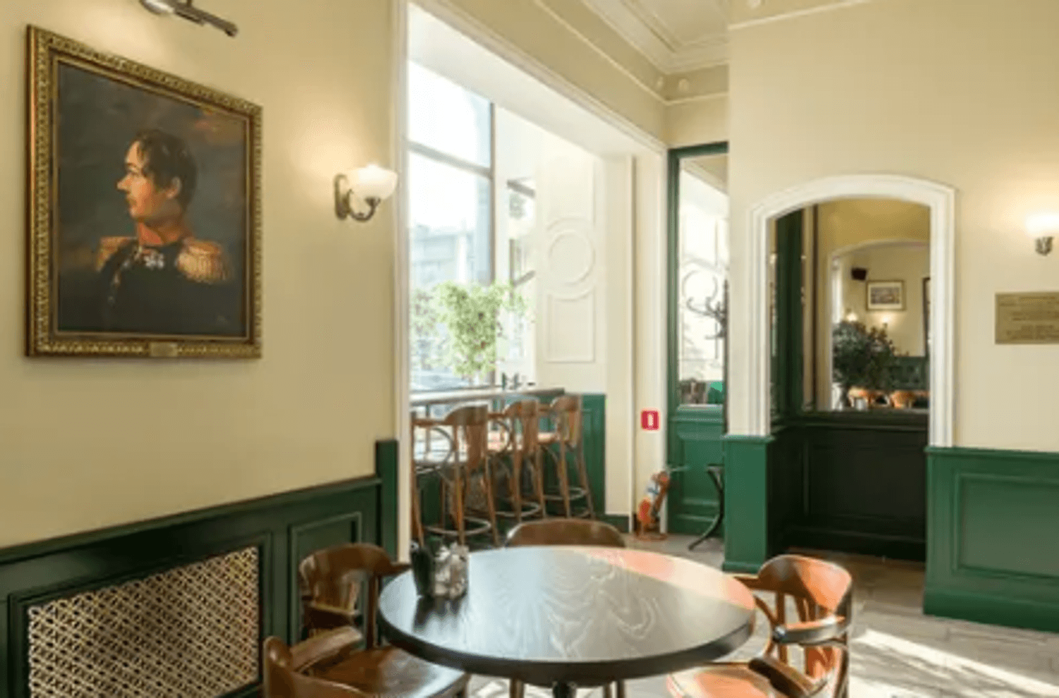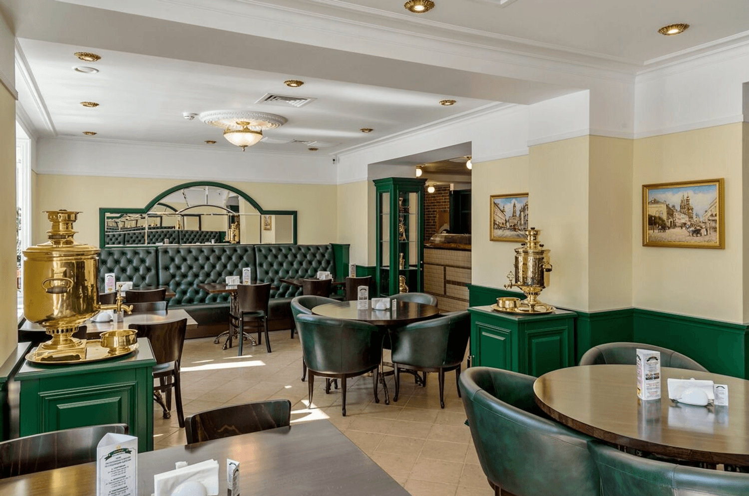 Атмосфера. Дизайн в фирменном изумрудном цвете, в такой палитре добавили мягкие диваны, дверцы на шкафах и комоды. На стену повесили зеркало в тонком обрамлении, а также картины в золотых рамах.