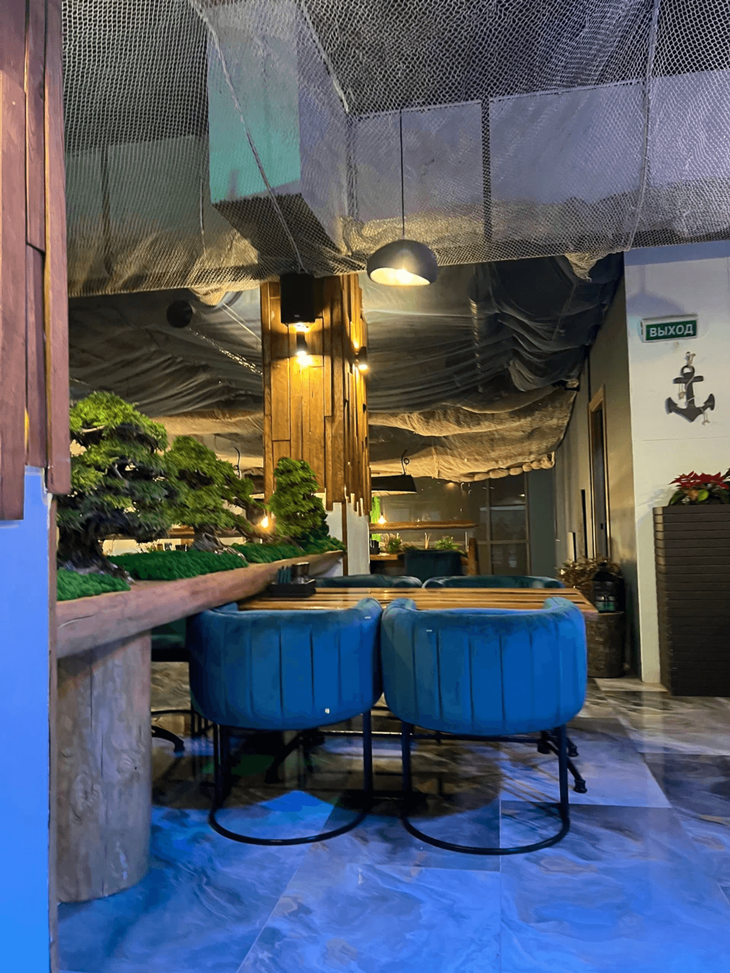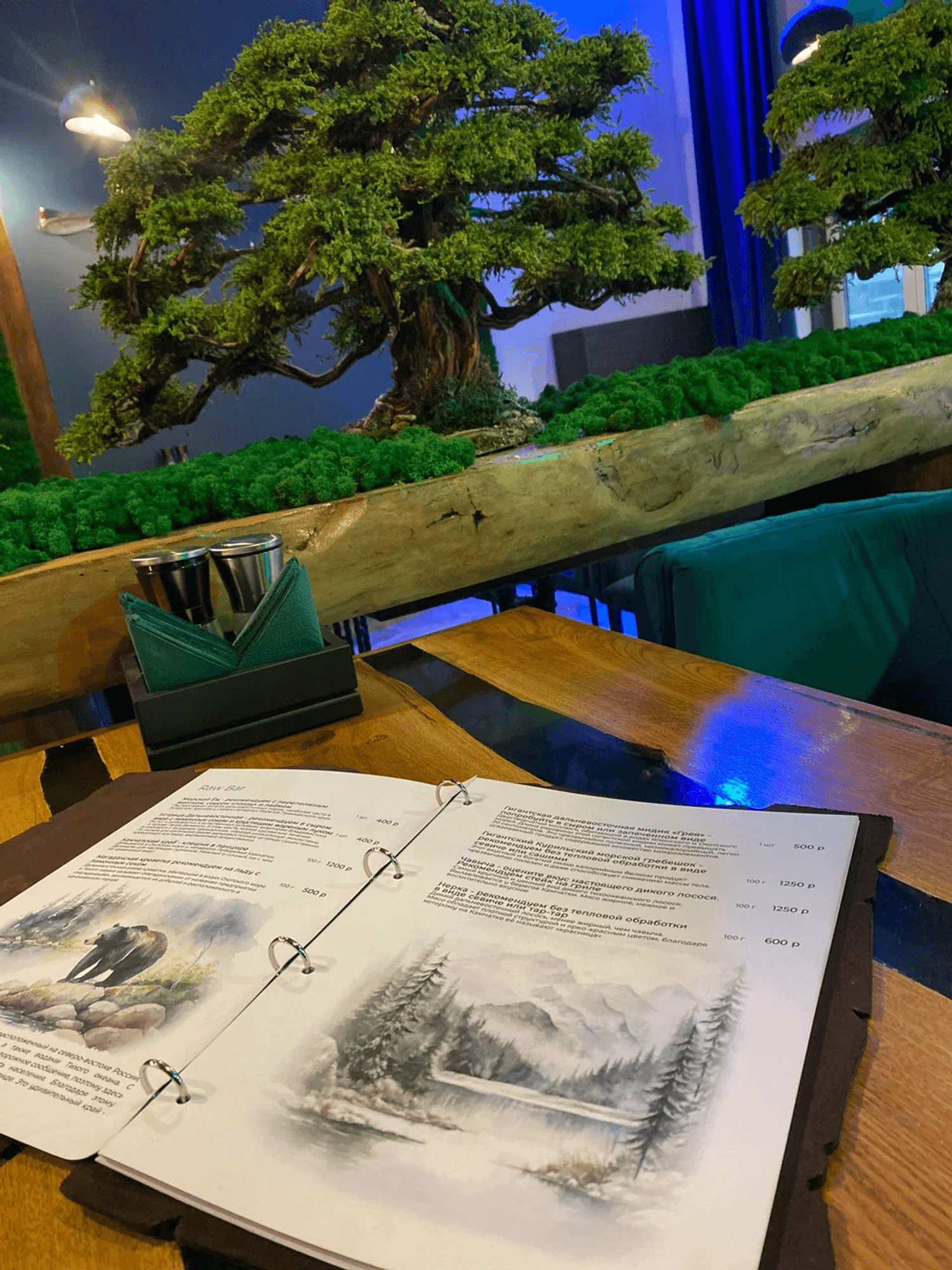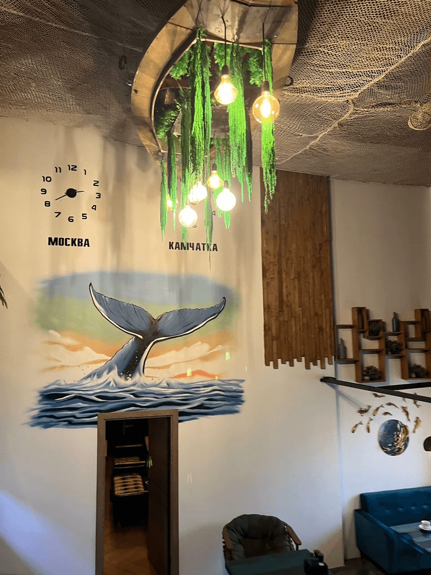 Атмосфера. Интерьер передает красоту и дух Камчатки, Чукотки и Приморья: синие оттенки, натуральное дерево, мох и декоративные элементы создают ощущение дикой природы. Столы отделаны срубами, на стенах — пейзажи Камчатки, а с потолка свисают «водоросли», подчеркивающие морскую тематику.