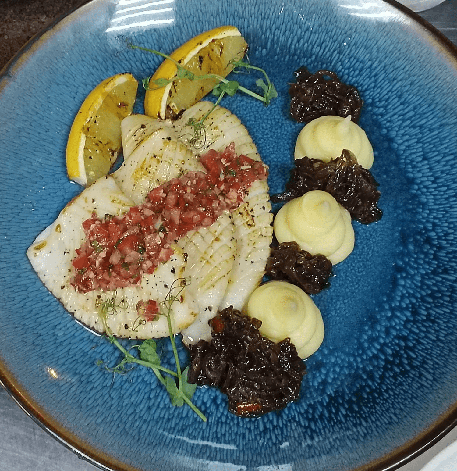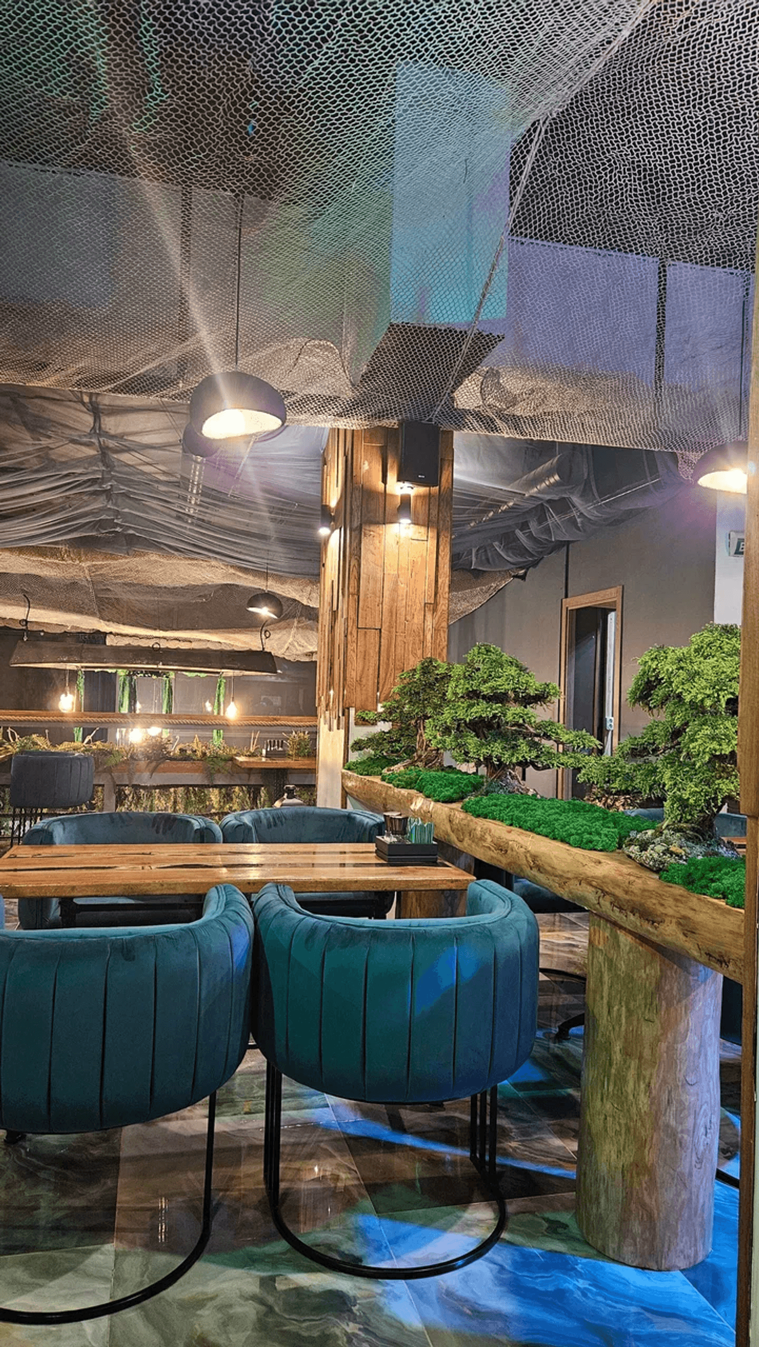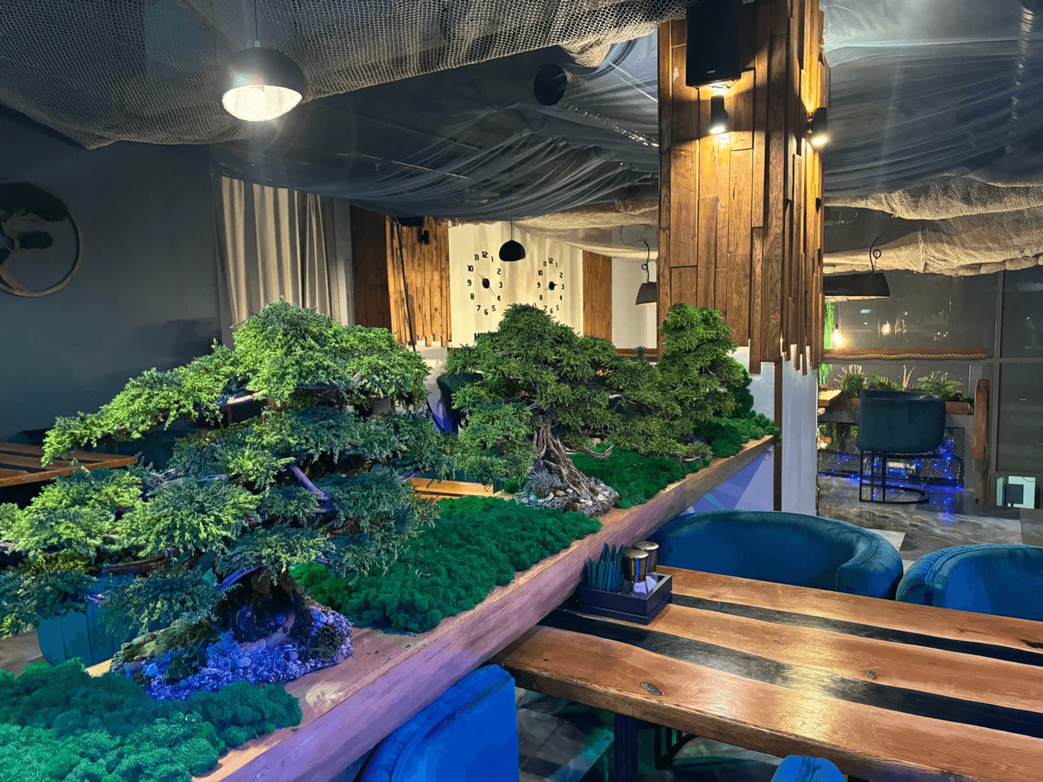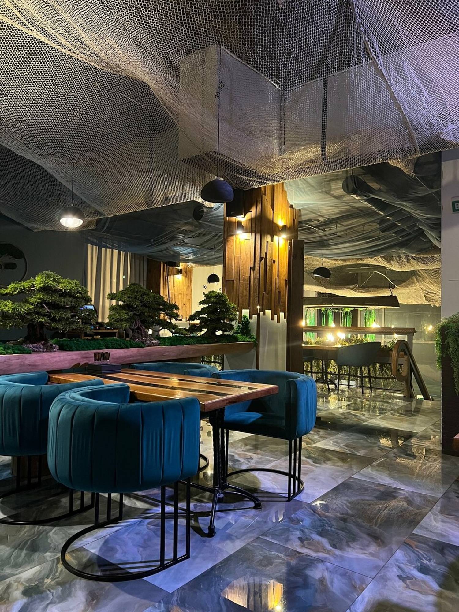 Атмосфера. Интерьер передает красоту и дух Камчатки, Чукотки и Приморья: синие оттенки, натуральное дерево, мох и декоративные элементы создают ощущение дикой природы. Столы отделаны срубами, на стенах — пейзажи Камчатки, а с потолка свисают «водоросли», подчеркивающие морскую тематику.