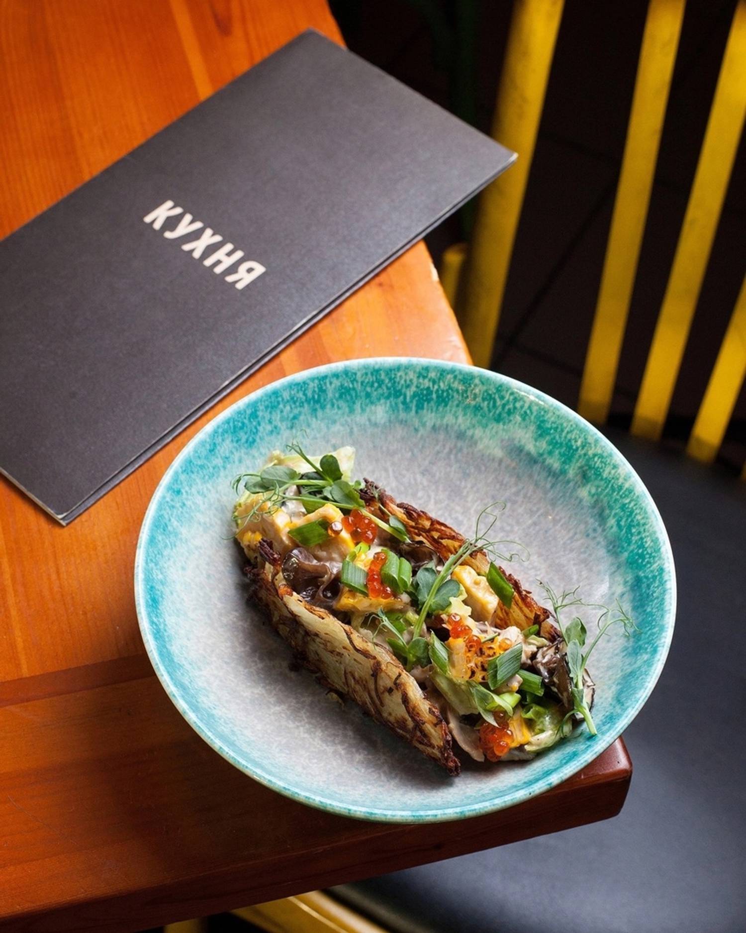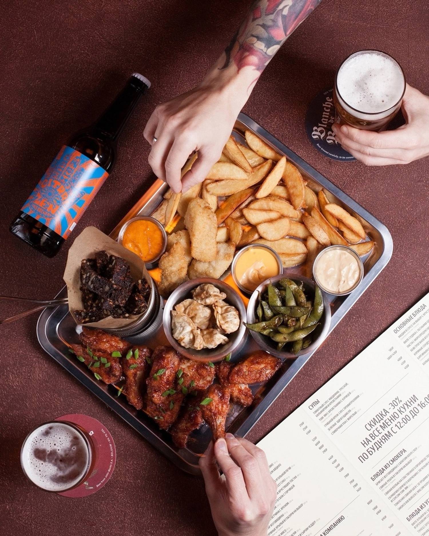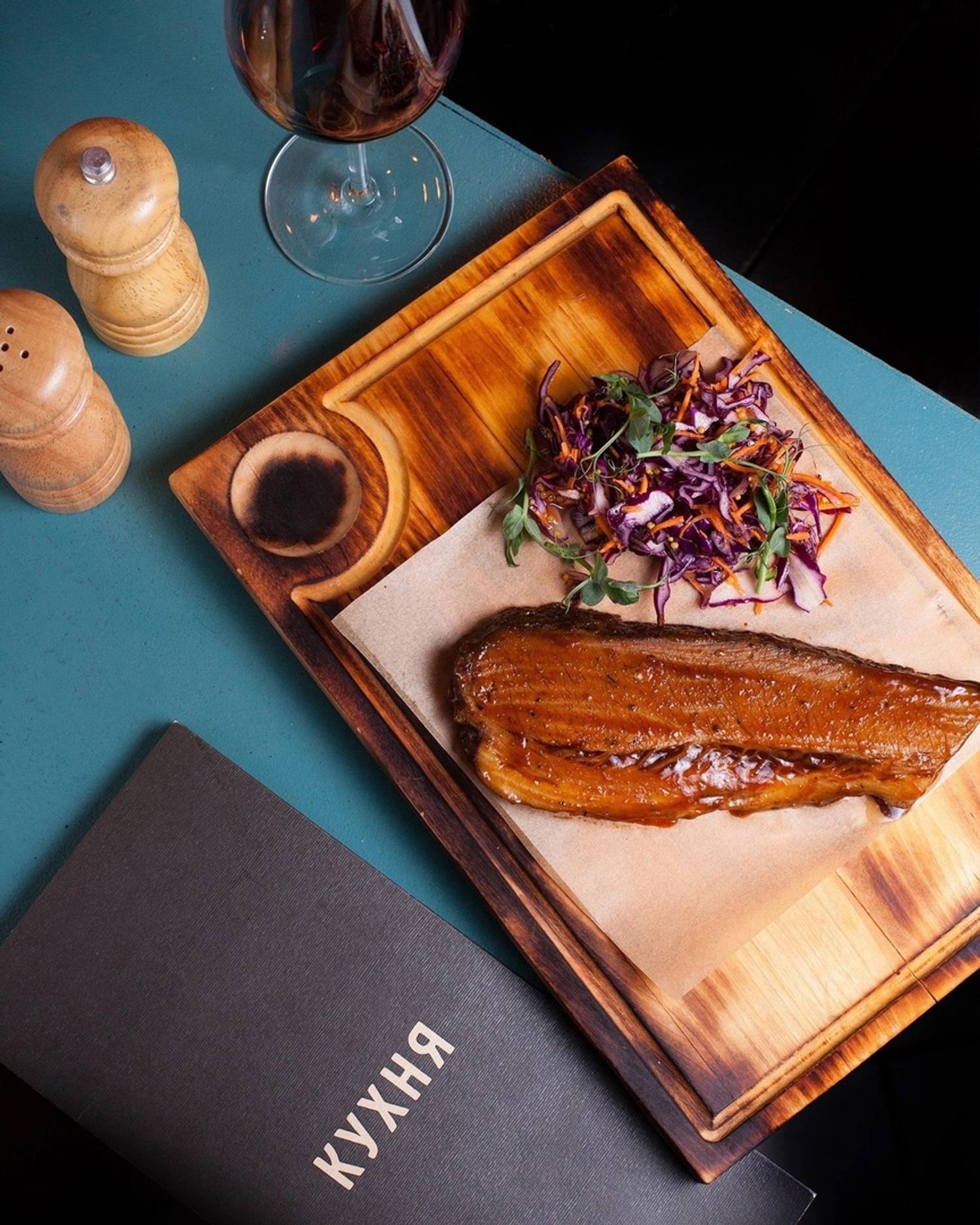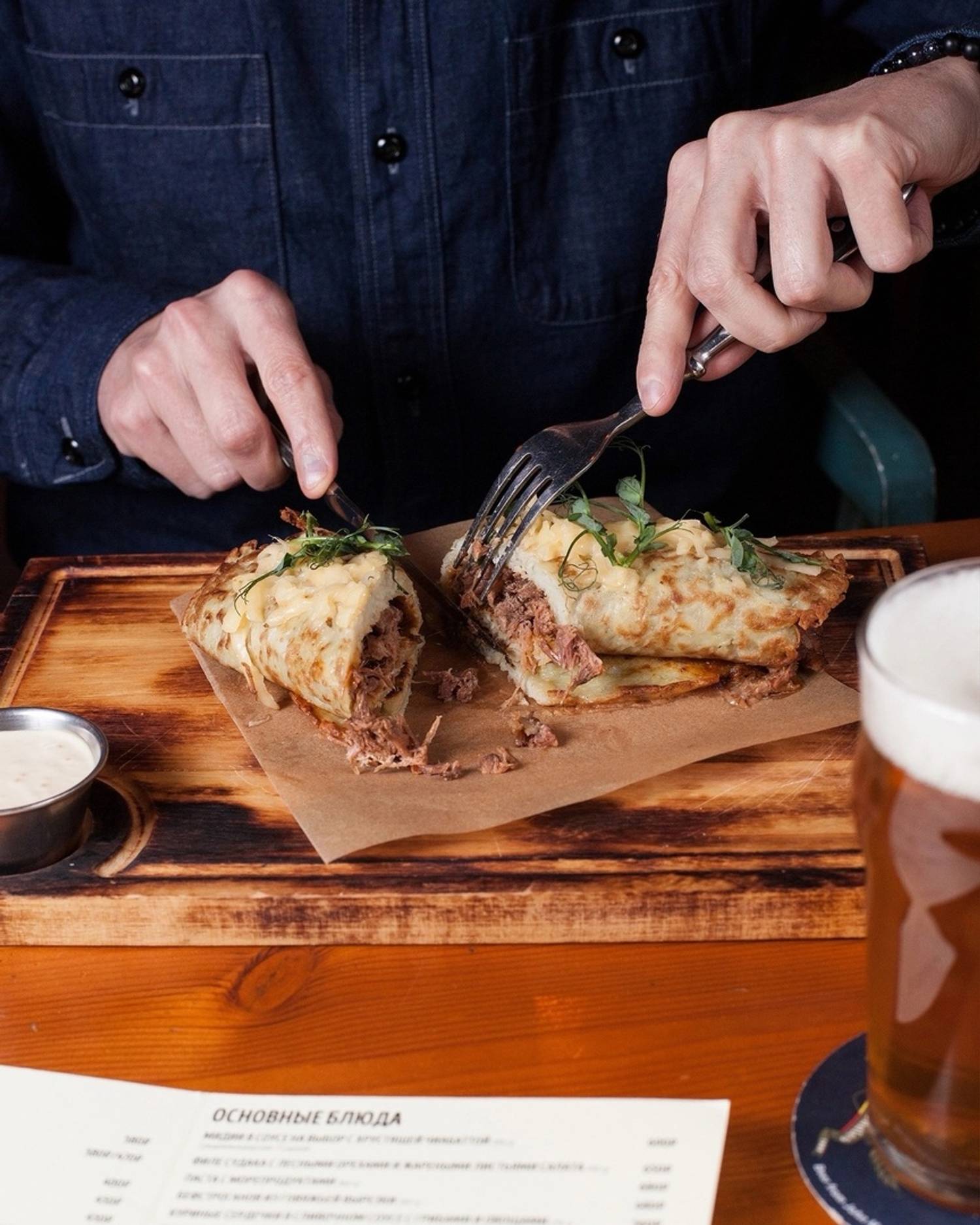 Еда и напитки. В меню — смешанная кухня: от карельской форели и утиной грудки с яблоками фламбез до мидий в грибном соусе и бургера с мраморной говядиной и джемом из брусники и бекона. На десерт тоже необычные сочетания: чизкейк с пивной карамелью и беконом и винная груша джелато горгонзола и ореховыми топпингами.