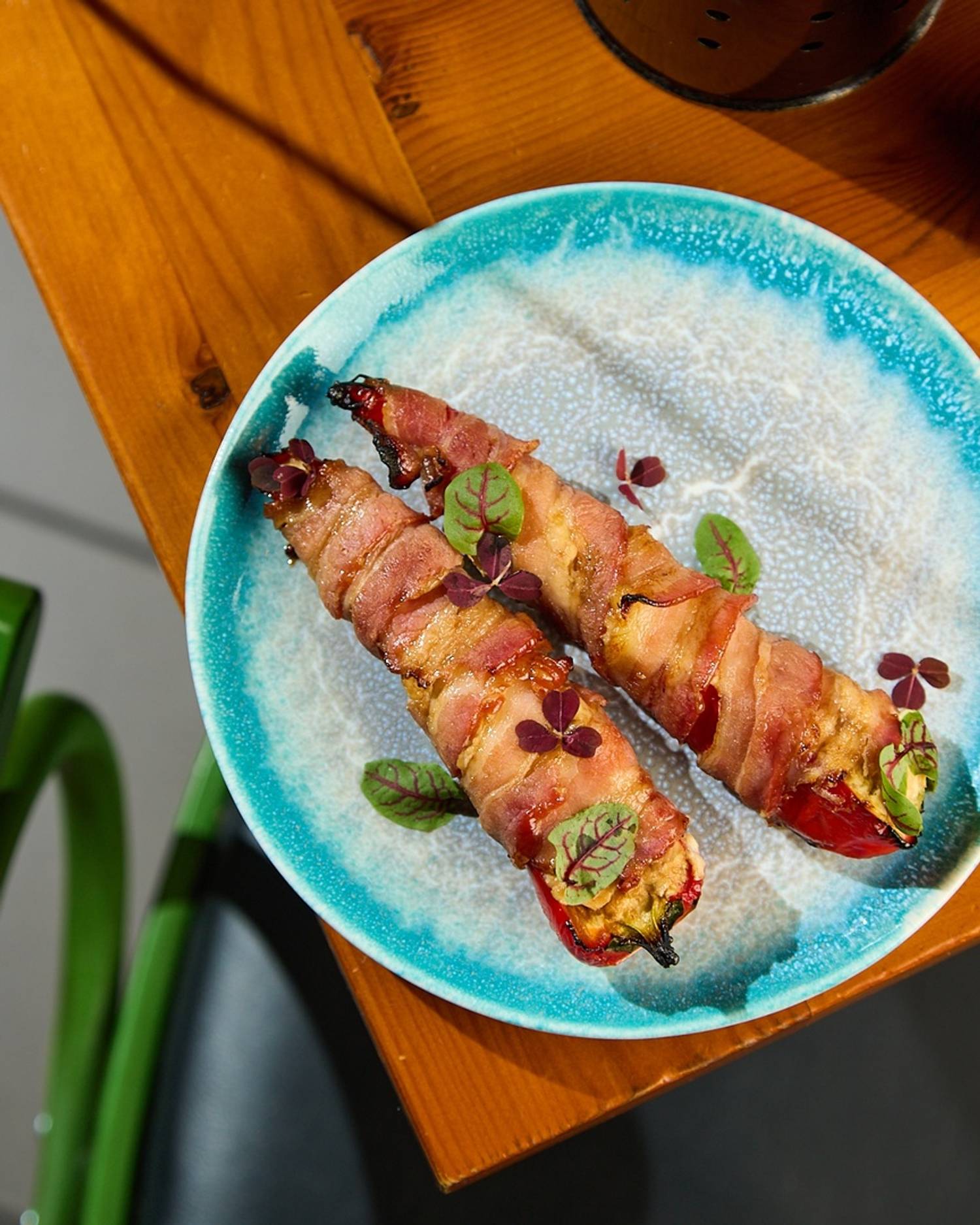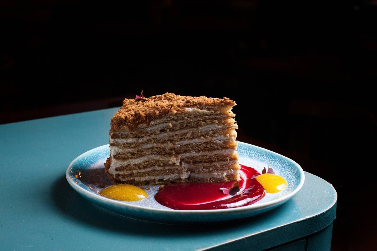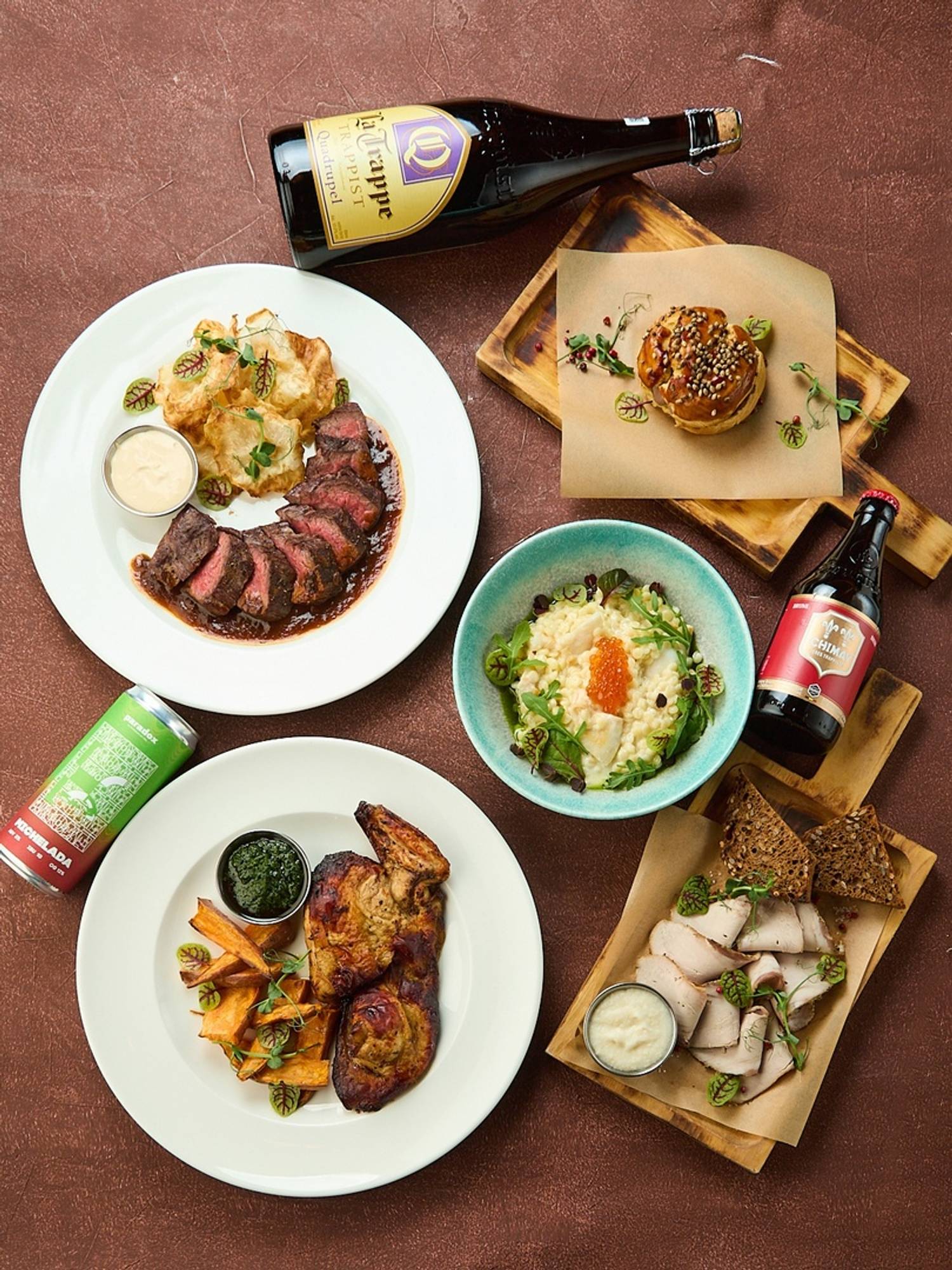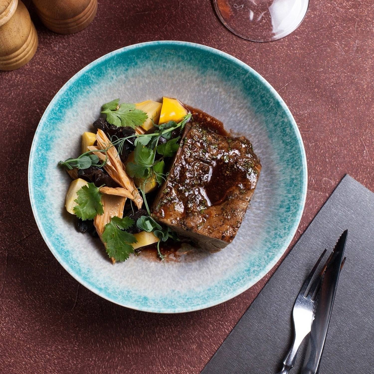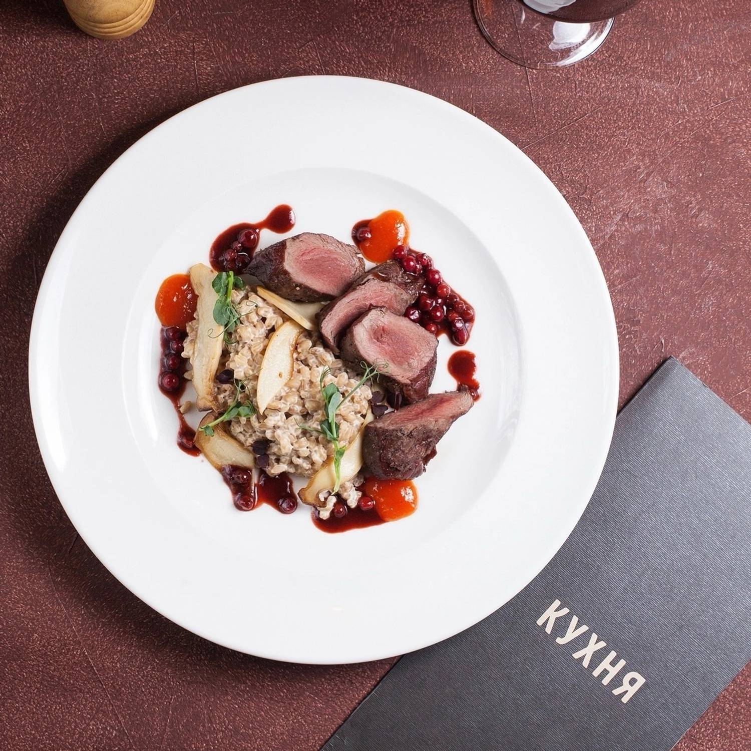 Еда и напитки. В меню — смешанная кухня: от карельской форели и утиной грудки с яблоками фламбез до мидий в грибном соусе и бургера с мраморной говядиной и джемом из брусники и бекона. На десерт тоже необычные сочетания: чизкейк с пивной карамелью и беконом и винная груша джелато горгонзола и ореховыми топпингами.