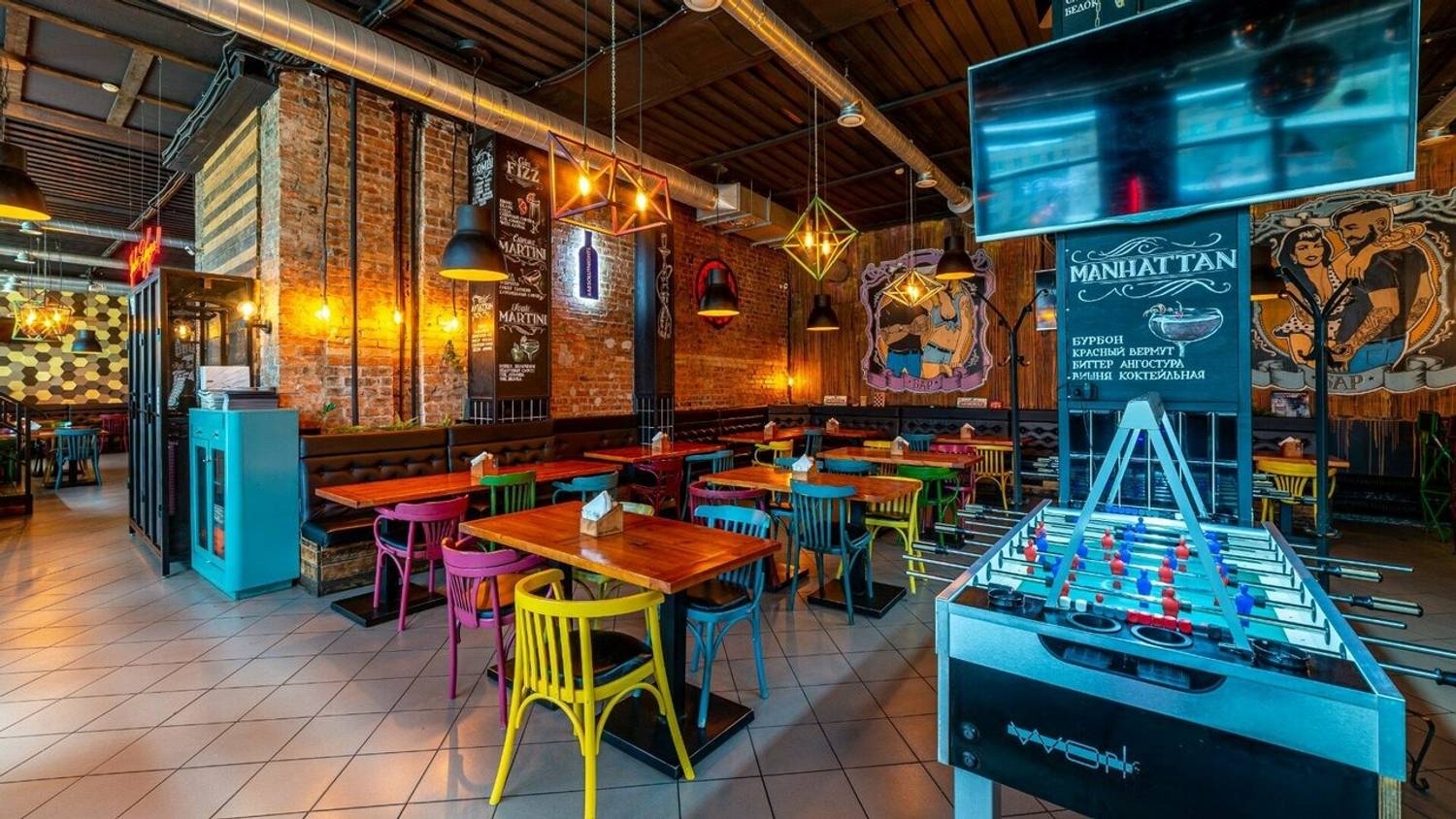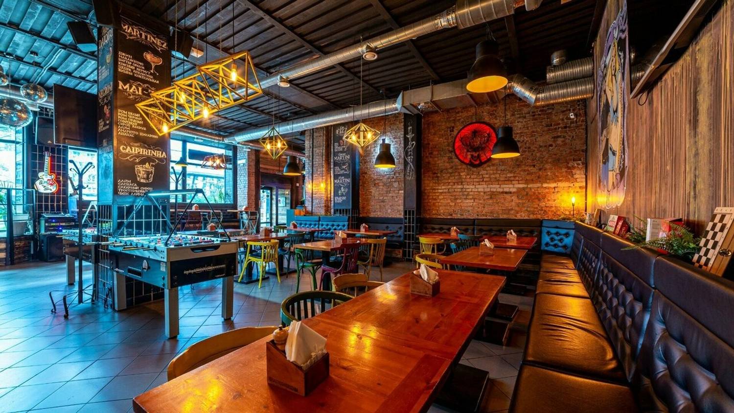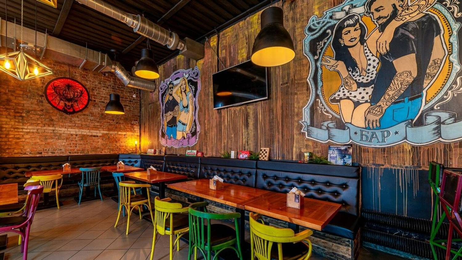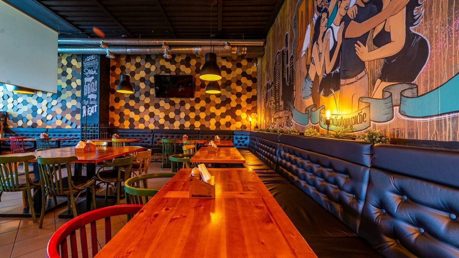 Атмосфера. Здесь два зала в стиле лофт с характерными элементами: красная кирпичная кладка, панорамные окна, яркие граффити и зона с кикером. Внимание гостей привлекает смокер и угольная печь в центре зала — именно в ней и готовят мясные и рыбные блюда для гостей.