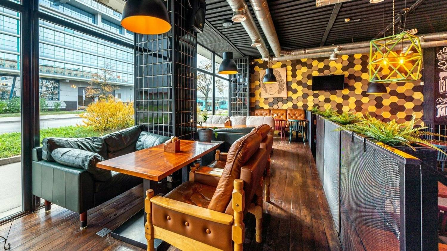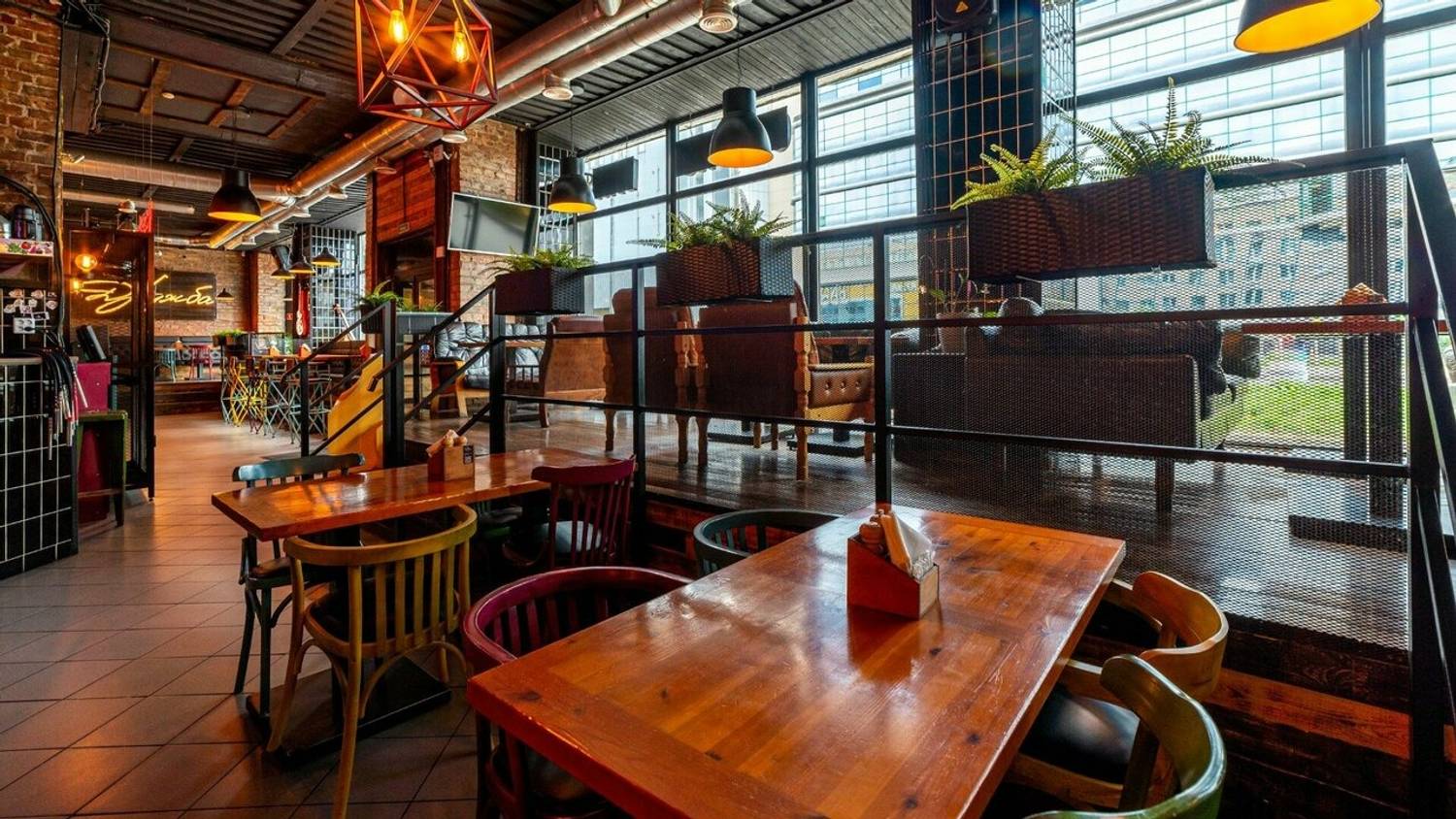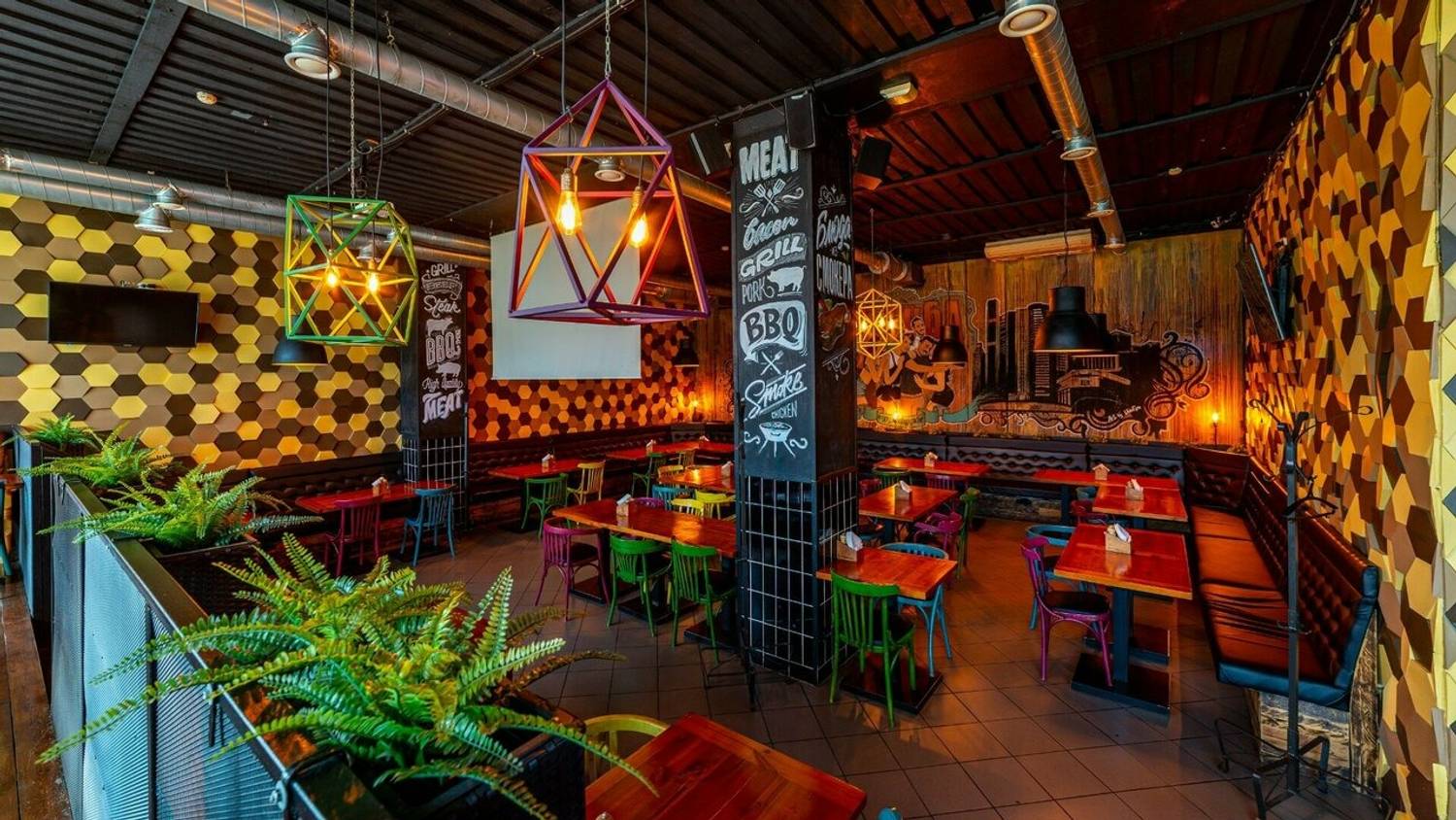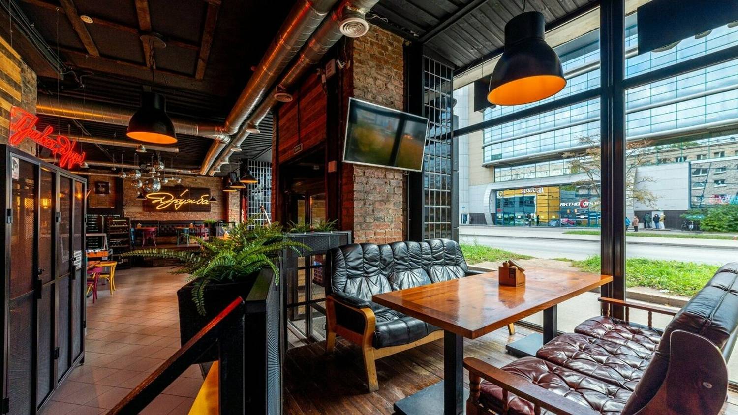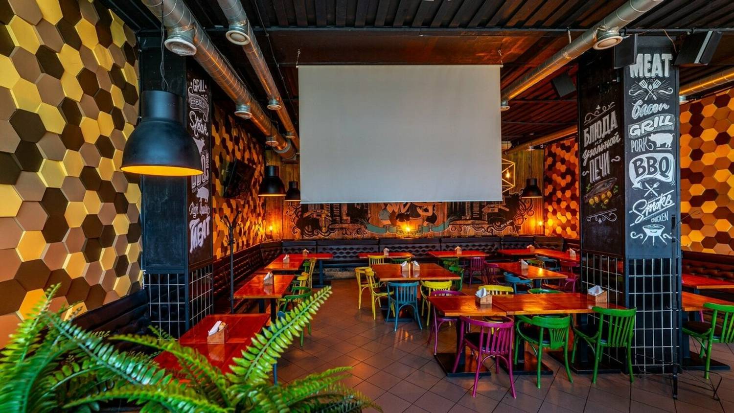 Атмосфера. Здесь два зала в стиле лофт с характерными элементами: красная кирпичная кладка, панорамные окна, яркие граффити и зона с кикером. Внимание гостей привлекает смокер и угольная печь в центре зала — именно в ней и готовят мясные и рыбные блюда для гостей.