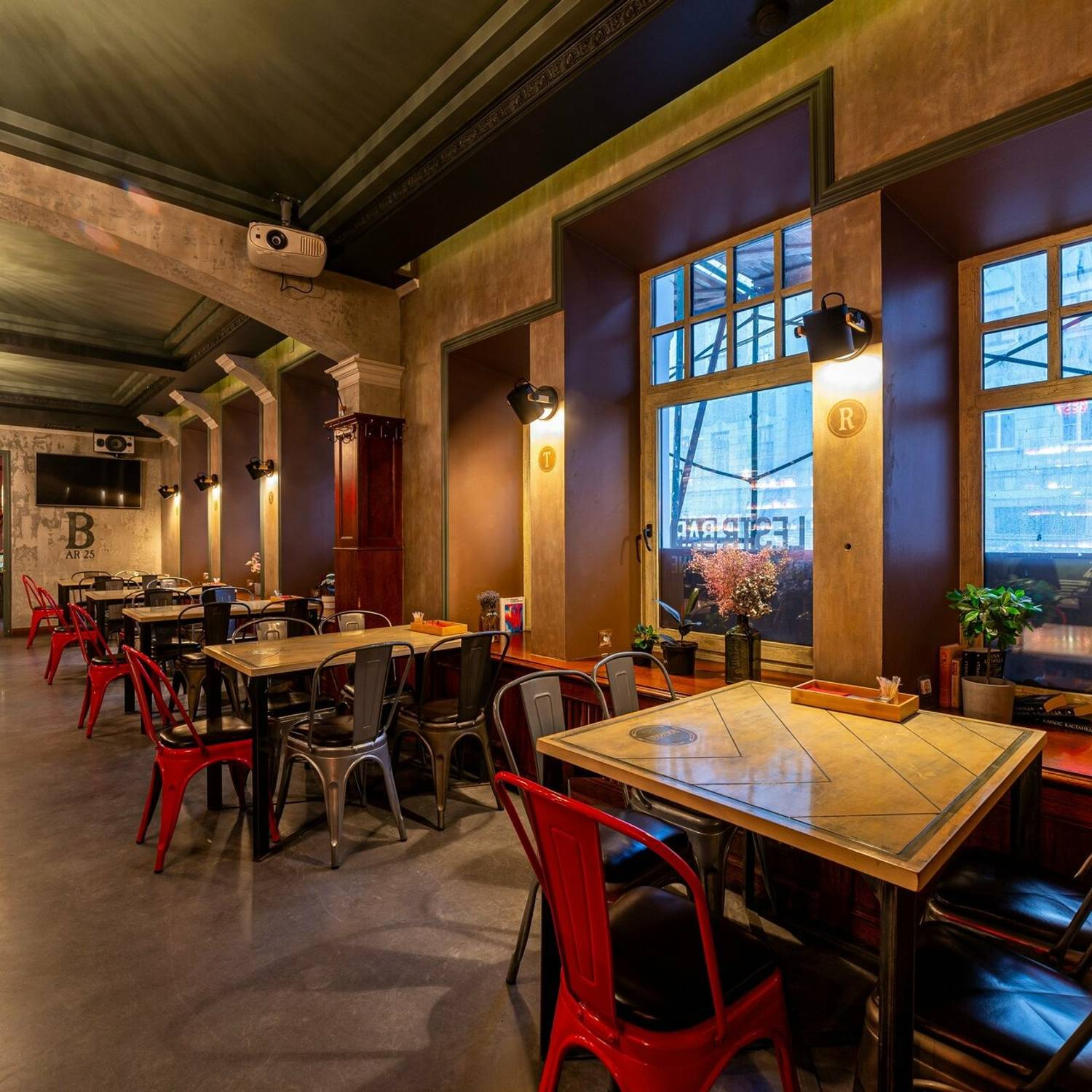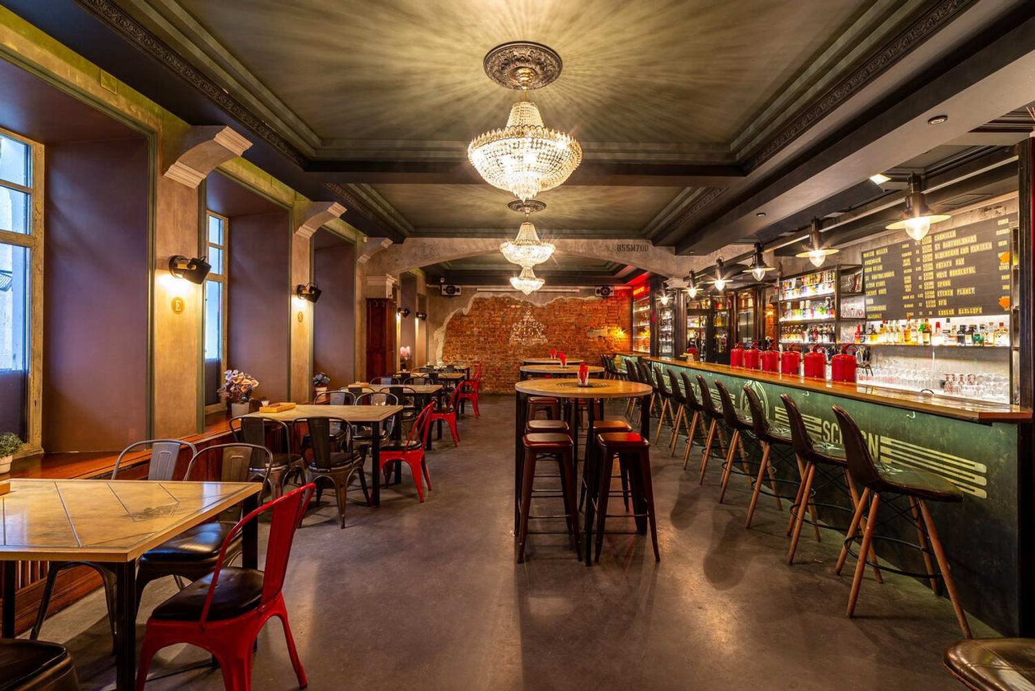 Атмосфера. Пространство с кирпичными стенами, бетонными поверхностями и деревянными элементами. Винтажные хрустальные люстры, многоуровневые столы и барная стойка дополняют интерьер. Главная техническая особенность — колдрум, благодаря которому пиво хранится в нужных условиях пива.