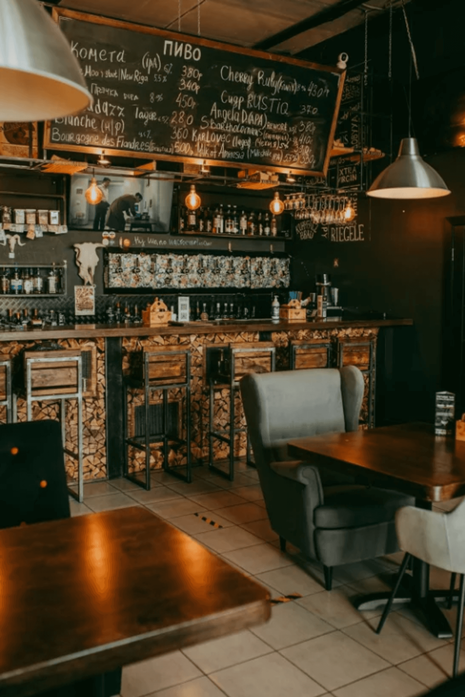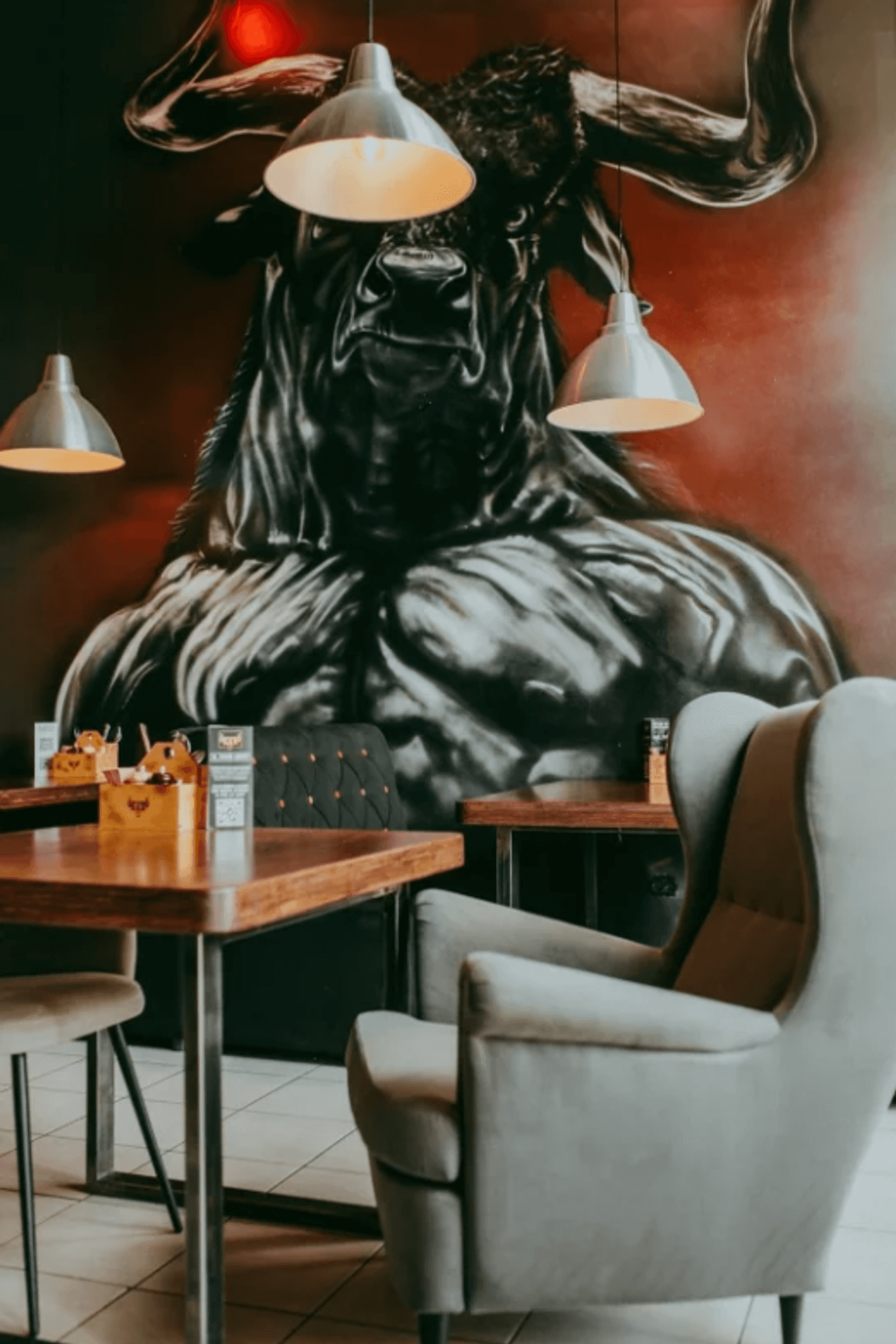 Атмосфера. Интерьер с индустриальными светильниками и деревянными спилами на стенах создает расслабленную атмосферу. Граффити с головой быка задает динамичное настроение. В баре транслируют спортивные матчи, а по выходным проходят живые выступления.