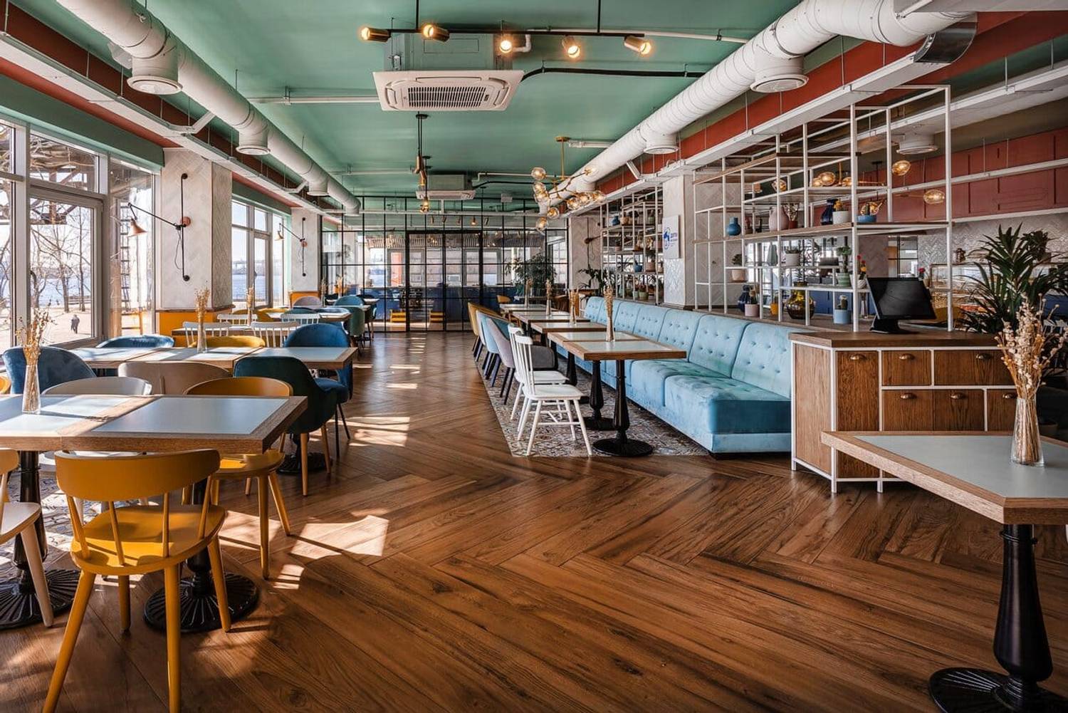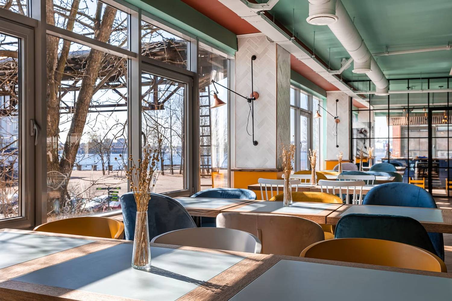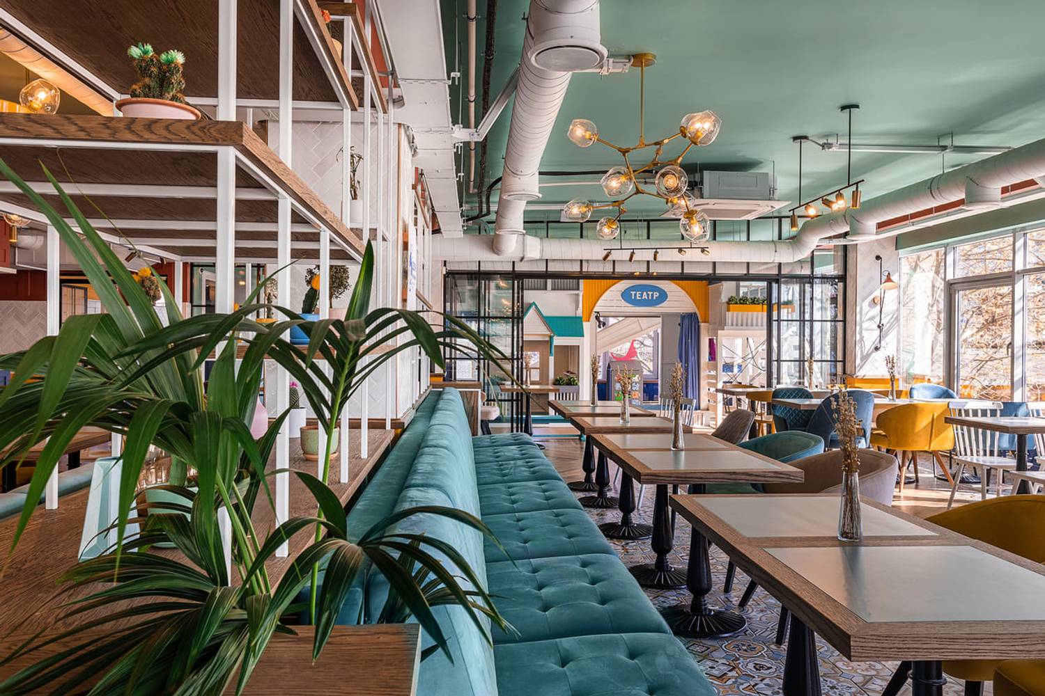 Атмосфера. Светлый зал с панорамными окнами и яркой мебелью напоминает домашнюю кухню, где собирается вся семья. Рядом с обеденной зоной расположен игровой городок с профессиональной няней, а за стеклянными перегородками проходят кулинарные мастер-классы для детей. Пространство ориентировано на одновременный отдых детей и родителей: первые могут играть, пока вторые отдыхают и наслаждаются едой.