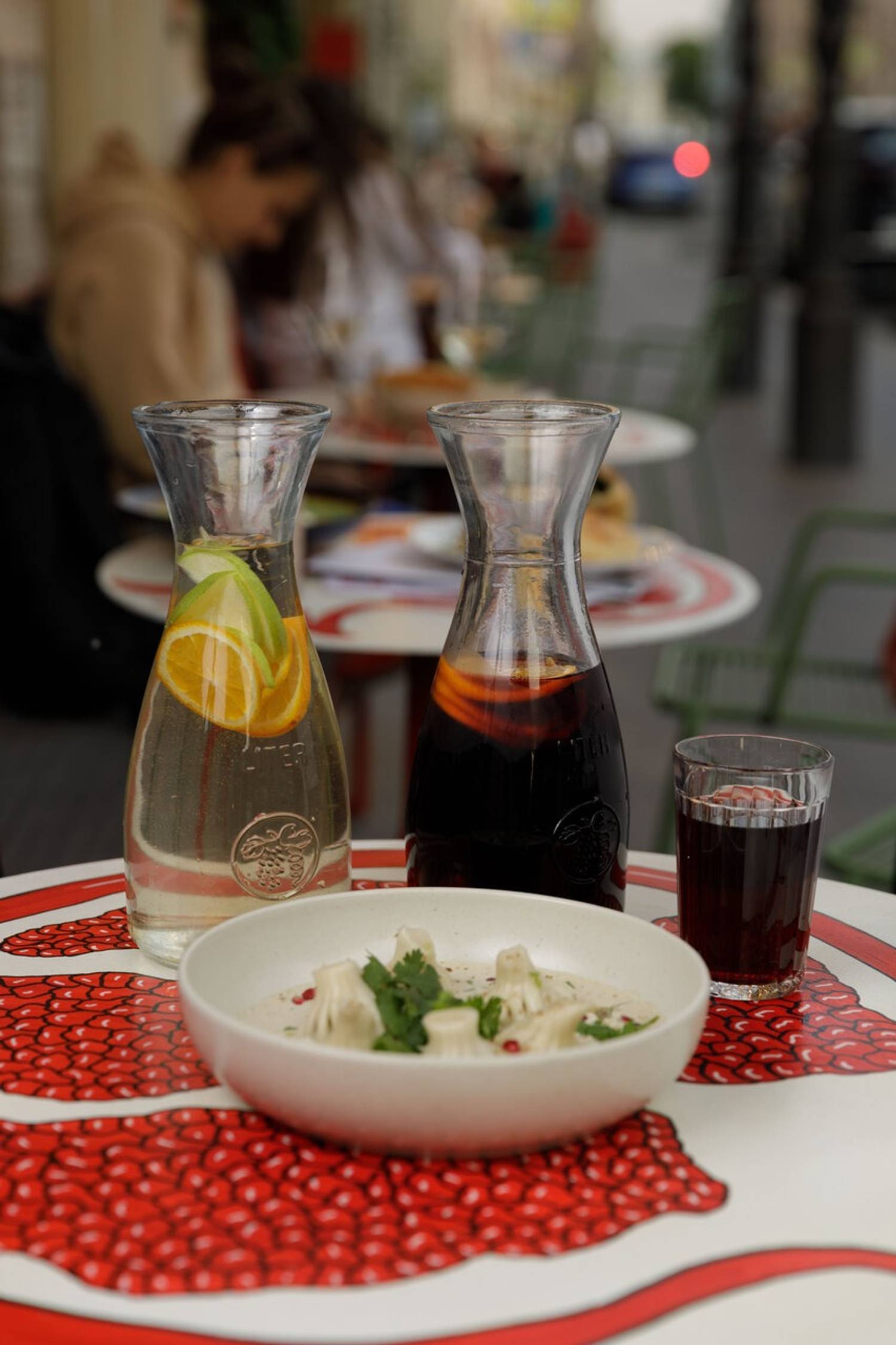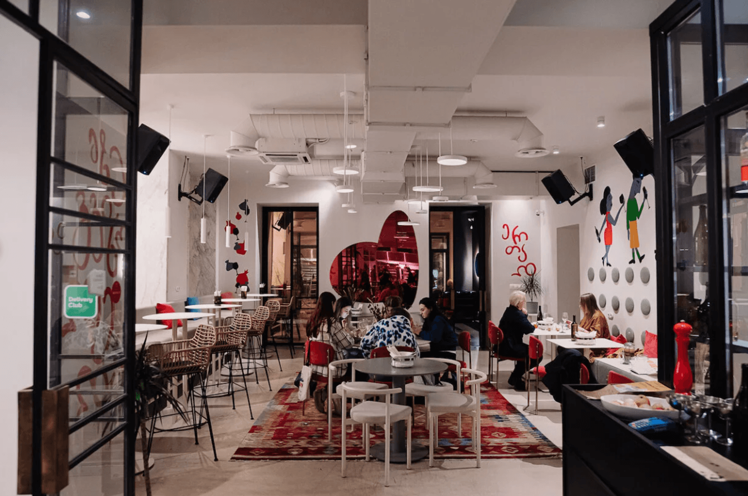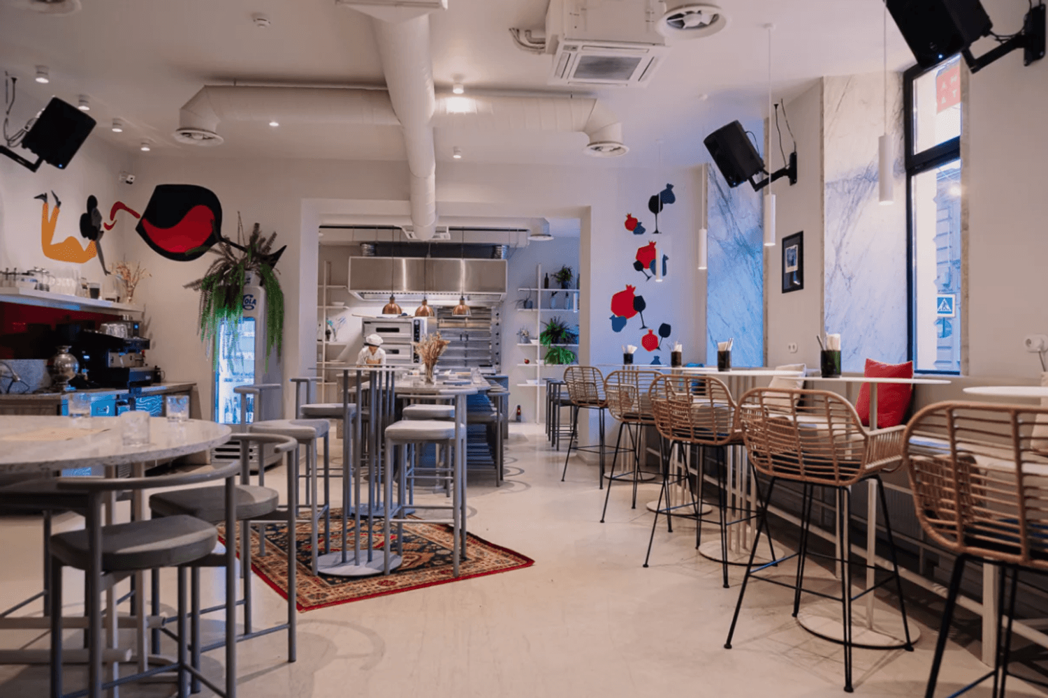 Атмосфера. Минималистичный дизайн с авторской росписью на стенах, изображением женщины с бокалом вина. Традиционные красные ковры с орнаментом, плетёные стулья и круглые зеркала с подсветкой добавляют уюта и связывают интерьер с грузинскими корнями.