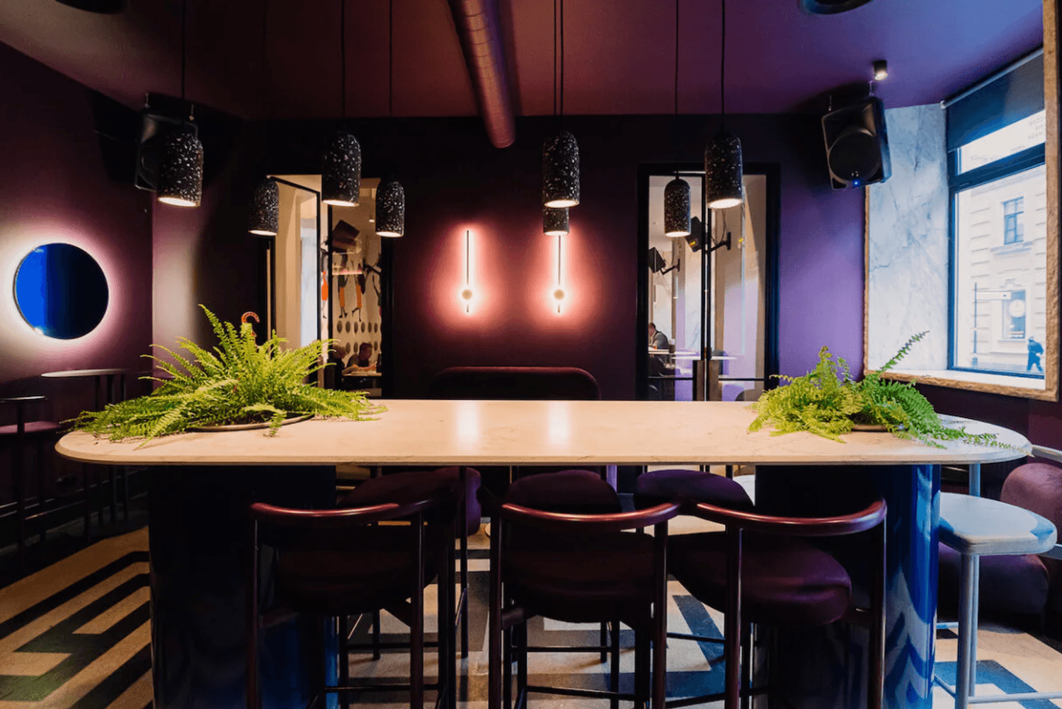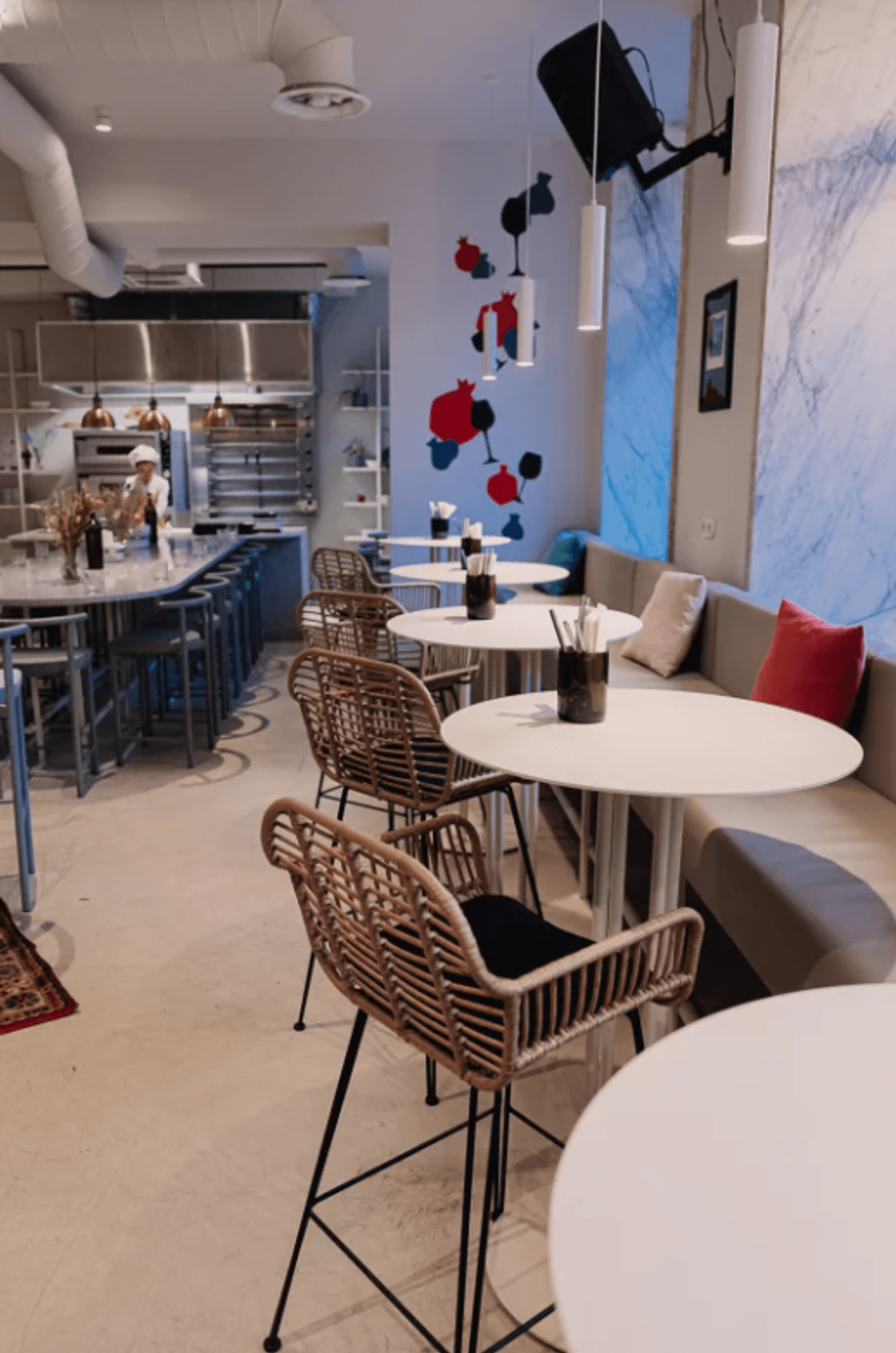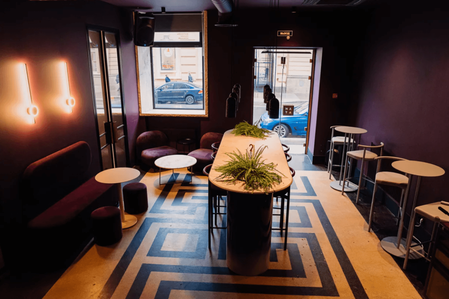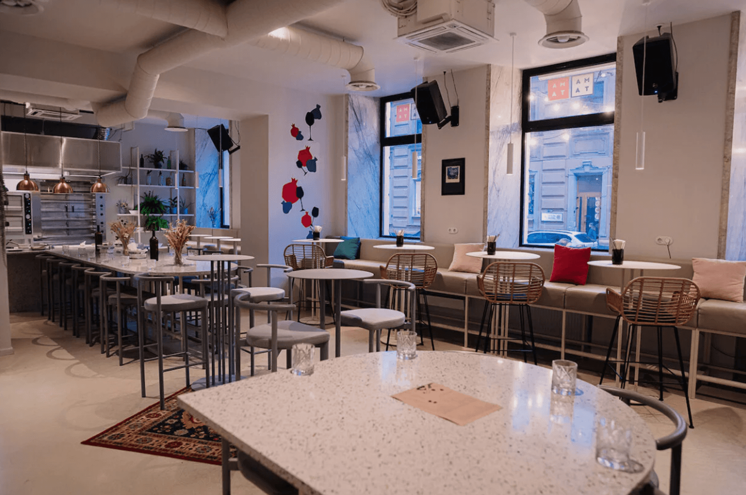 Атмосфера. Минималистичный дизайн с авторской росписью на стенах, изображением женщины с бокалом вина. Традиционные красные ковры с орнаментом, плетёные стулья и круглые зеркала с подсветкой добавляют уюта и связывают интерьер с грузинскими корнями.