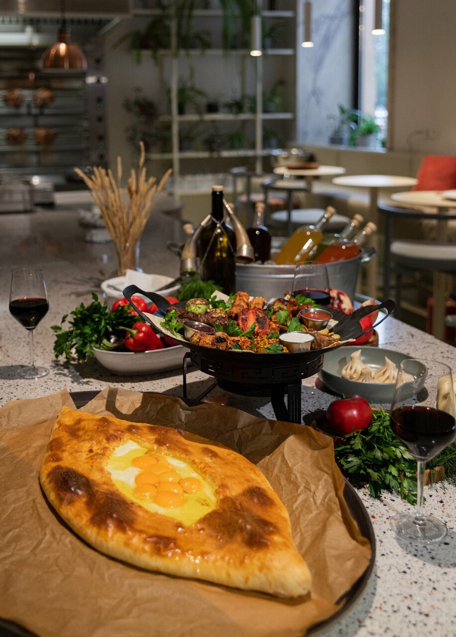 Еда и напитки. В меню — хачапури по-мегрельски с томатами, свиная отбивная по-грузински, чахохбили из цыпленка, хашлама с рваной говядиной. На десерт готовят хворост с Казбеги и батонские развалины.