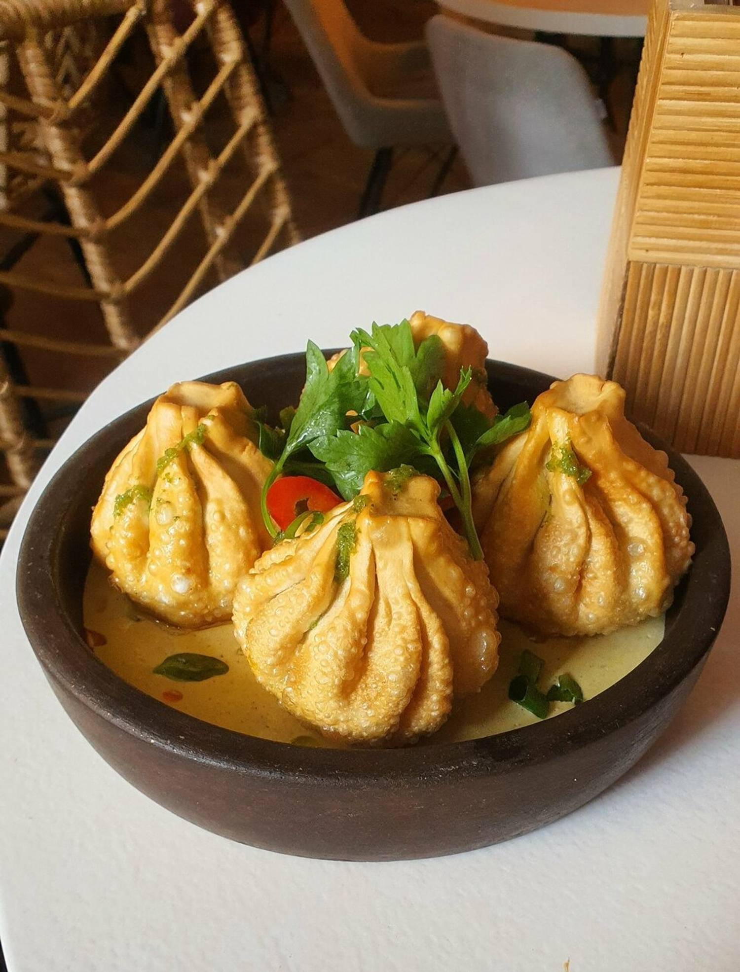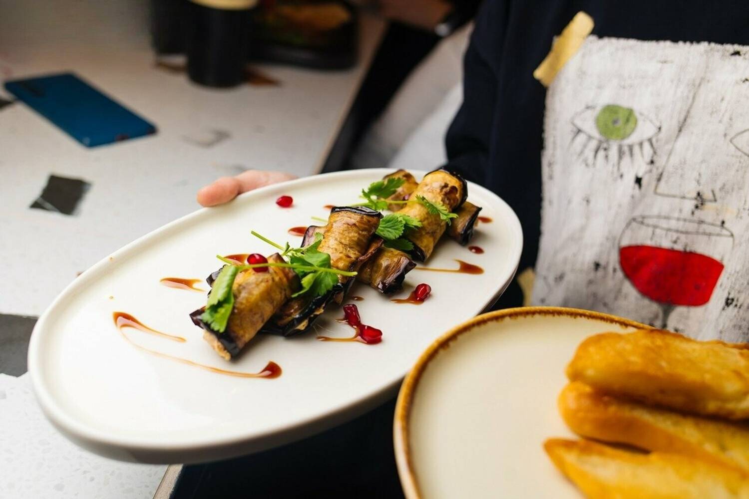 Еда и напитки. В меню — сациви с цыпленком, чебурек с сулугуни и белым соусом, оджахури со свининой и томатами. На десерт заказывают хворост с Казбеги и батонские развалины.