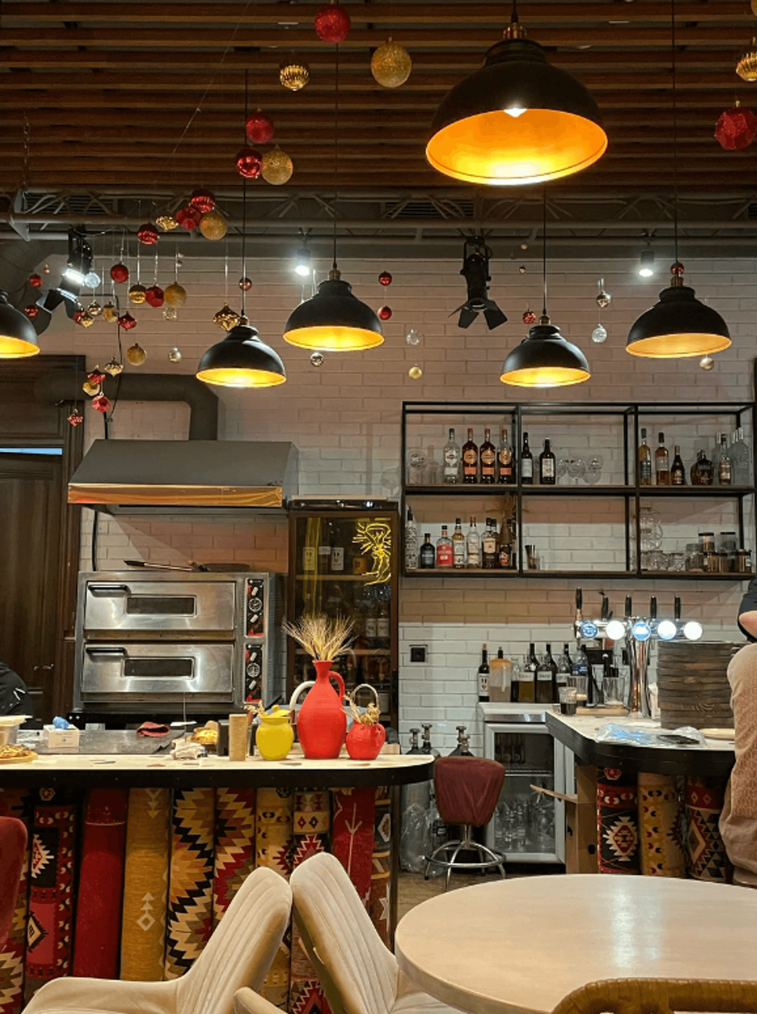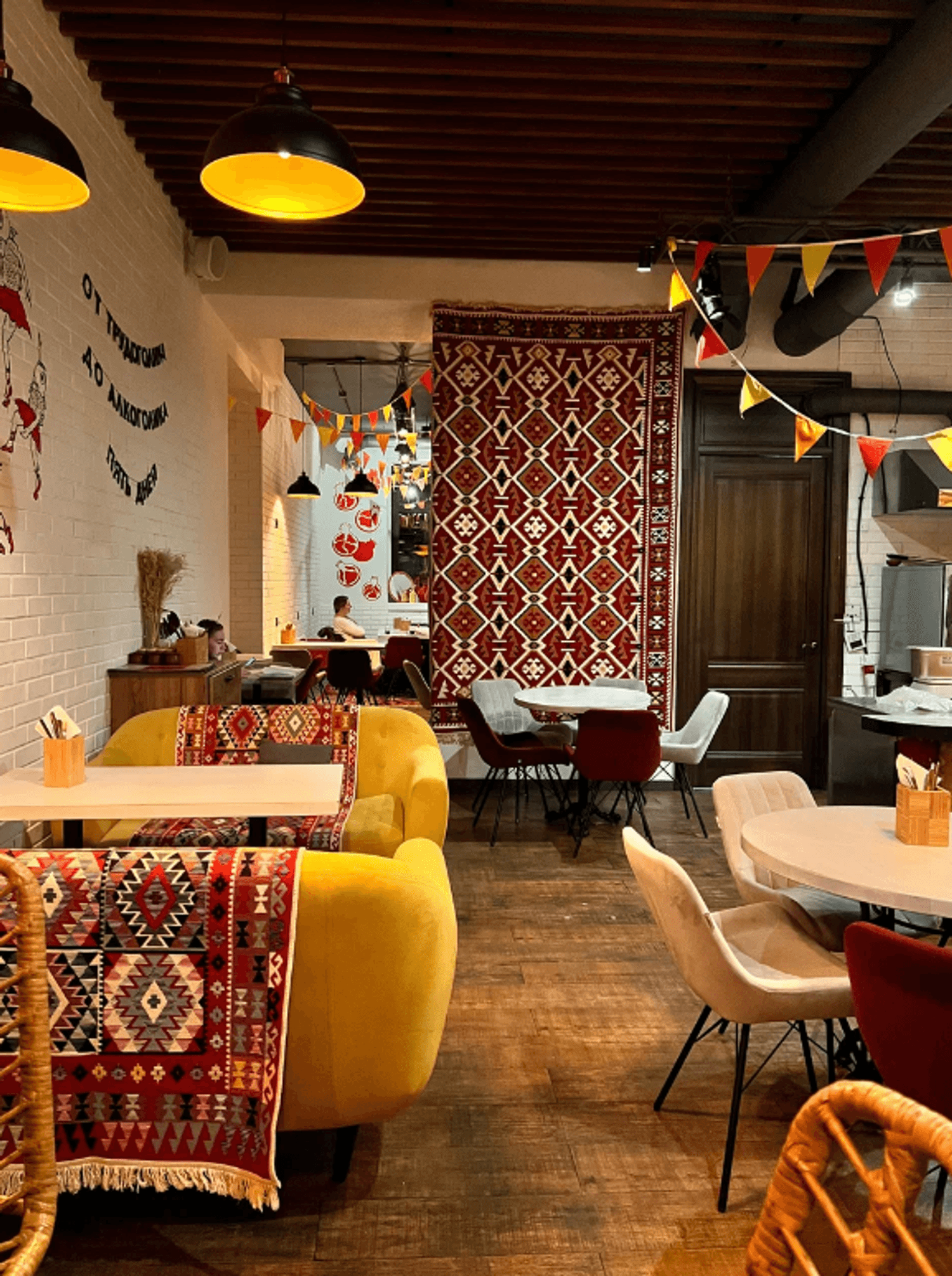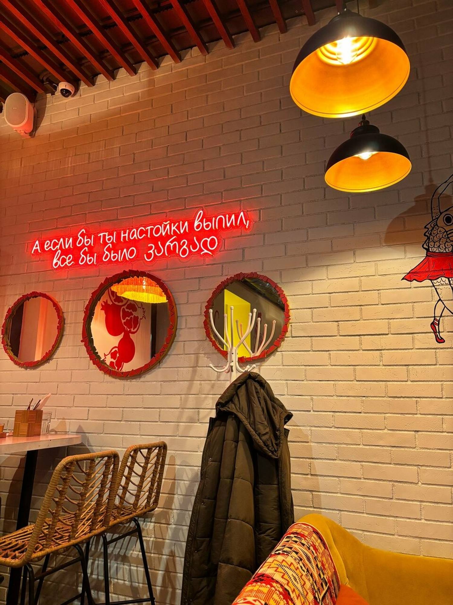 Атмосфера. Интерьер здесь строится на диалоге минимализма и грузинского колорита: красные ковры с орнаментом, свисающие с потолка разноцветные флажки и настенная роспись с гранатами. Ковров настолько много, что барную стойку тоже оформили с их использованием.
