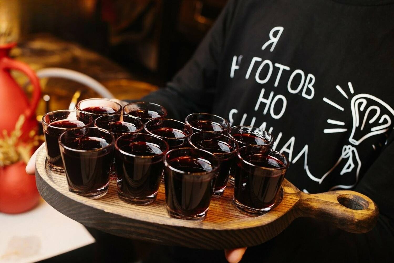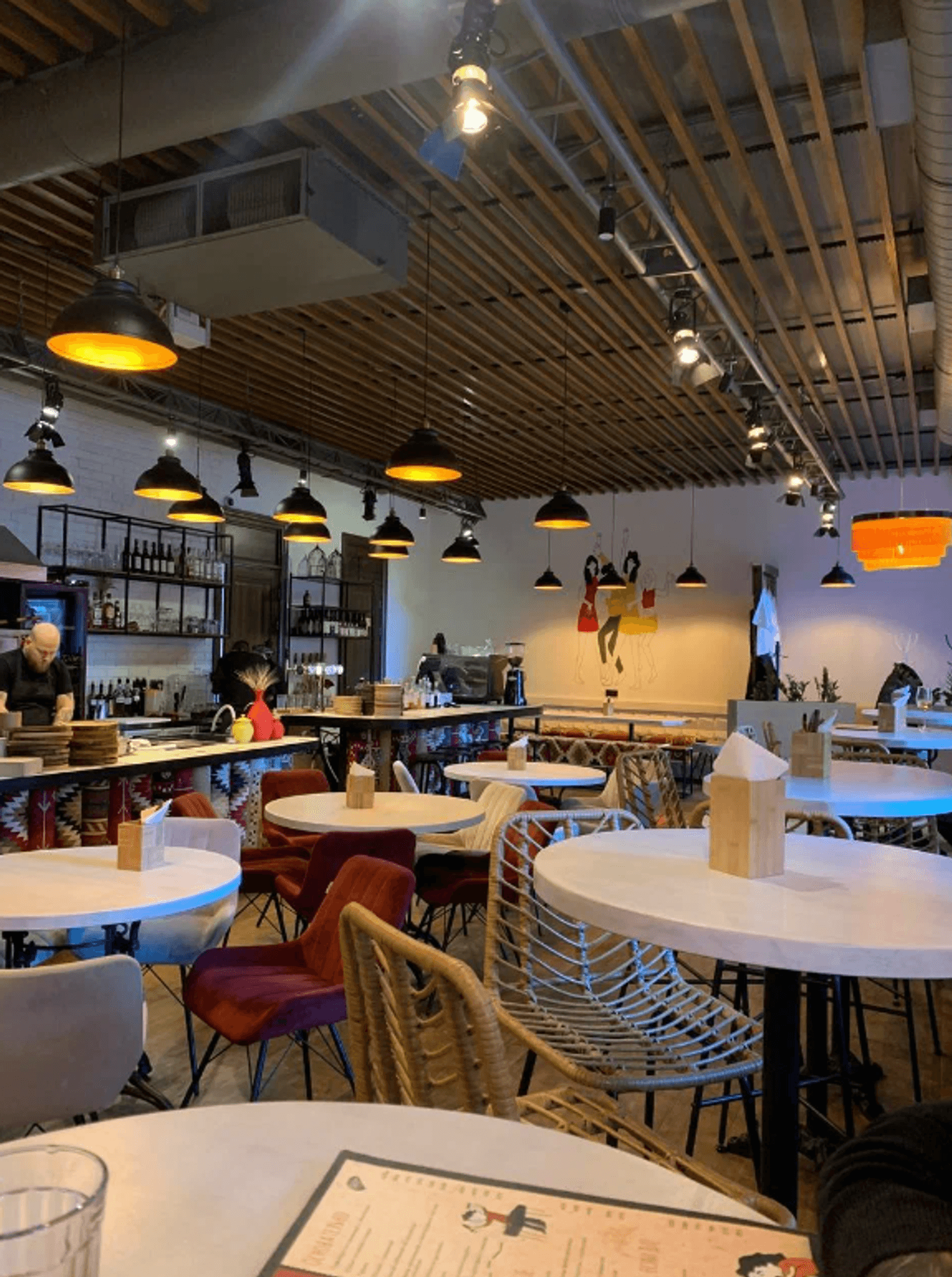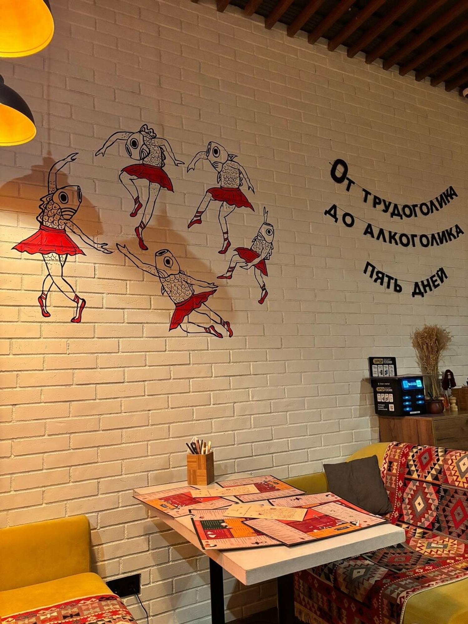 Атмосфера. Интерьер здесь строится на диалоге минимализма и грузинского колорита: красные ковры с орнаментом, свисающие с потолка разноцветные флажки и настенная роспись с гранатами. Ковров настолько много, что барную стойку тоже оформили с их использованием.