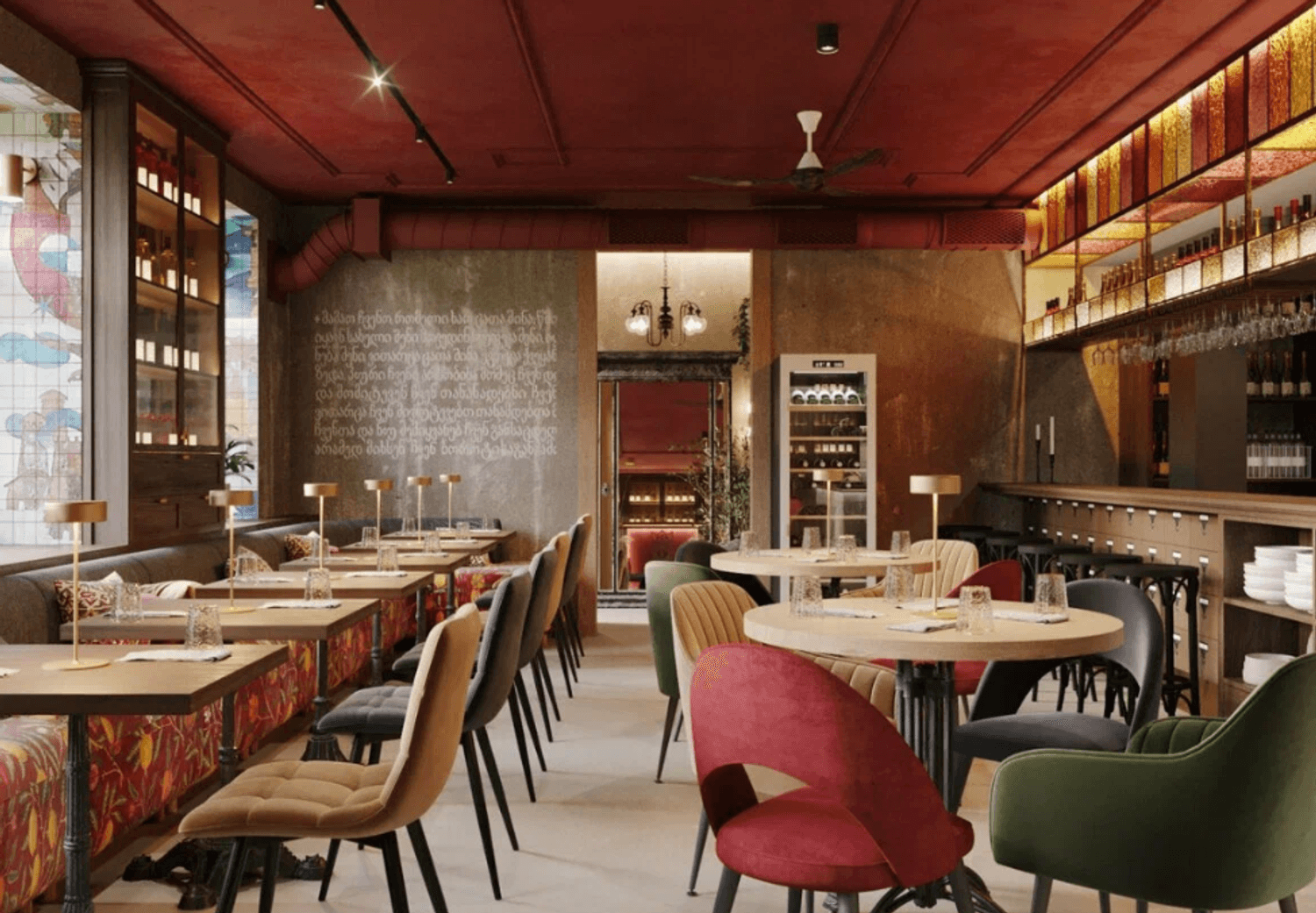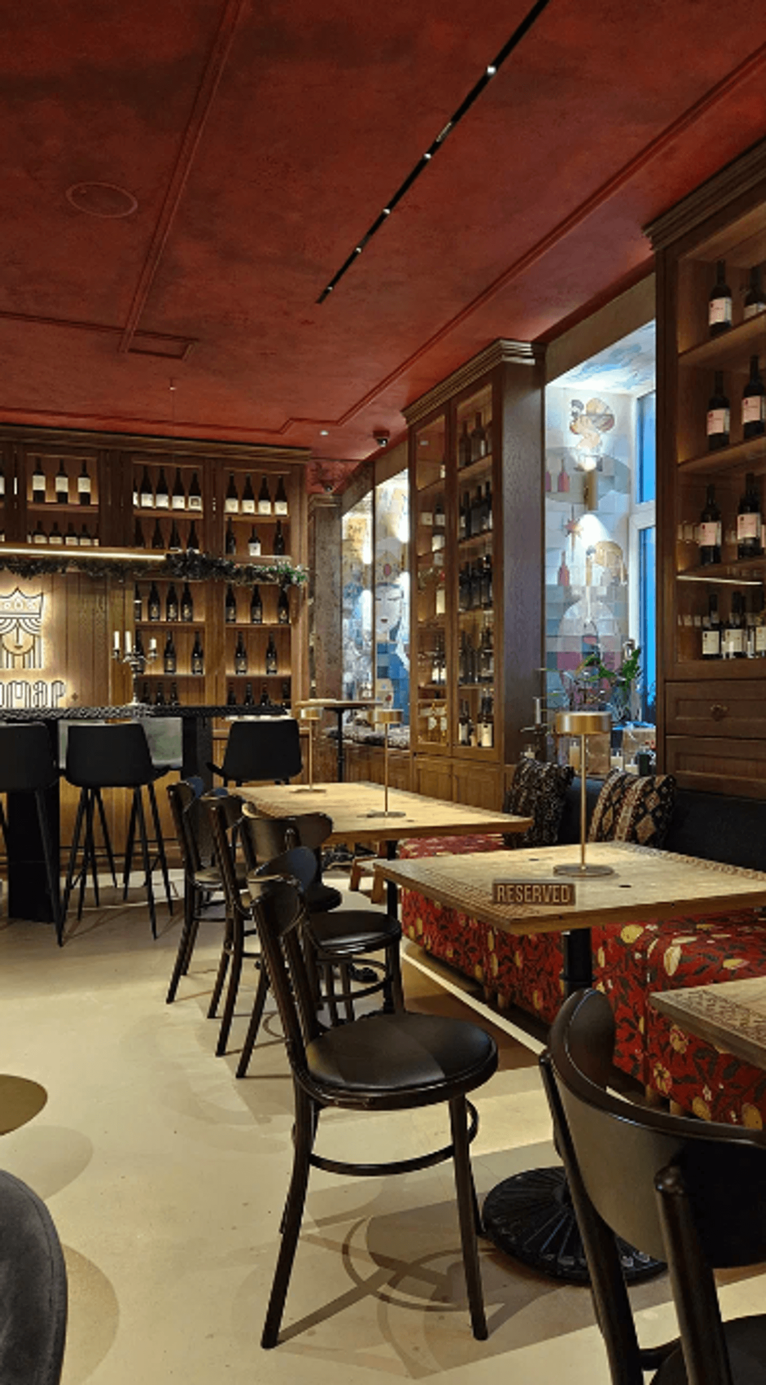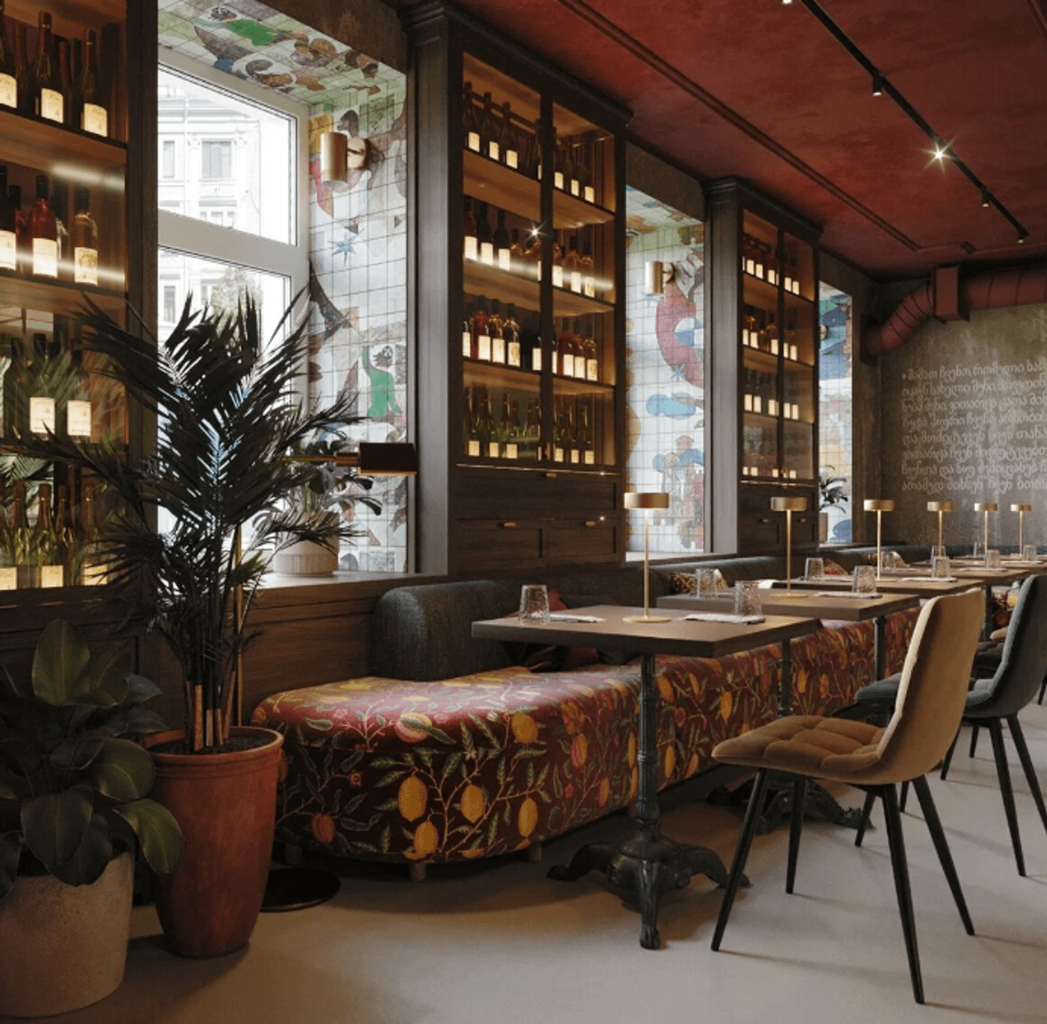 Атмосфера. Яркий интерьер с бордовыми акцентами, высокими шкафами с вином, живыми растениями и панорамными окнами создает ощущение солнечной Грузии. Пространство разделено на три зала с мягкими диванами и расписными коврами.