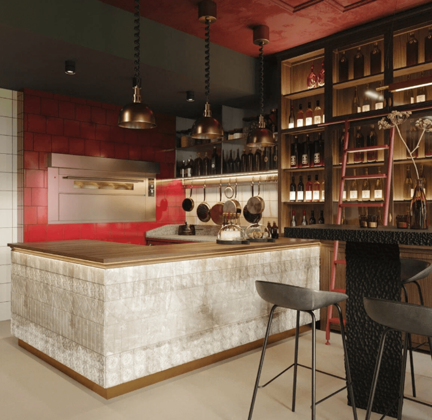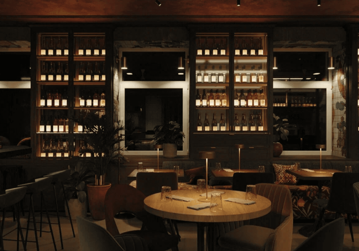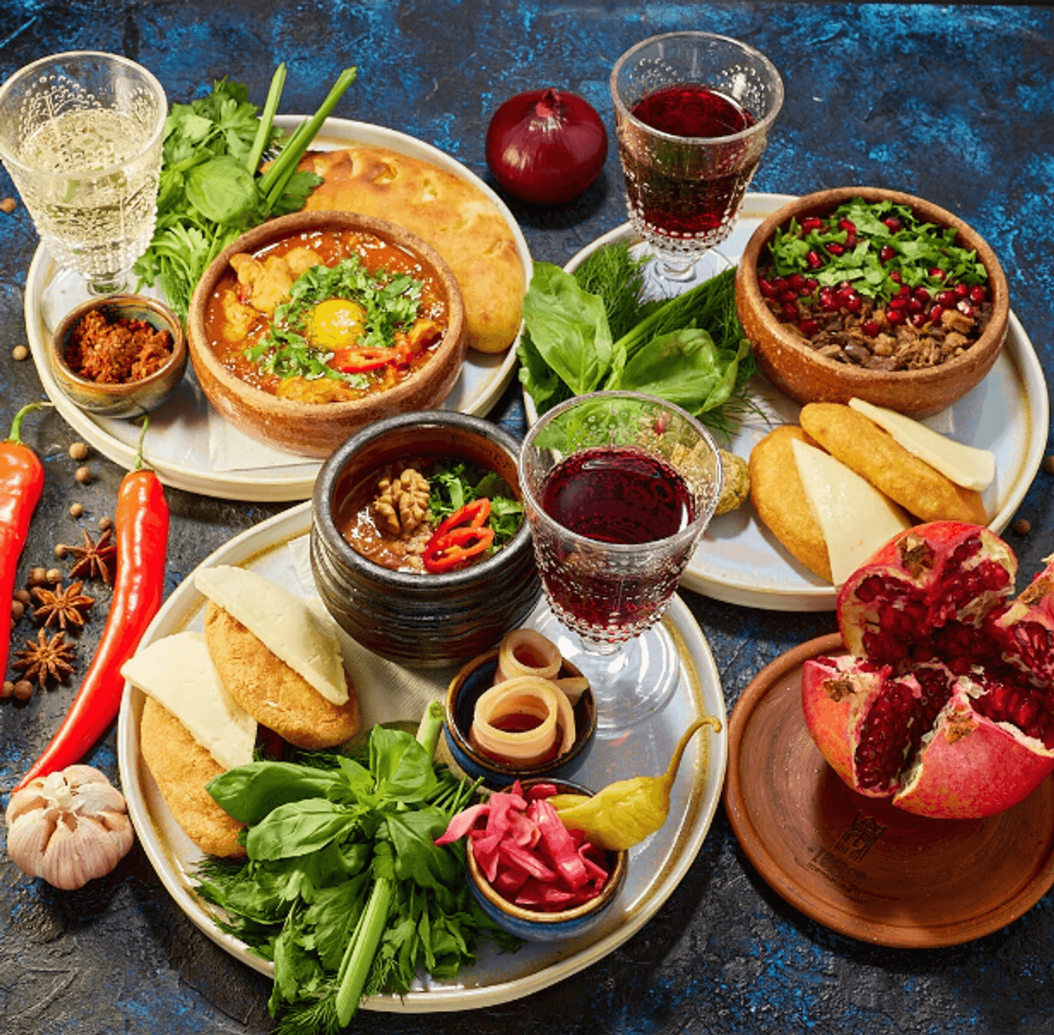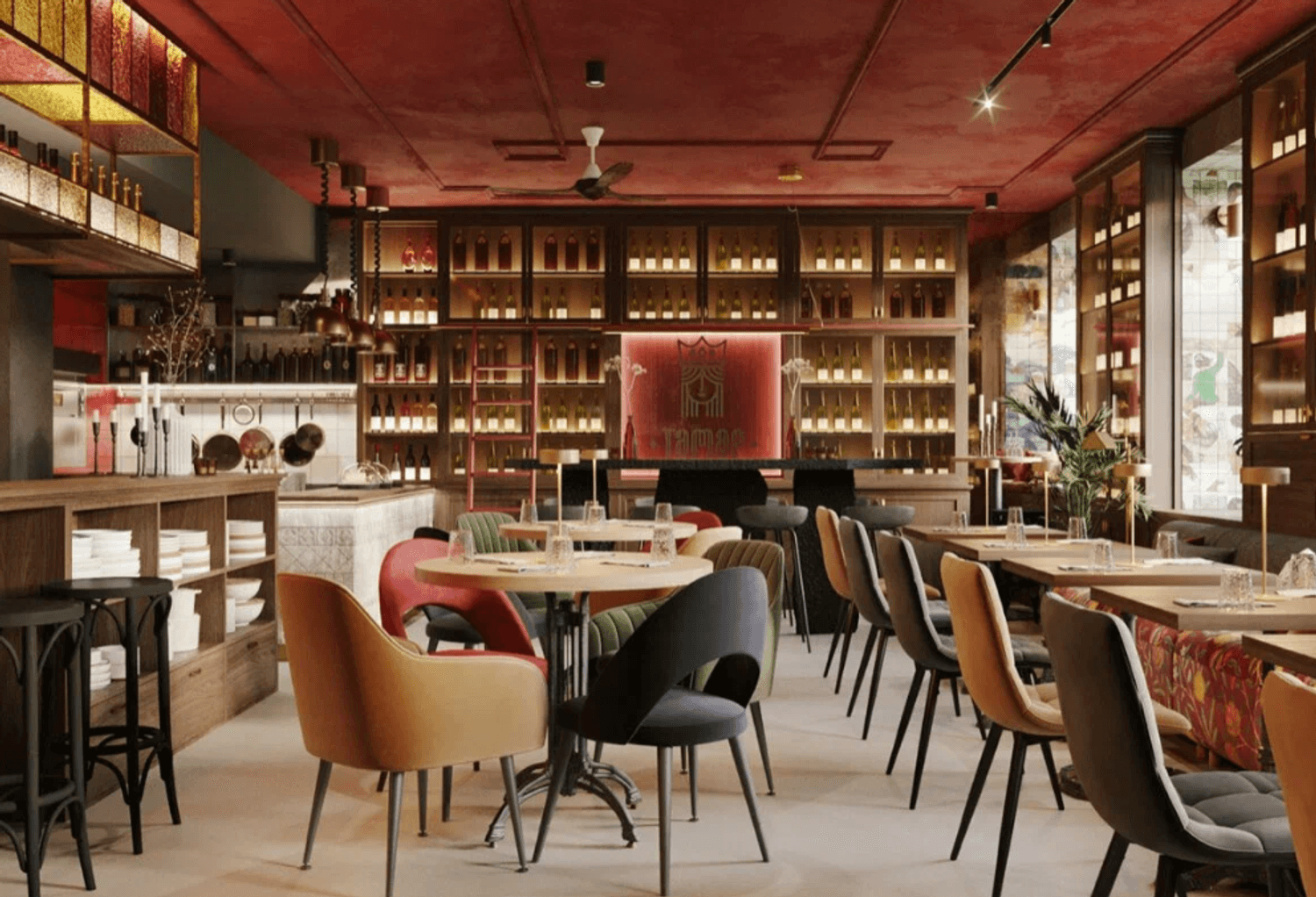 Атмосфера. Яркий интерьер с бордовыми акцентами, высокими шкафами с вином, живыми растениями и панорамными окнами создает ощущение солнечной Грузии. Пространство разделено на три зала с мягкими диванами и расписными коврами.