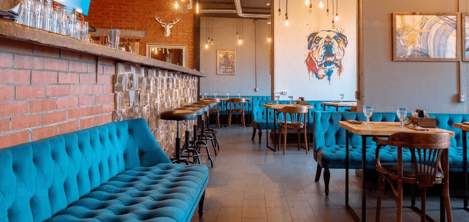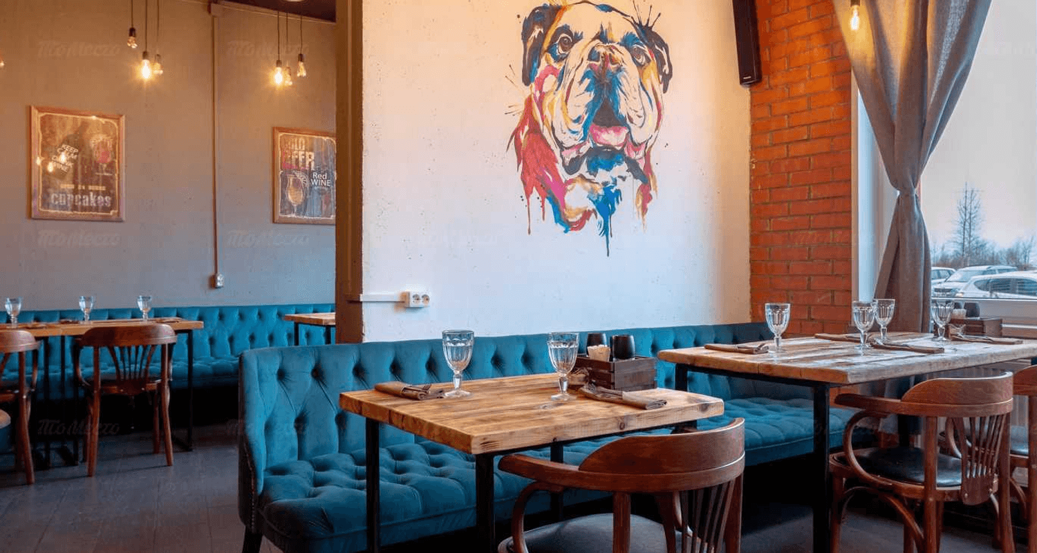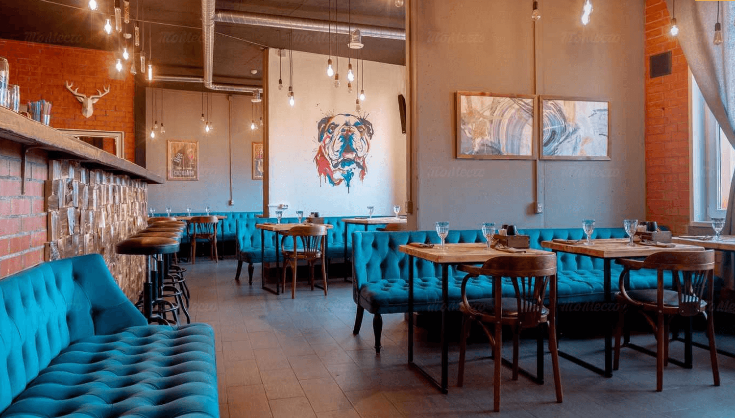 Атмосфера. Здесь сочетается индустриальный шарм и уют: барная стойка из деревянных пластов, кирпичные акценты, изумрудные диваны, граффити с разноцветным бульдогом и оленьи рога на стенах. Из окон открывается вид на залив.