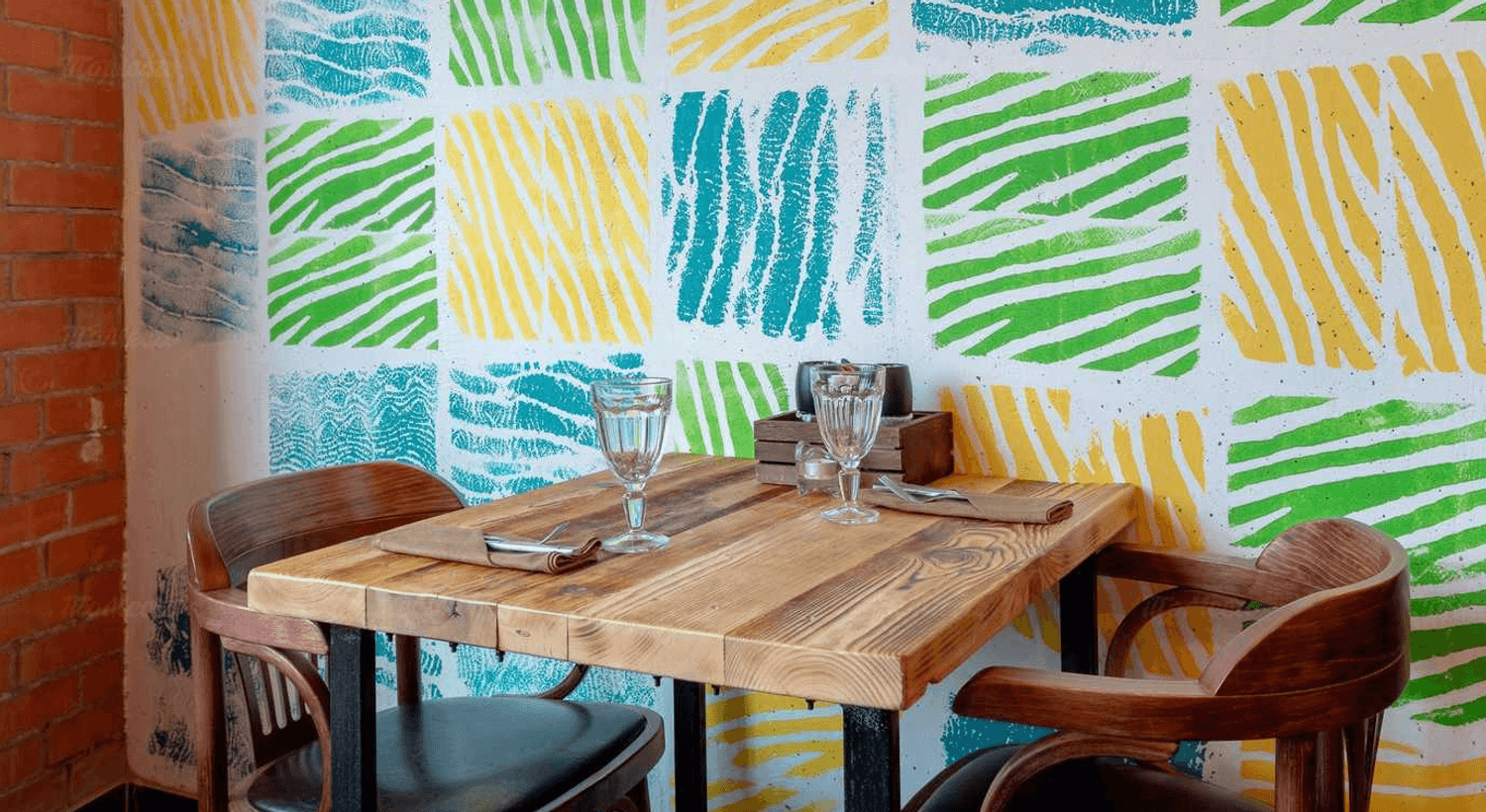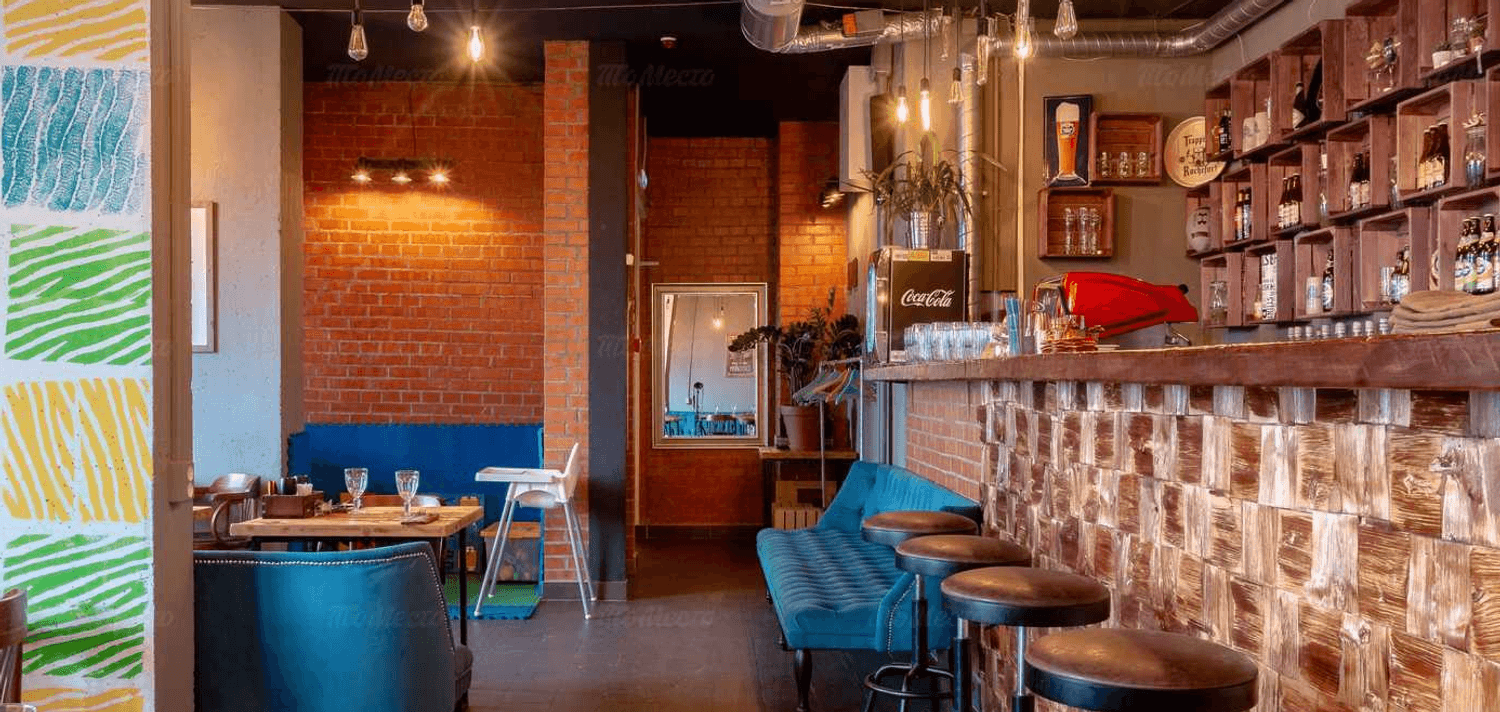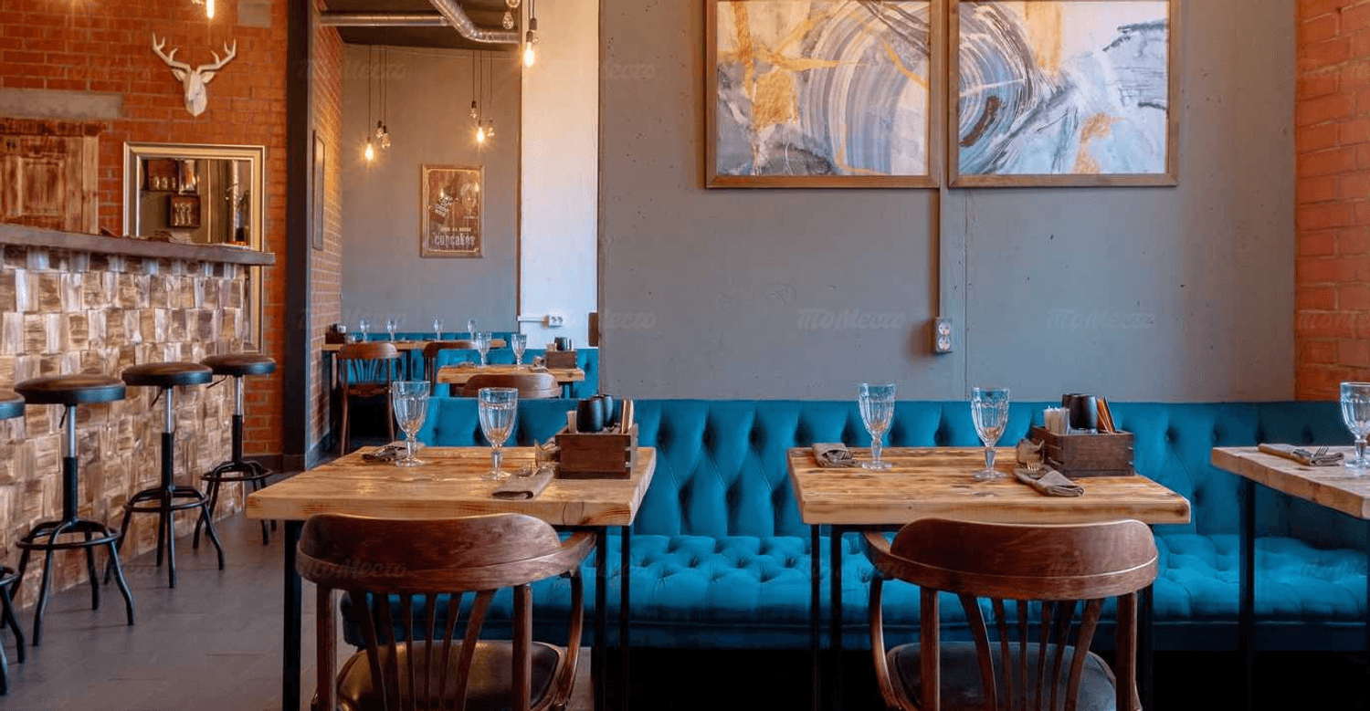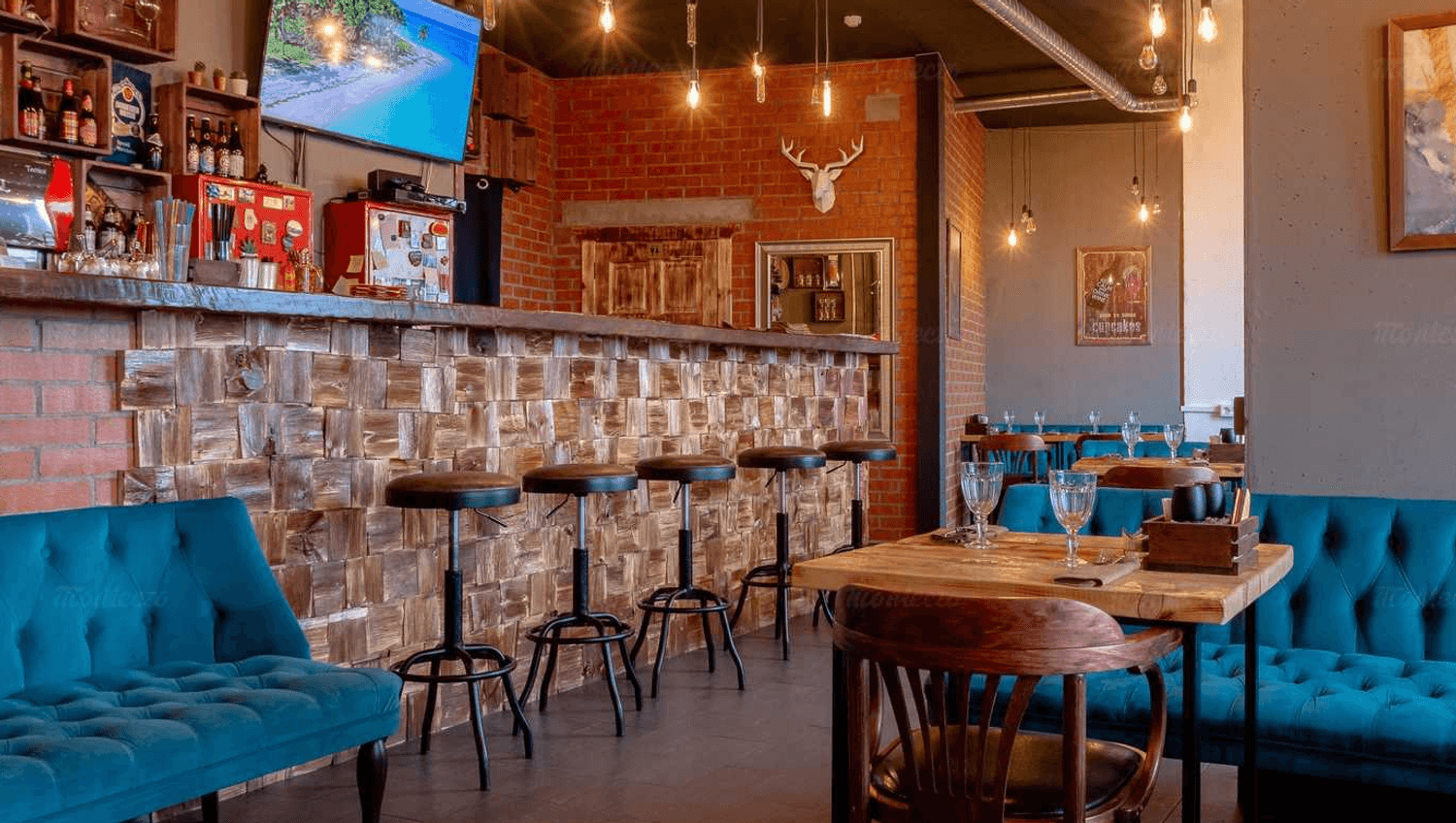Атмосфера. Здесь сочетается индустриальный шарм и уют: барная стойка из деревянных пластов, кирпичные акценты, изумрудные диваны, граффити с разноцветным бульдогом и оленьи рога на стенах. Из окон открывается вид на залив.