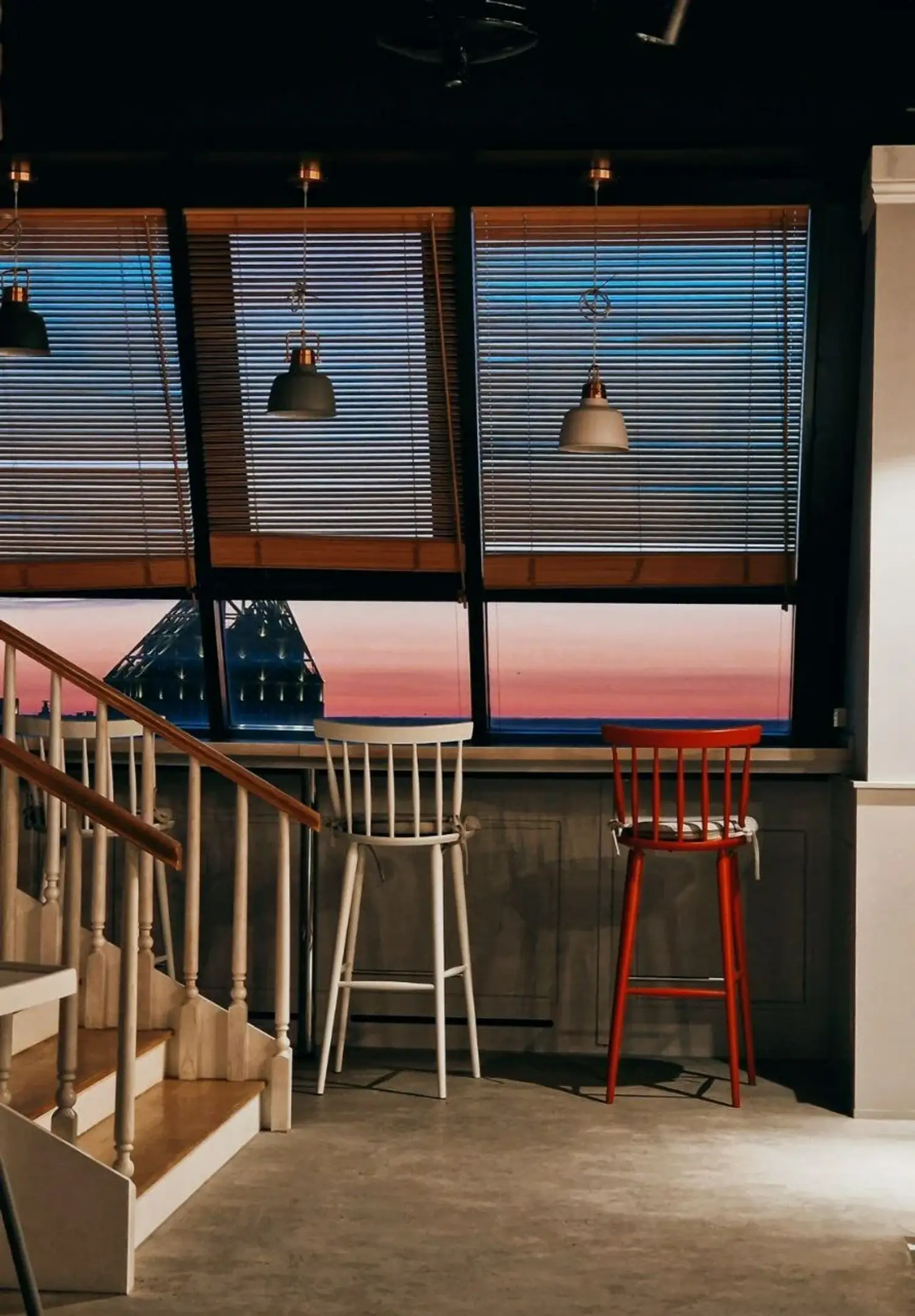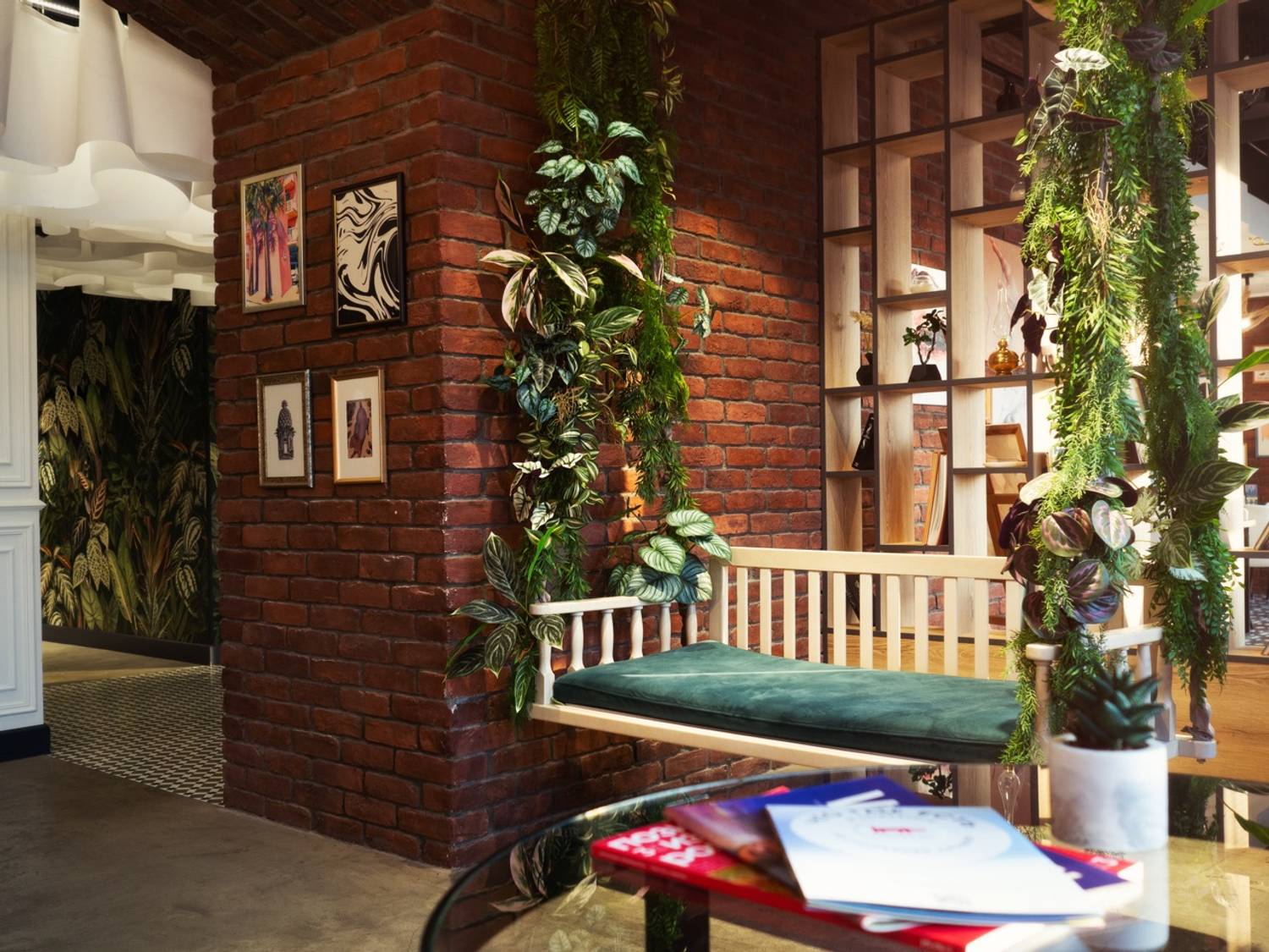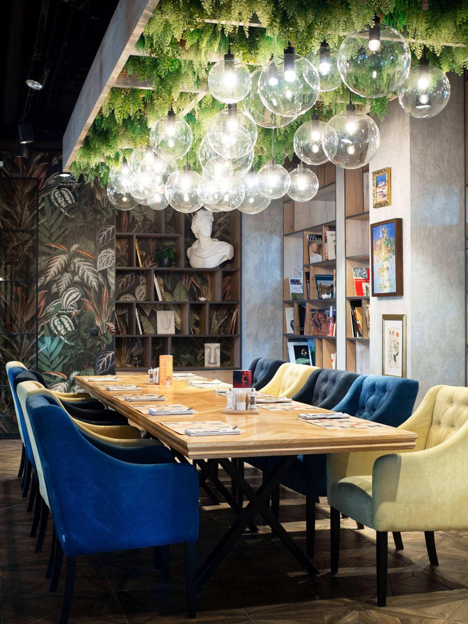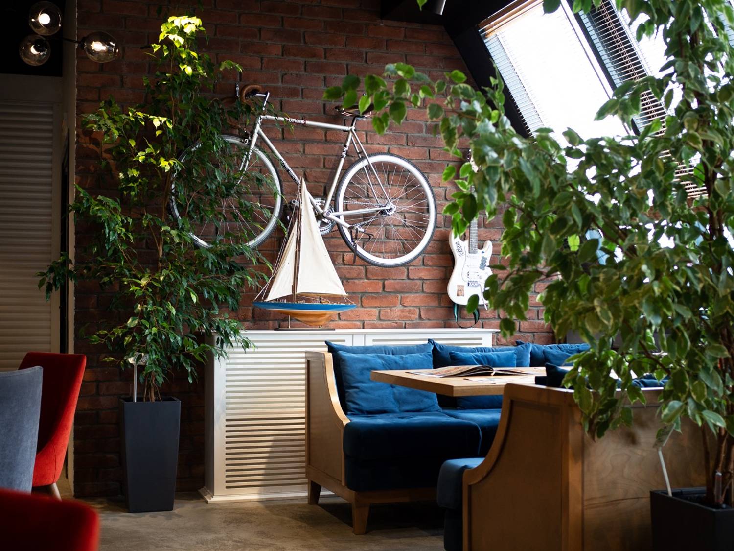 Интерьер в стиле лофт с зеленью, панорамные окна, мольберты, скульптуры и книги создают уютную атмосферу. Здесь можно поесть, поработать или просто расслабиться.