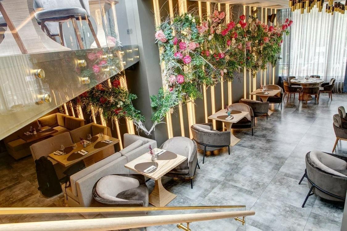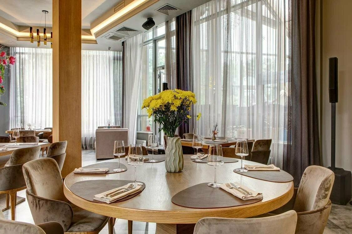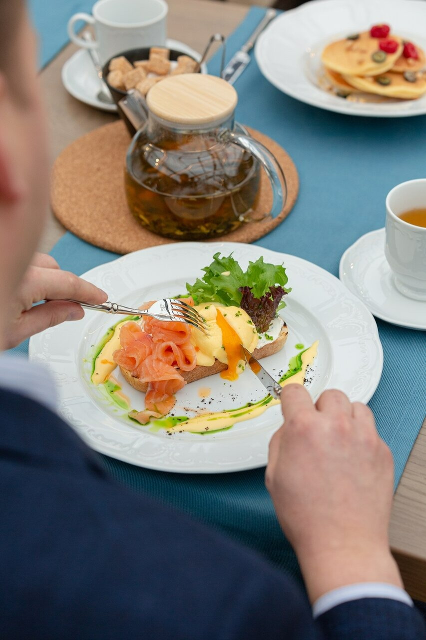 Еда и напитки. В меню — европейская кухня. Здесь можно позавтракать с 8 утра, готовят в это время: яйцо бенедикт с форелью, авокадо тост со сливочным сыром, гречневая каша с кокосовым молоком и орехами. Из горячих блюд готовят аранчини с креветками, треска с толченым картофелем и котлеты из оленины с печеной тыквой и ореховым соусом, а на десерт ганаш из белого шоколада с ягодами и набор эклеров.