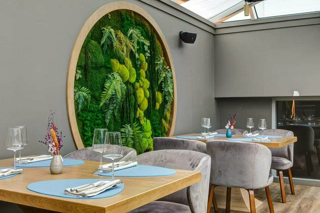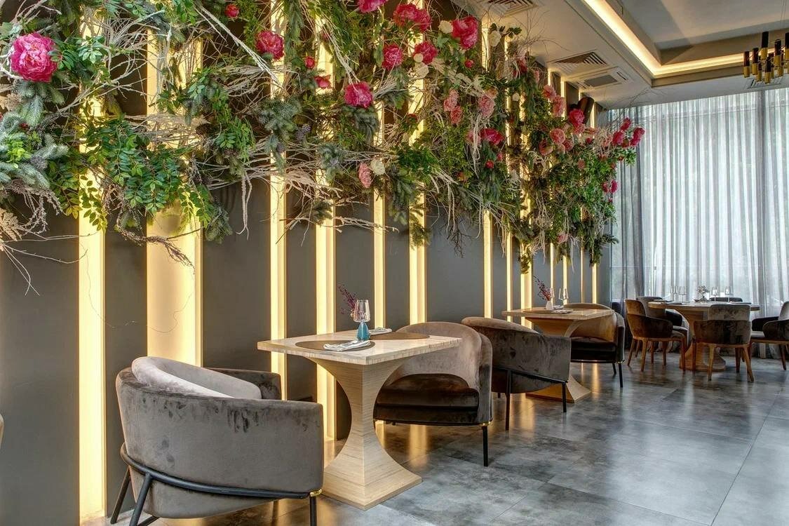 Атмосфера. Пространство в светлых тонах с деревянной мебелью, серыми мраморными полами и круглым панно с искусственной травой в центре внимания. Панорамная терраса открывает вид на природу курортного района.