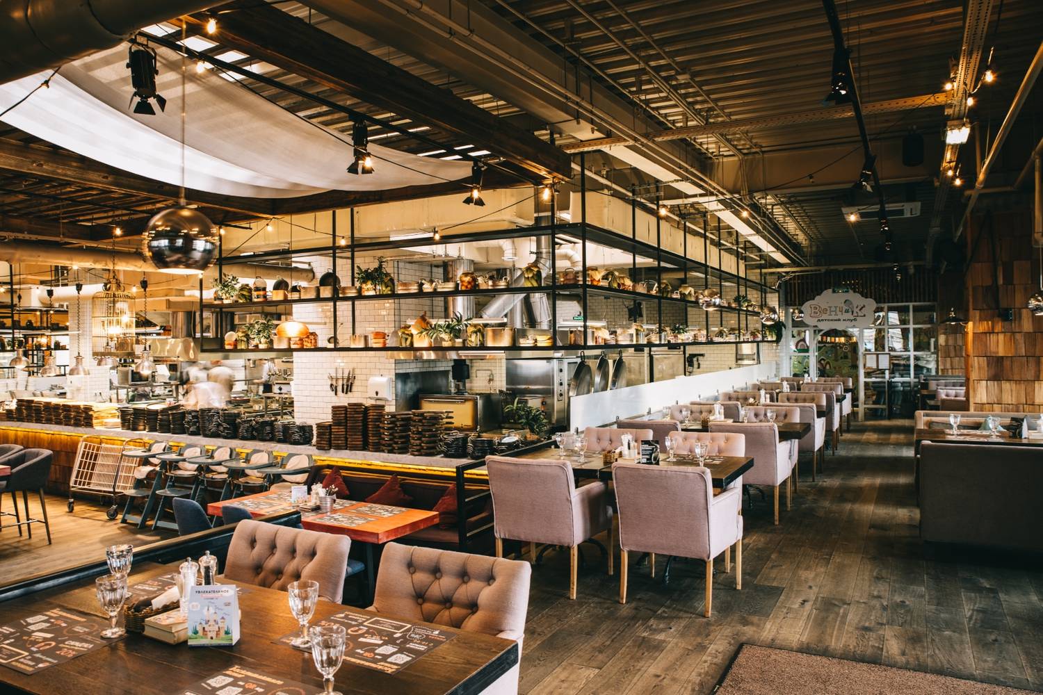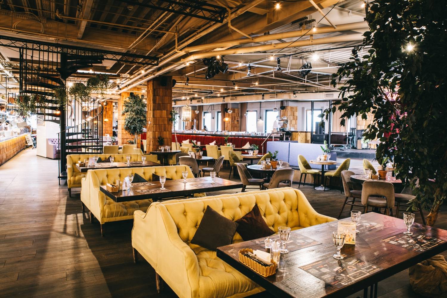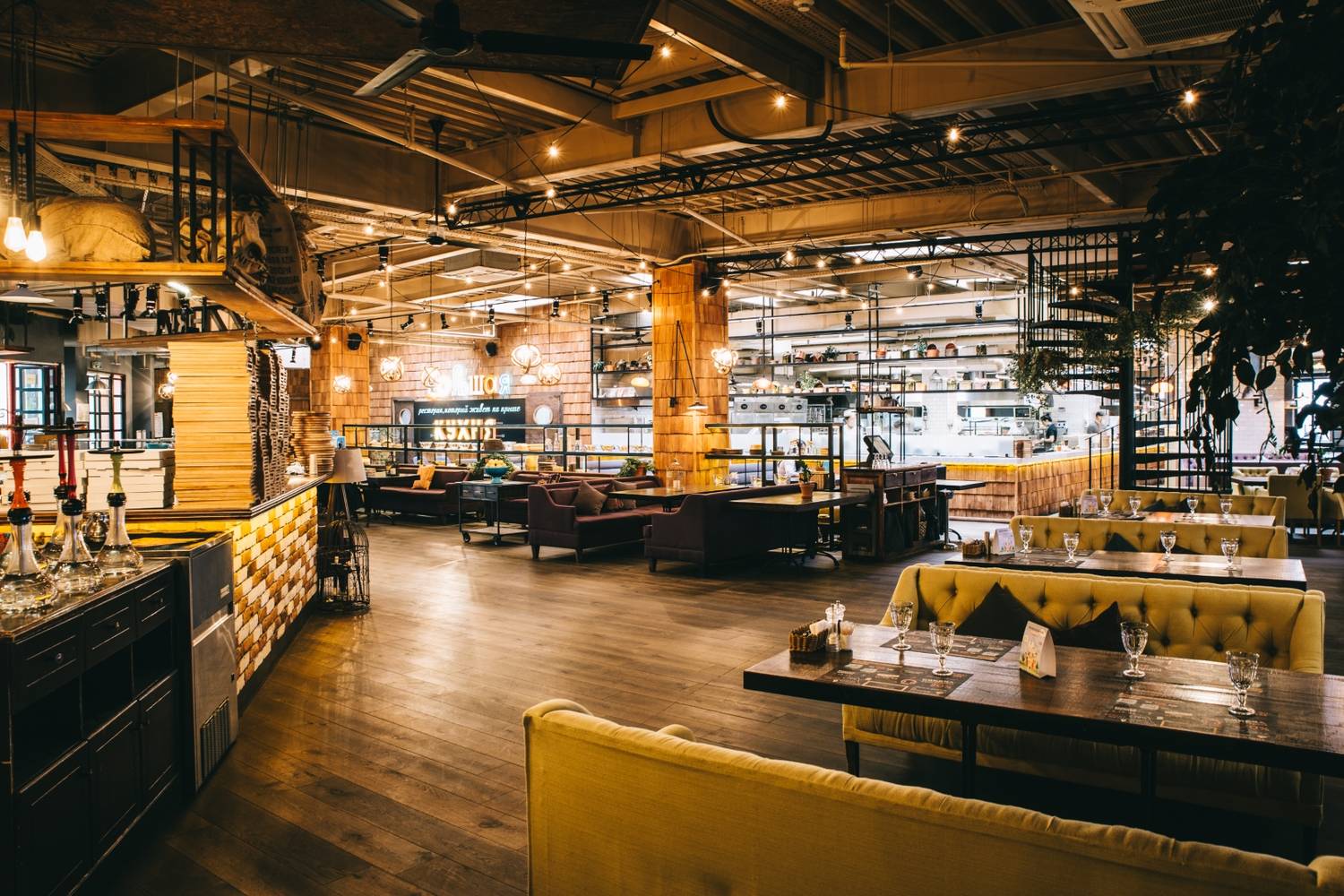 Атмосфера. Пространство с открытой кухней в центре зала создает ощущение театра, где главное действо — приготовление блюд. А лампы в клетках, живые растения и уютные мягкие зоны объединяют индустриальный вайб с обстановкой домашнего тепла и комфорта.
