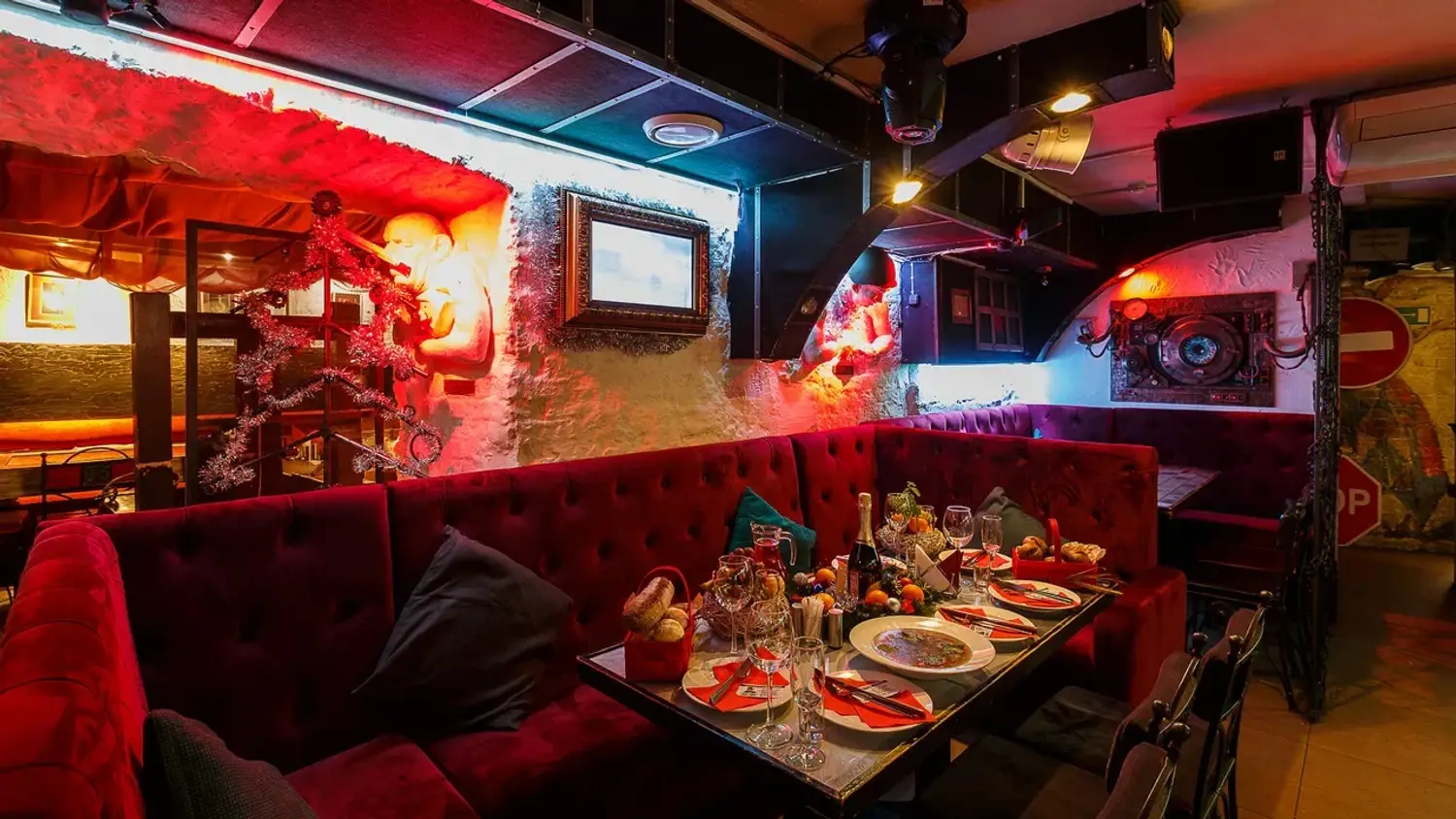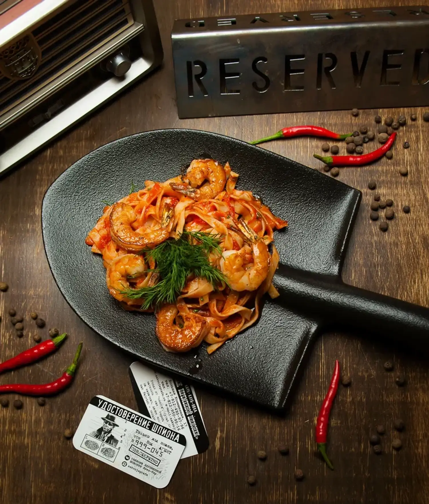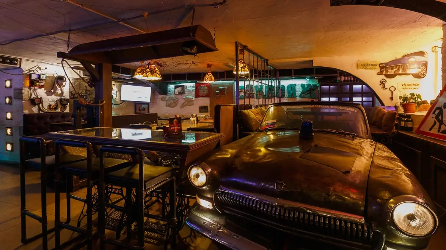 Атмосфера. Немного мрачный интерьер со шпионским характером: подвесные кресла на цепях, винтажный автомобиль, инсталляции с гипсовыми телами. Не пугайтесь, но даже стол здесь сделан в виде гроба, в котором под стеклом находится гипсовая голова. Интерактивный элемент — картонная фигура шпионки с прорезью для лица, чтобы гости могли сделать фотки в шпионском образе.