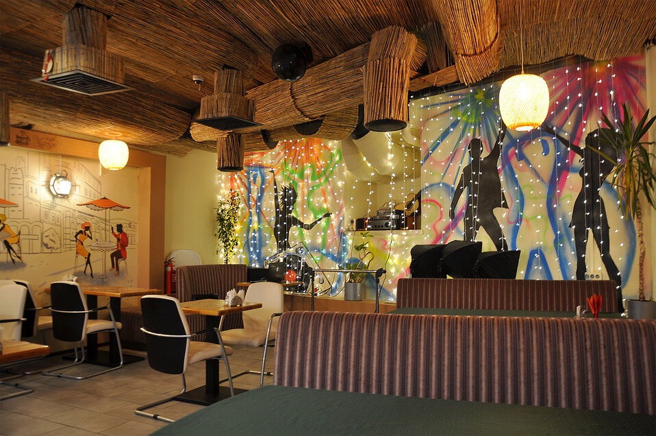 Атмосфера. Небольшой зал с бамбуковыми акцентами на потолке и барной стойке. Настенные росписи с океанскими пейзажами, силуэтами танцующих фигур в вихре ярких полос и сценами застолья переносят гостей в курортное настроение.