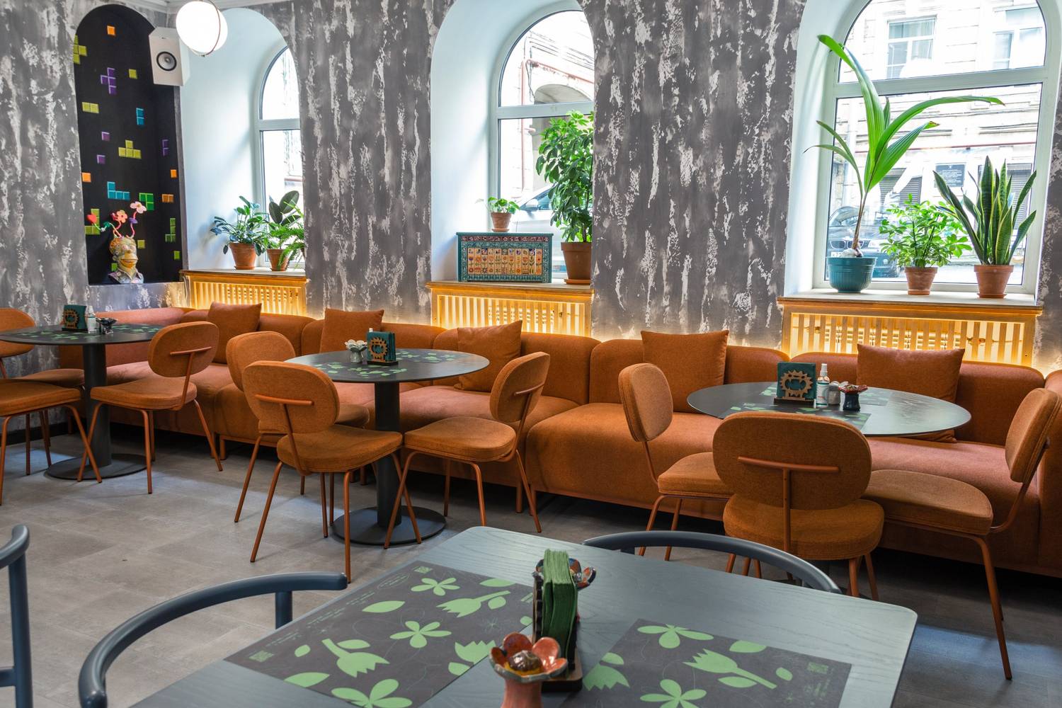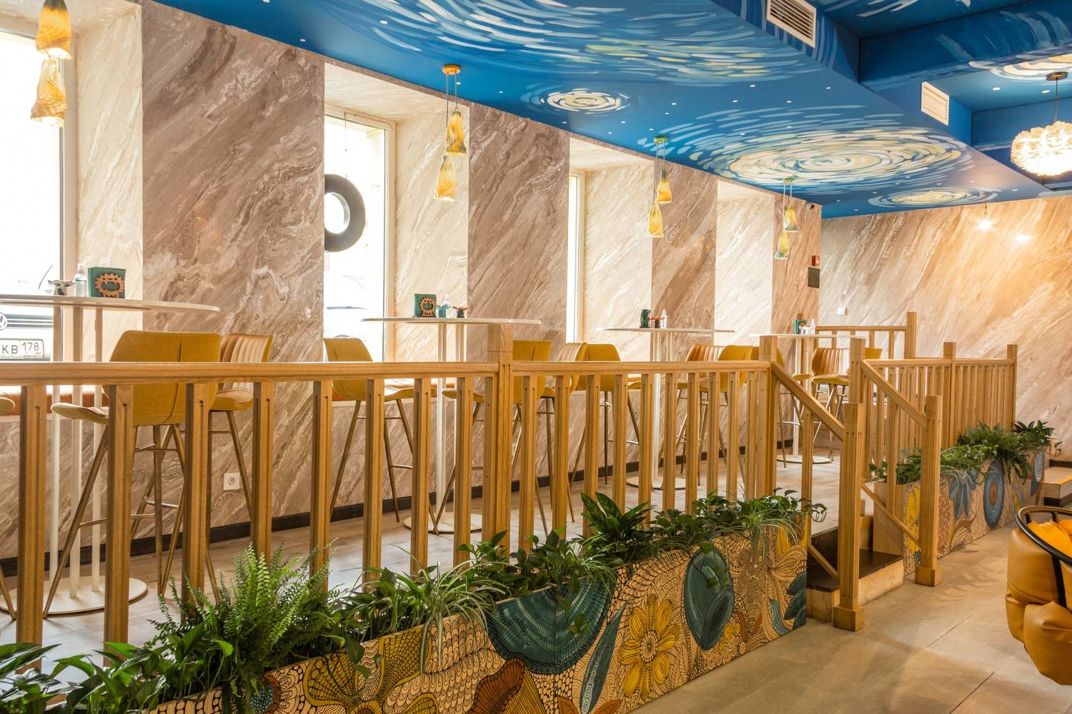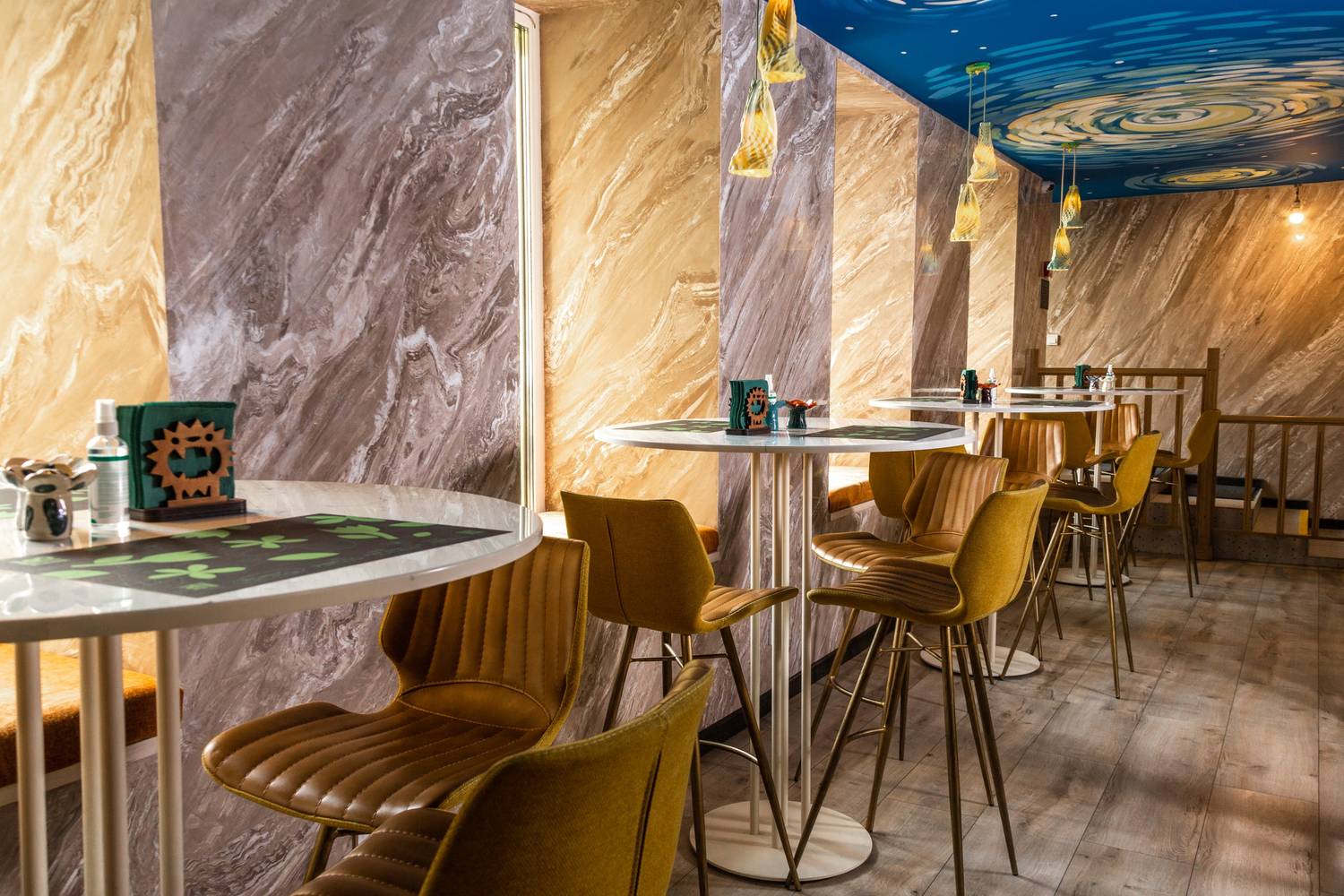 Атмосфера. Минималистичное пространство с художественной росписью на синем потолке, пушистыми люстрами и игривыми деталями: бюсты Гомера Симпсона, телевизор в форме геймпада. На фоне звучит приятная музыка.
