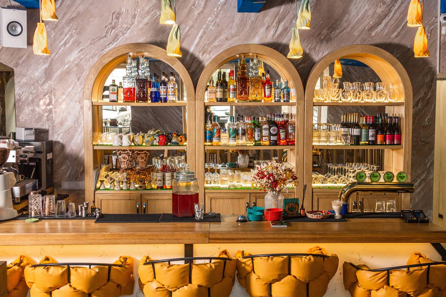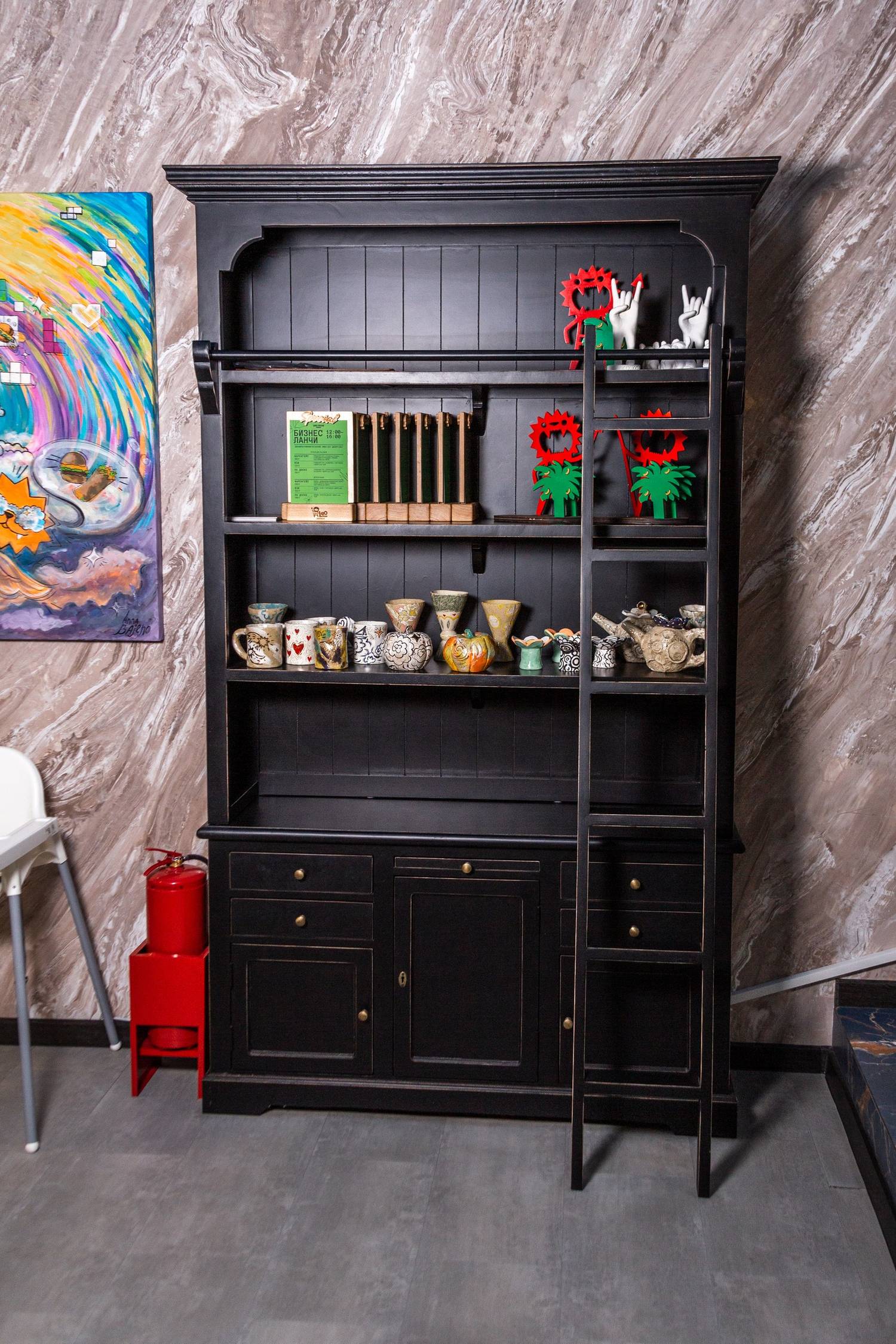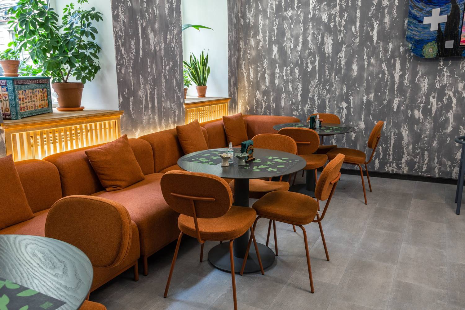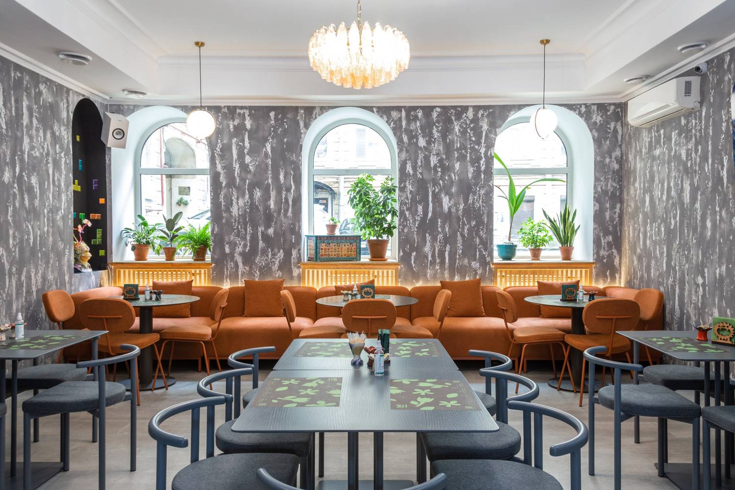 Атмосфера. Минималистичное пространство с художественной росписью на синем потолке, пушистыми люстрами и игривыми деталями: бюсты Гомера Симпсона, телевизор в форме геймпада. На фоне звучит приятная музыка.