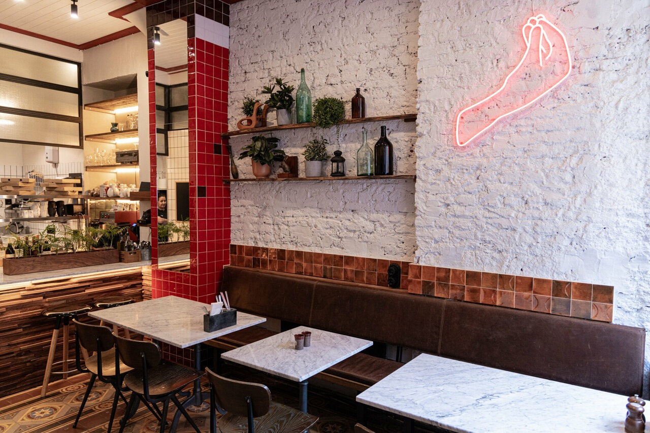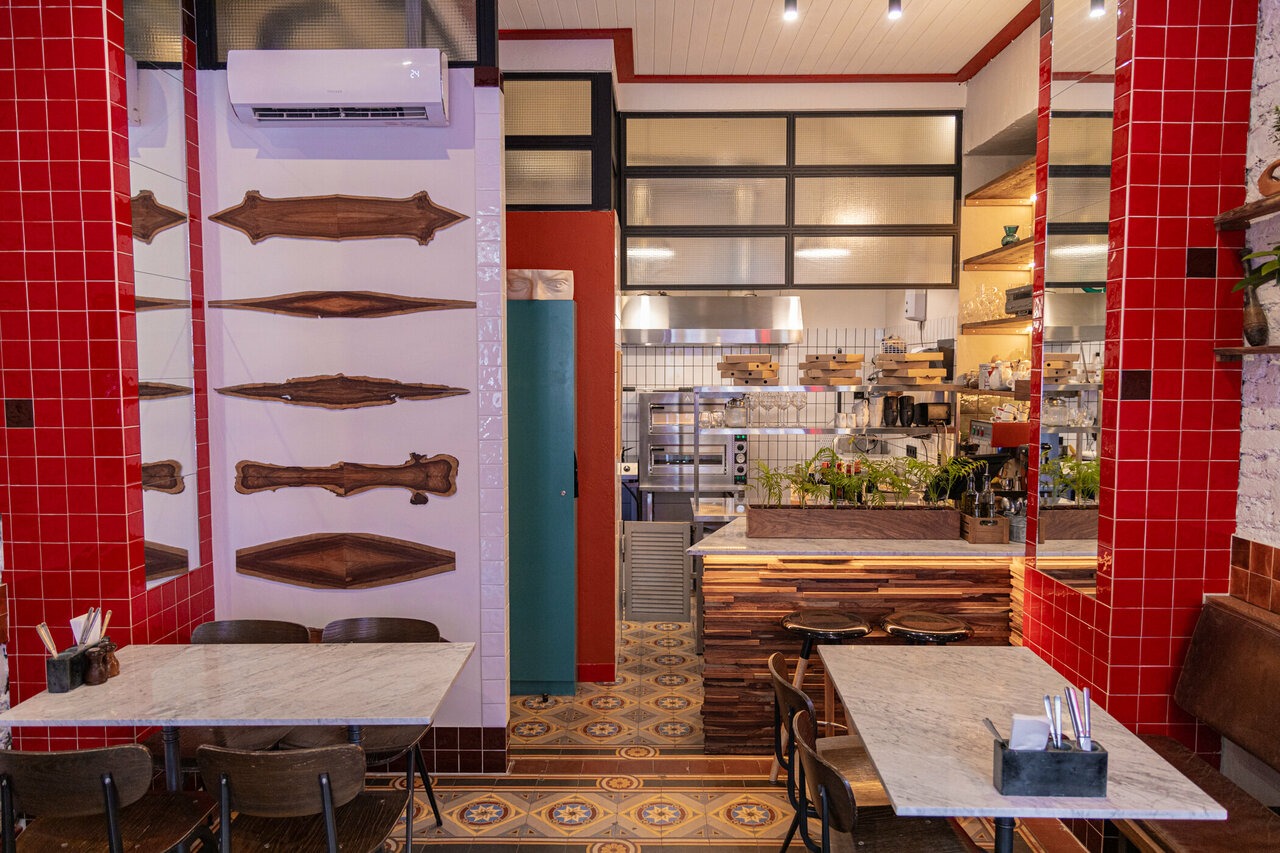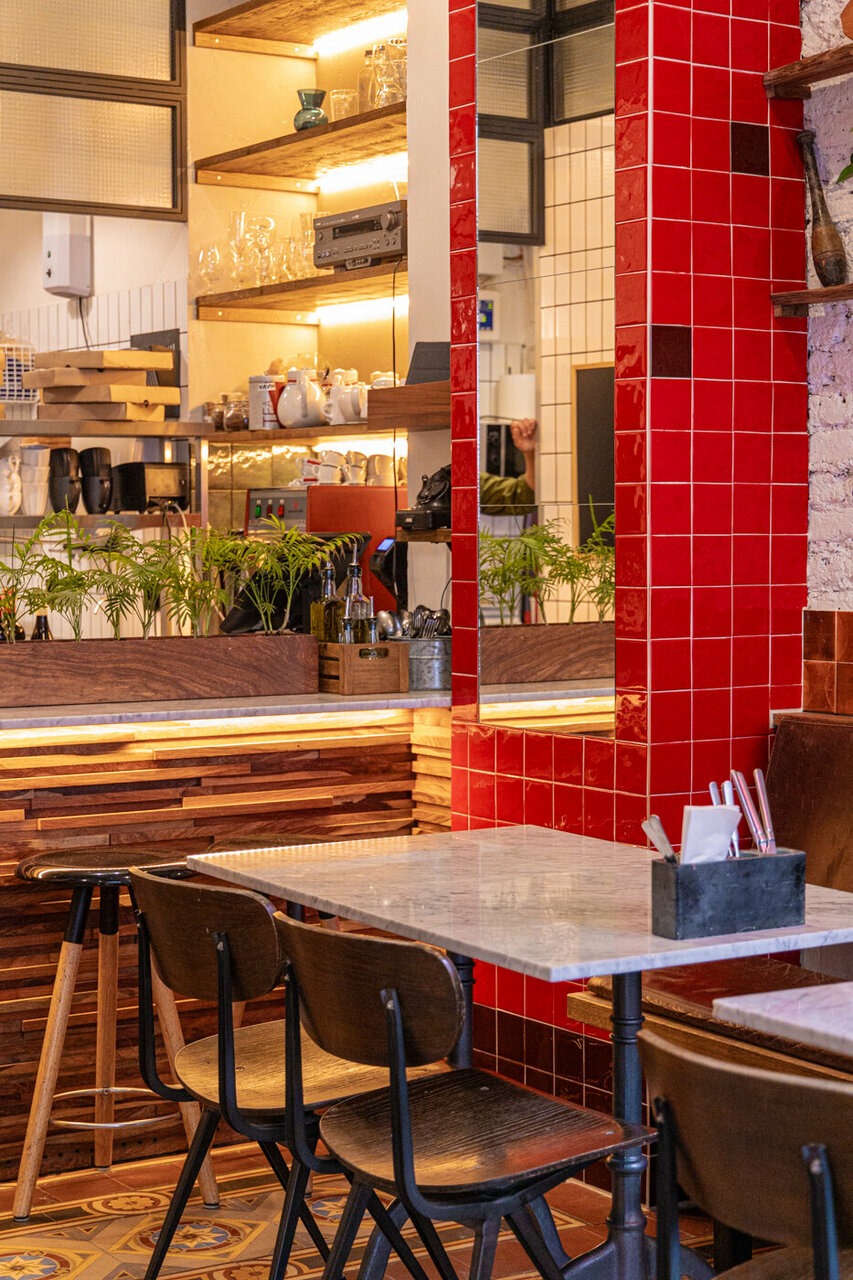 Атмосфера. Камерное заведение с шестью столиками оформлено в теплых тонах и ярким акцентом в виде красного столба. Вы словно оказались в гостях у итальянской семьи: прямоугольное зеркало на стене, живые растения, столы в мраморном стиле, деревянные стулья и орнаментальная плитка создают такое ощущение.
