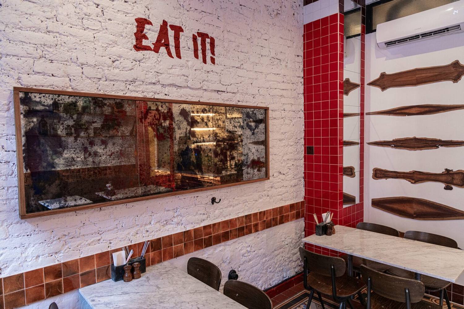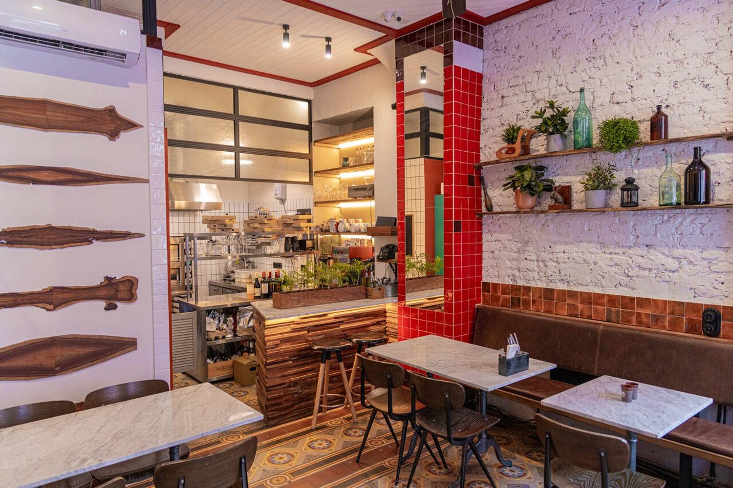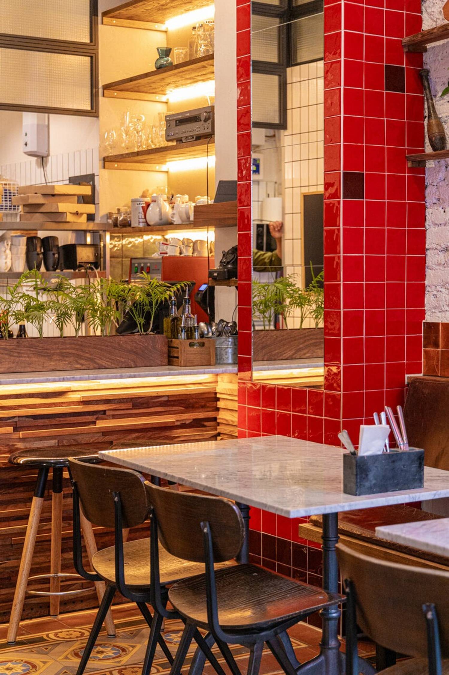 Атмосфера. Камерное заведение с шестью столиками оформлено в теплых тонах и c ярким акцентом в виде красного столба. Вы словно оказались в гостях у итальянской семьи: прямоугольное зеркало на стене, живые растения, столы в мраморном стиле, деревянные стулья и орнаментальная плитка.