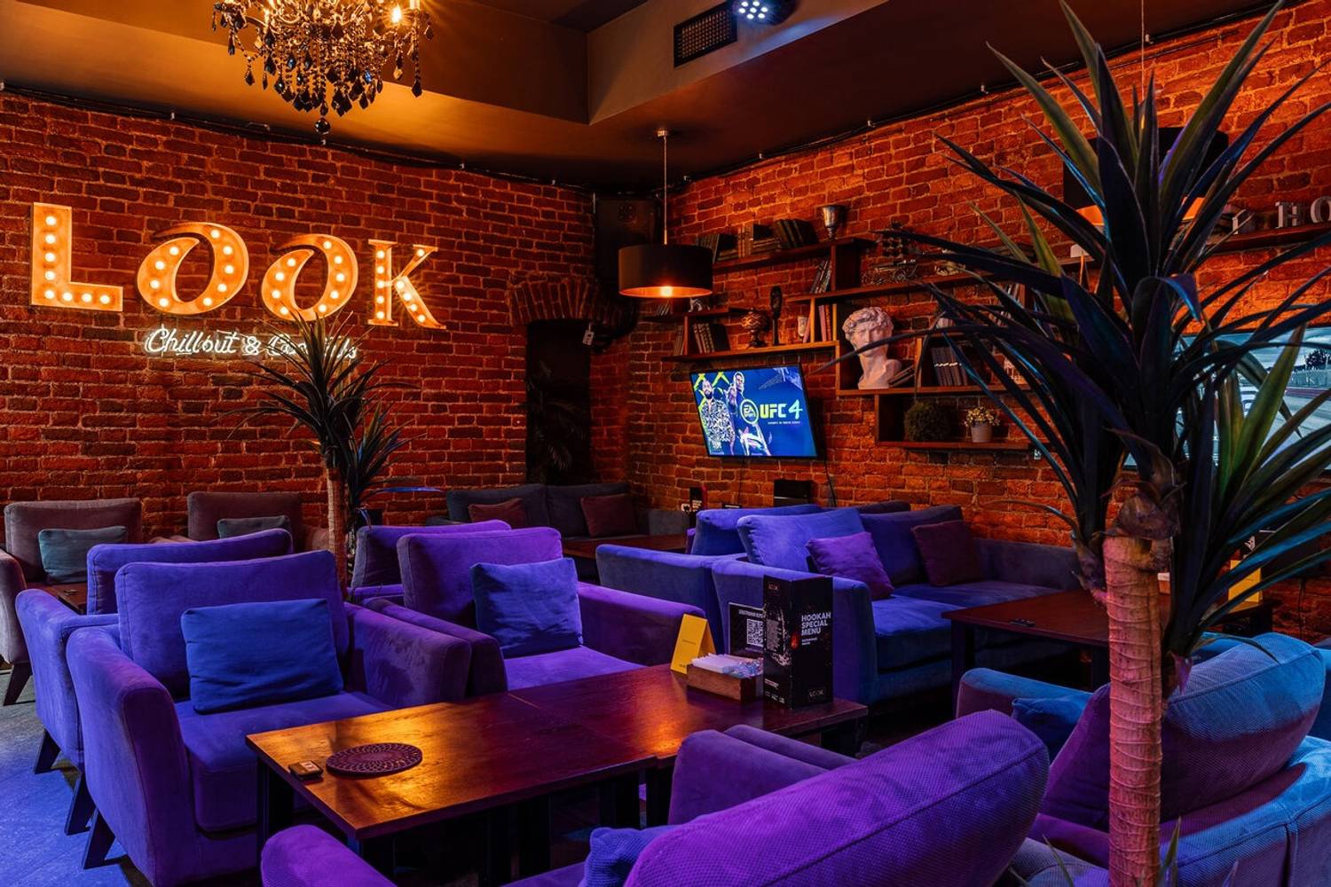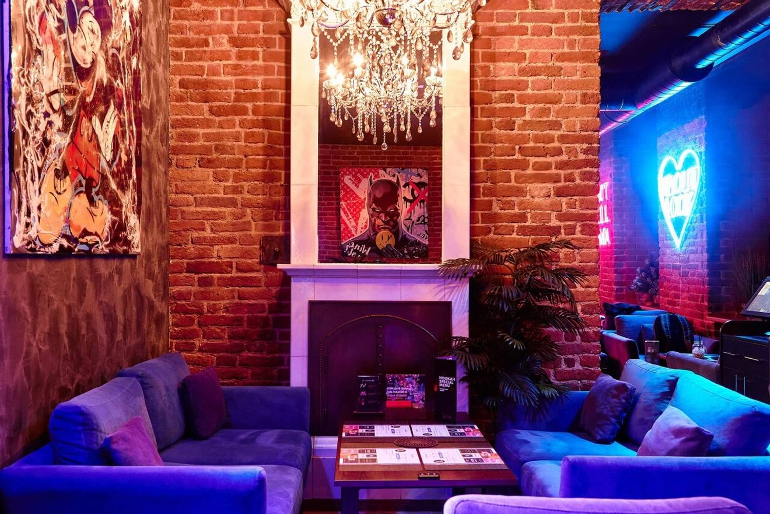 Атмосфера. Здесь оформили три зала с разной атмосферой: зона с PlayStation 4 и настольными играми для активного отдыха, барная зона и спокойная лаунж-зона с мягкими диванами. Всех их объединяет любовь к неону и фиолетово-синей цветовой гамме.