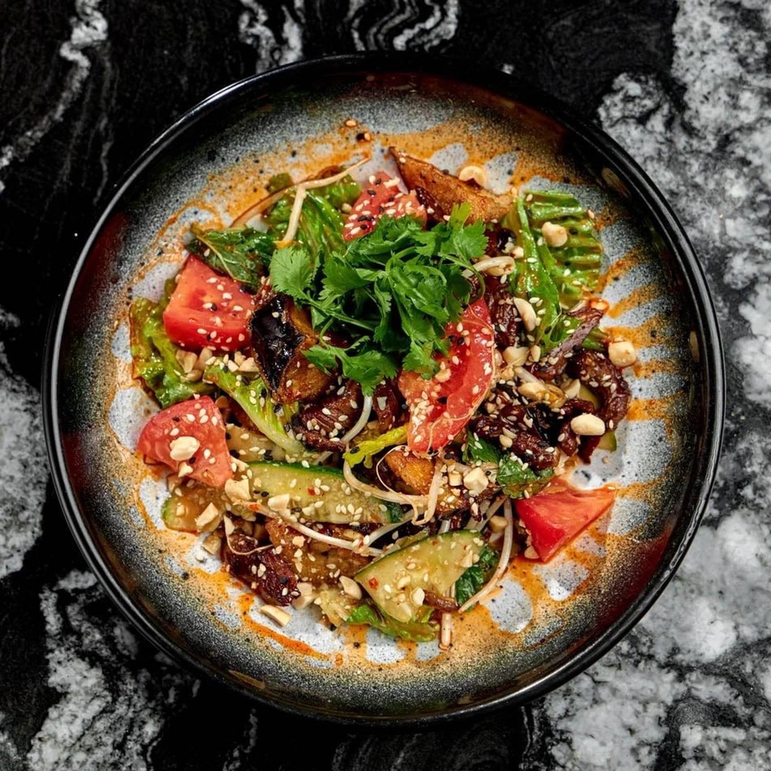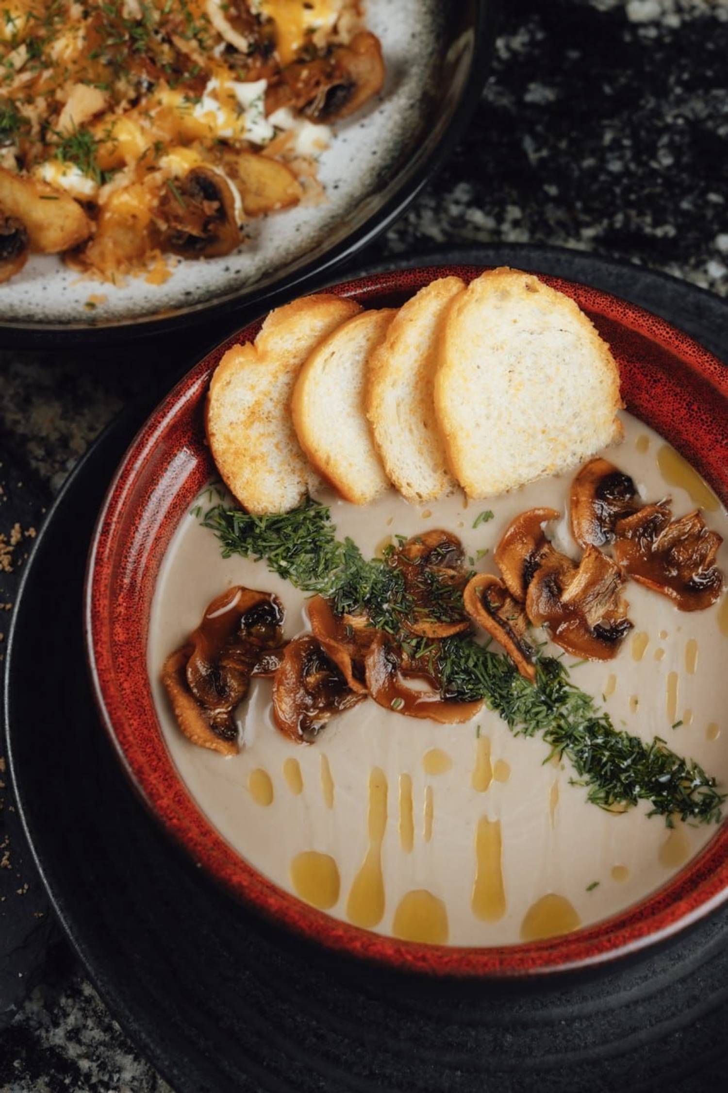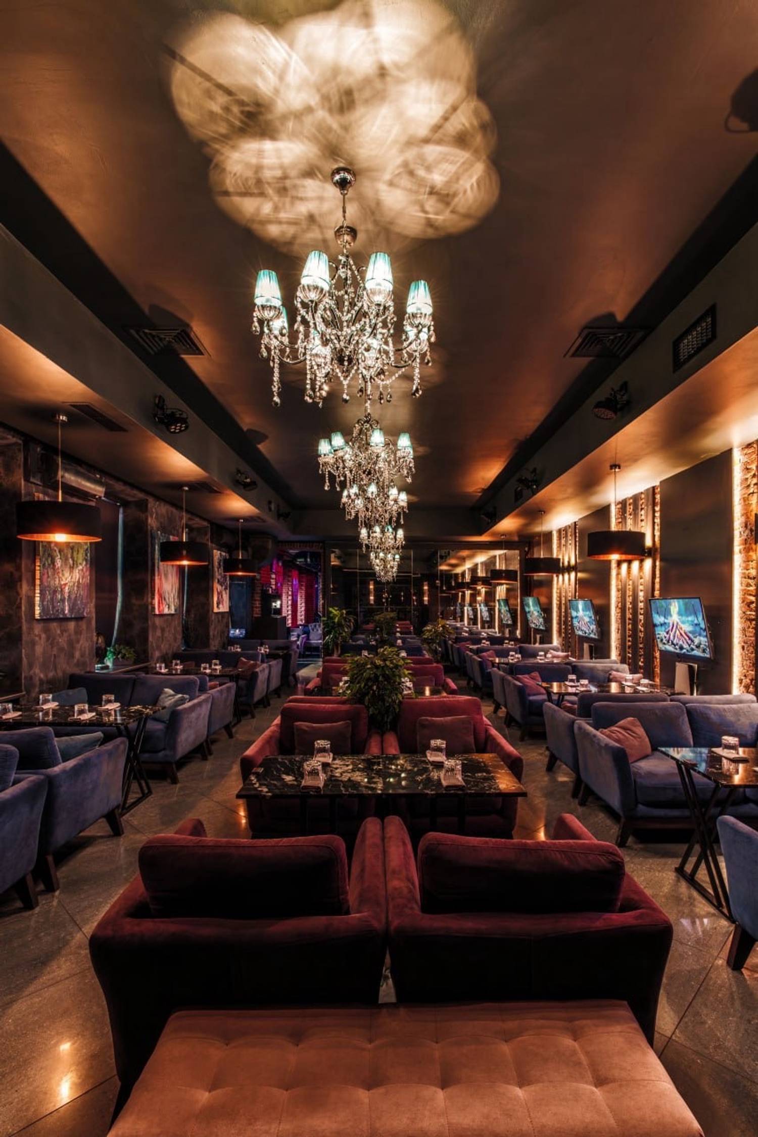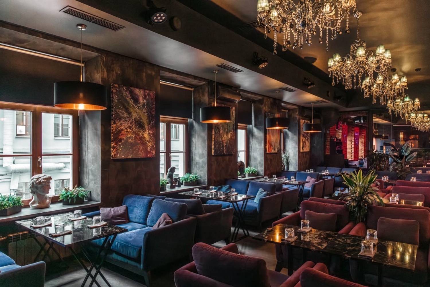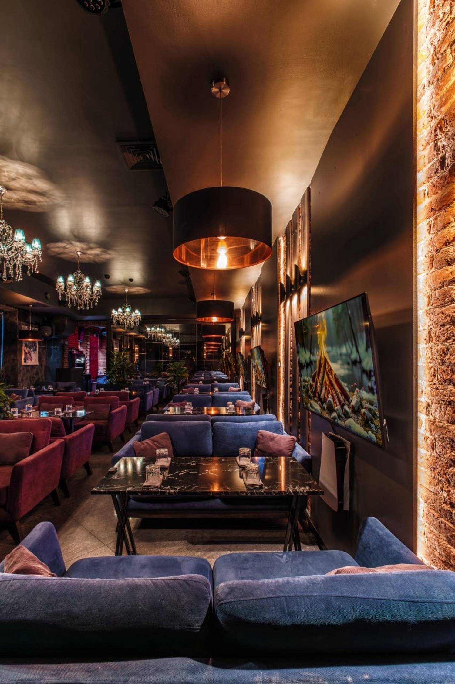 Еда и напитки. В меню — как легкие закуски, так и сытные блюда: ролл с угрем и кремом трюфель, хрустящие креветки с соусом манго чили, салат с утиной грудкой, ризотто 4 сыра. Из десертов есть наполеон с грушево-сливочным кремом и мелиссой и шоколадный фондан. Также тут собрали более 30 кальянных миксов.