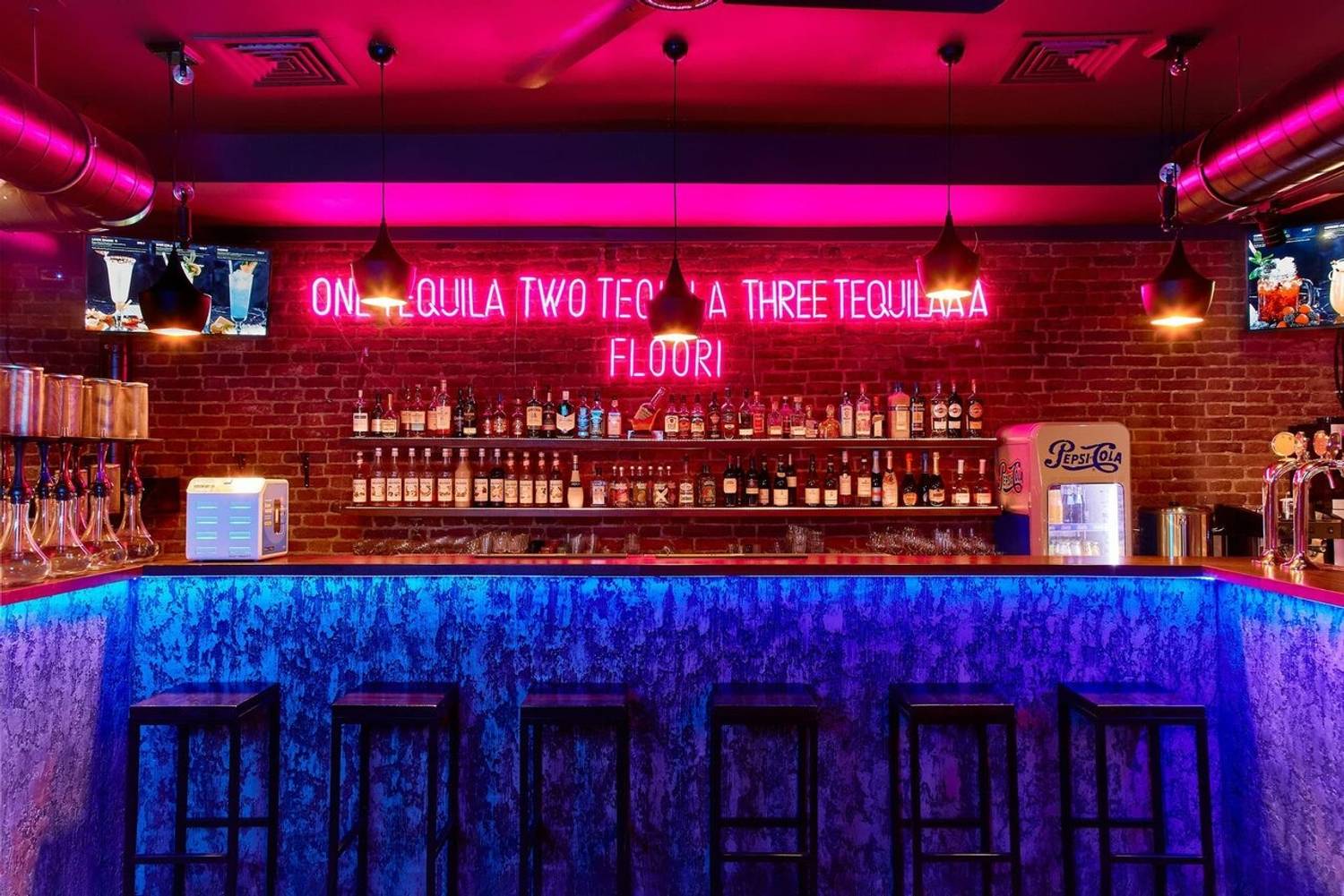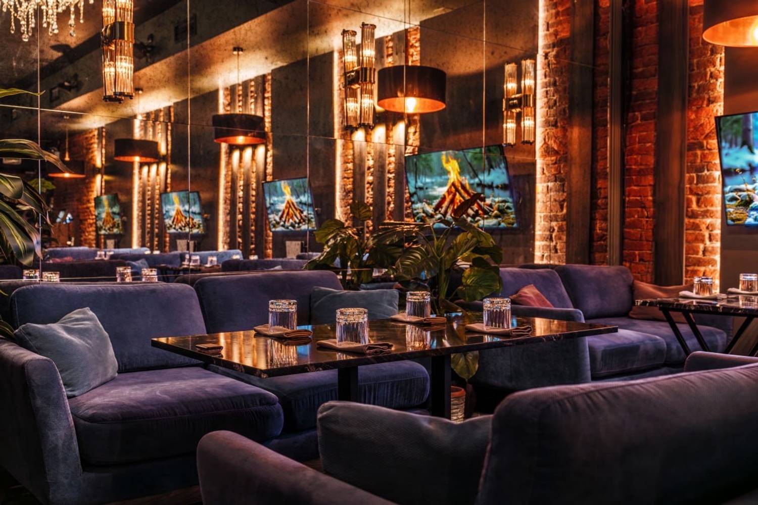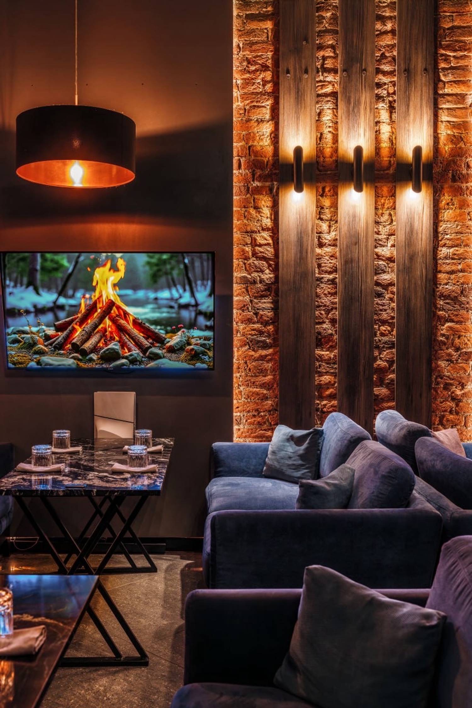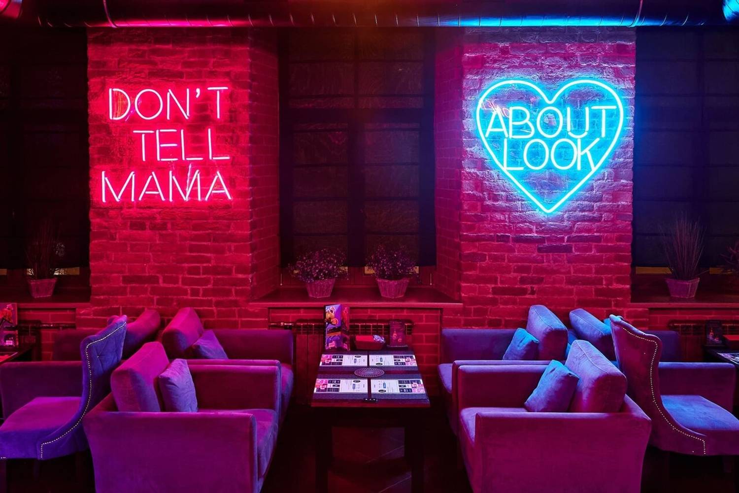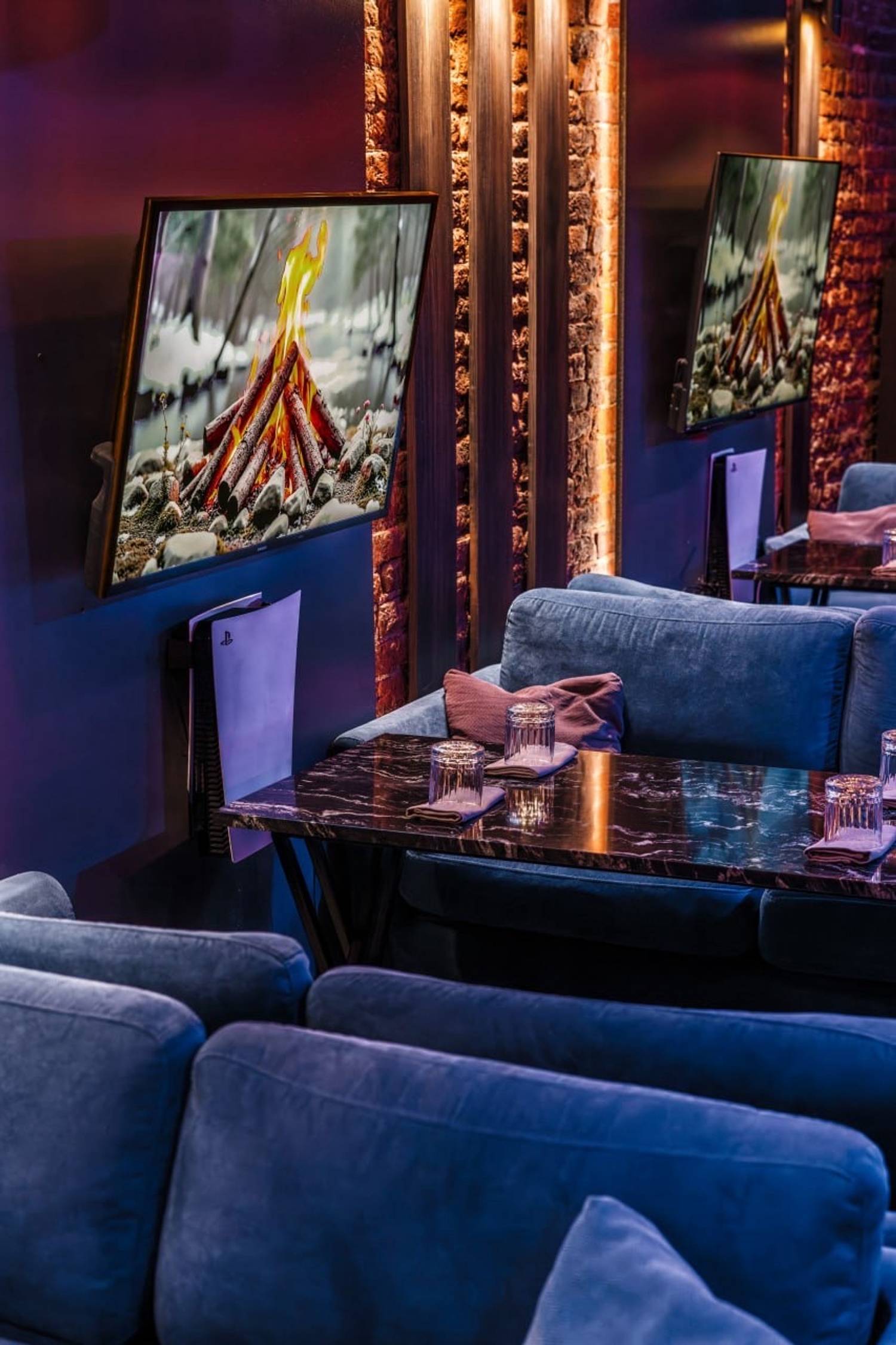 Атмосфера. Здесь оформили три зала с разной атмосферой: зона с PlayStation 4 и настольными играми для активного отдыха, барная зона и спокойная лаунж-зона с мягкими диванами. Всех их объединяет любовь к неону и фиолетово-синей цветовой гамме.
