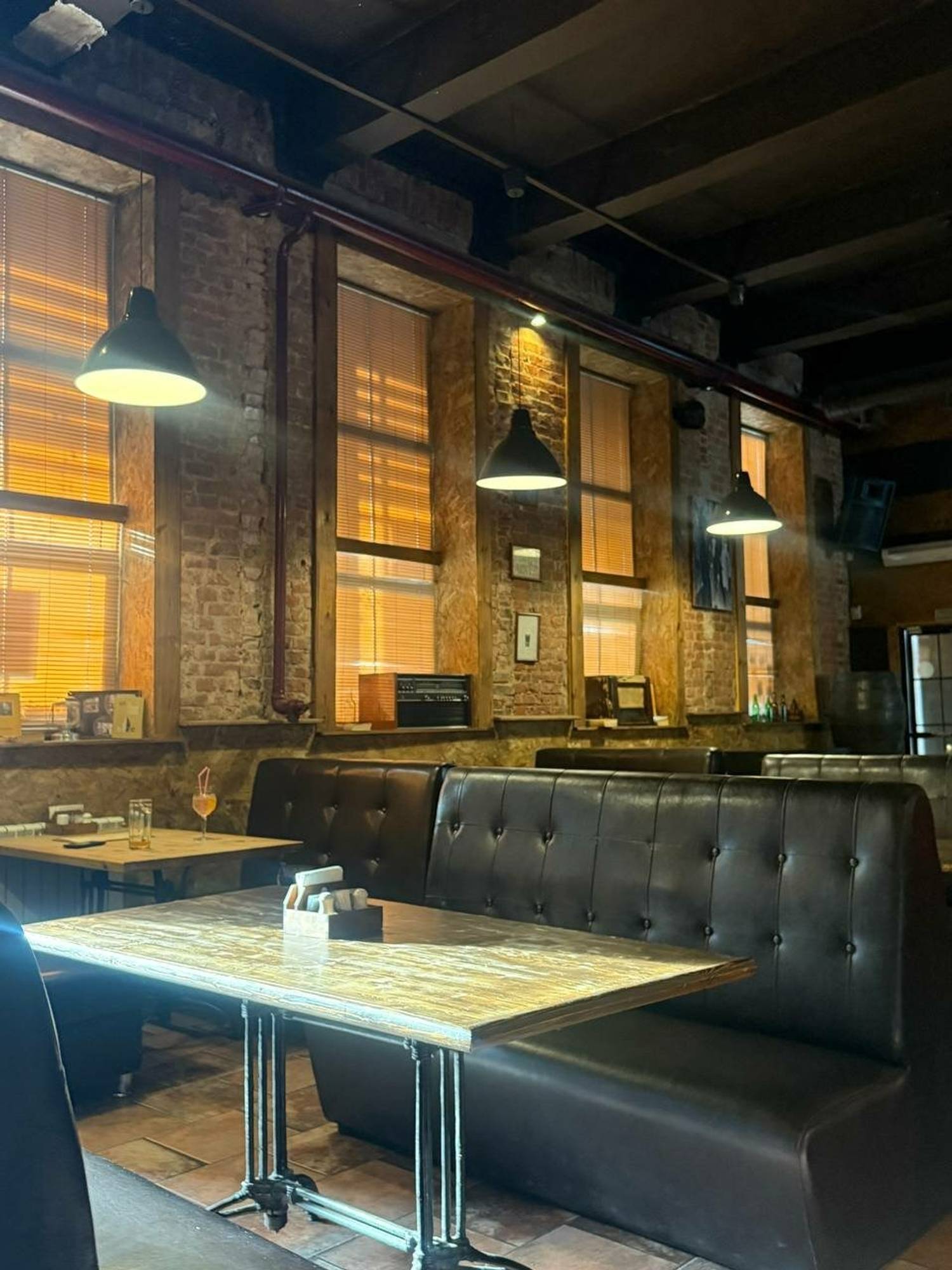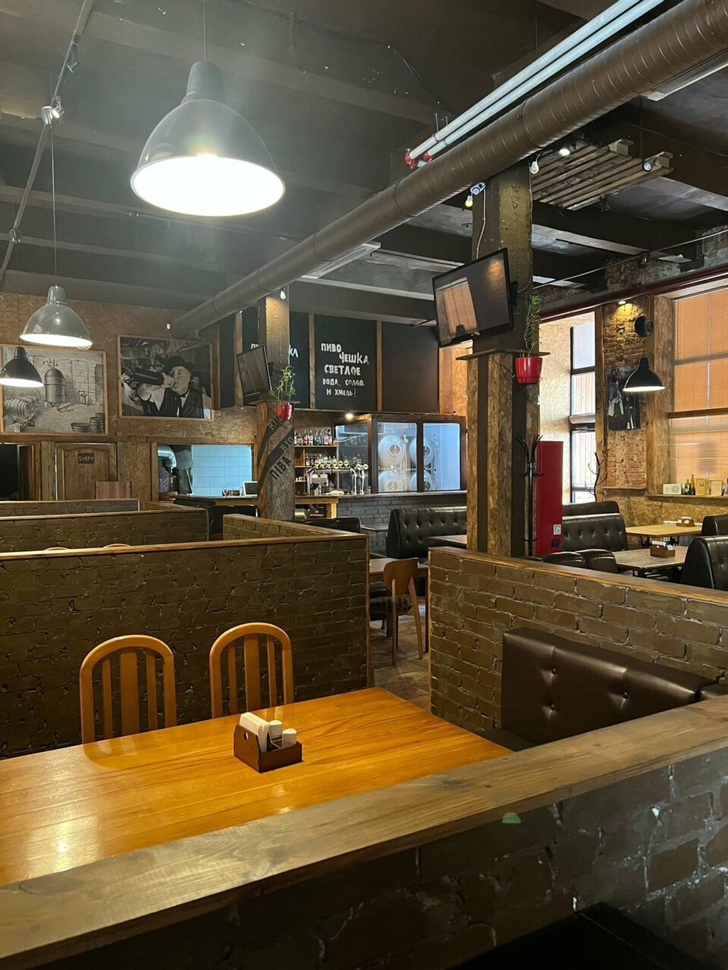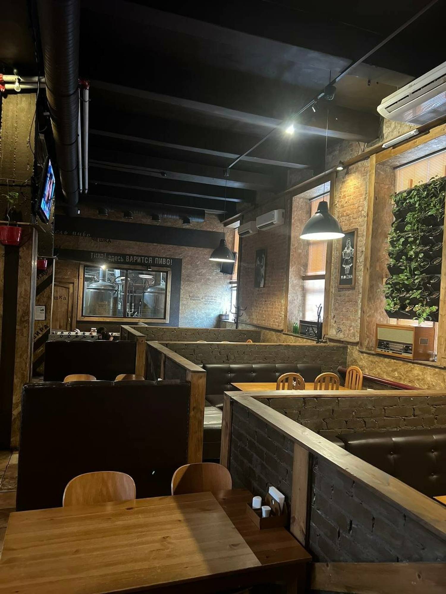 Атмосфера. Интерьер здесь продуман так, чтобы хотелось остаться. Кирпичные стены, кожаные диваны, в которые приятно провалиться после рабочего дня, картины на стенах и панно из растений — всё это создаёт настроение. Не громко, не тесно, не суетливо. Музыка играет приятная, ненавязчивая — можно и поговорить, и послушать. Персонал, судя по отзывам, вежливый и внимательный, но без заигрываний. Здесь чувствуешь себя как в гостях у друзей, которые знают толк в пиве и умеют создать правильную атмосферу.