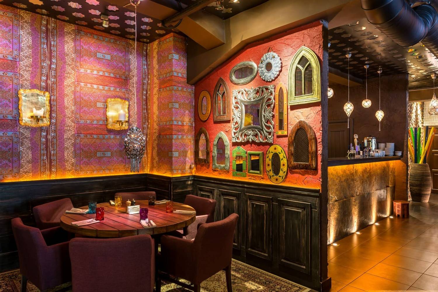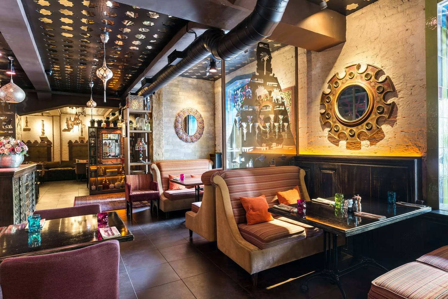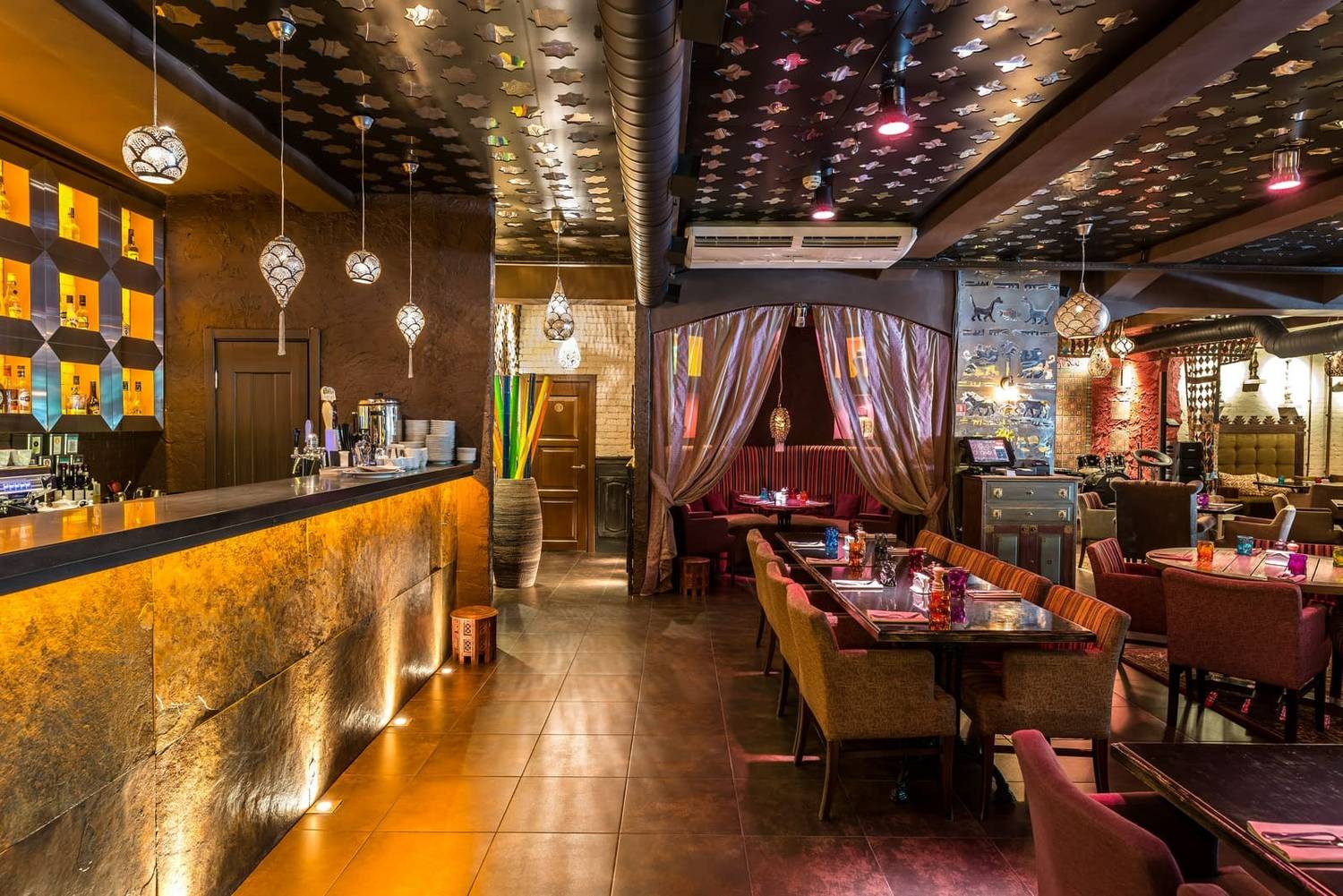Атмосфера. Сюда приходят на неторопливый ужин, когда хочется сидеть подольше и заказывать не одно блюдо, а сразу несколько на компанию. Люстры похожи на прозрачные вазы в восточном стиле. Пространство поддерживает этот сценарий: несколько залов, банкетный зал и VIP-залы, мягкая посадка с диванами и подушками. В оформлении много восточных деталей, которые бросаются в глаза не по одному разу: узорчатые ковры, яркие витражи и лампы, предметы быта. В теплое время выручает летняя веранда. По пятницам и субботам заявлена живая музыка с 20:00, поэтому вечер часто складывается вокруг программы, а не вокруг быстрого ужина.
