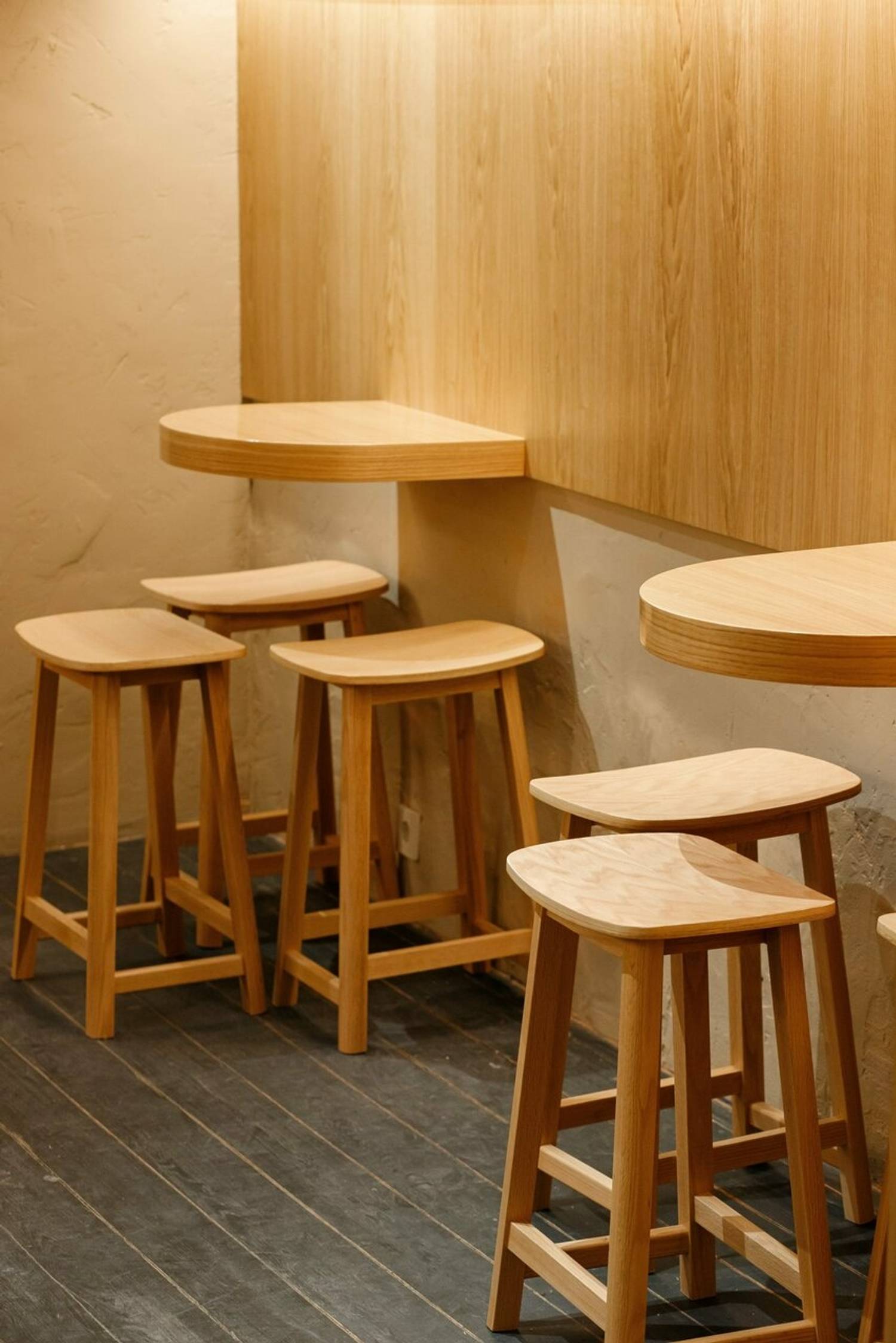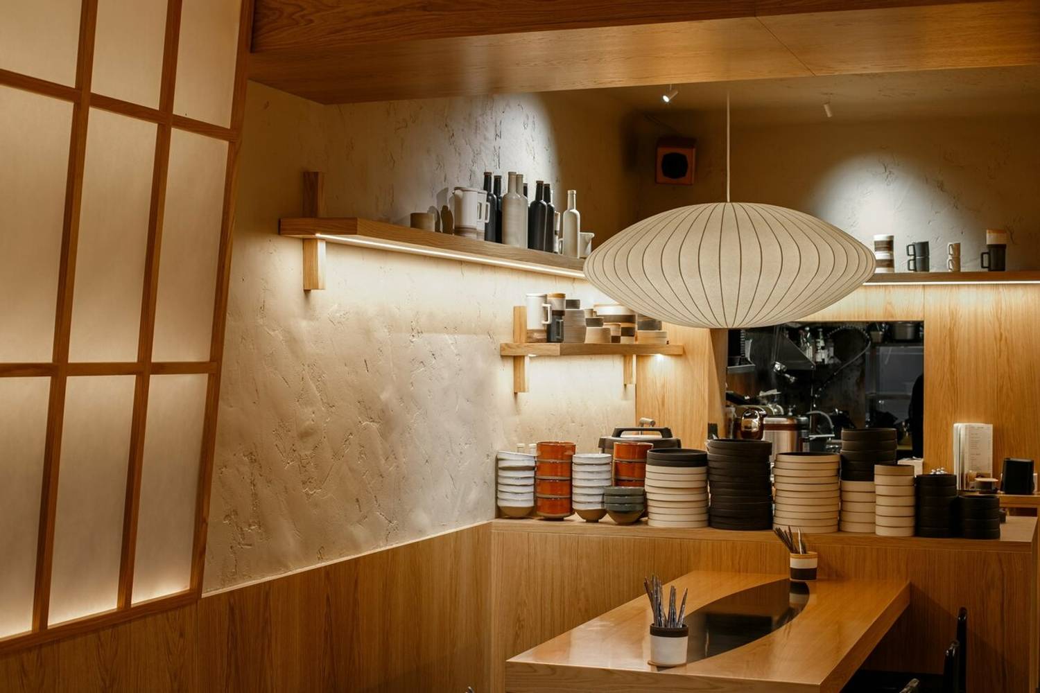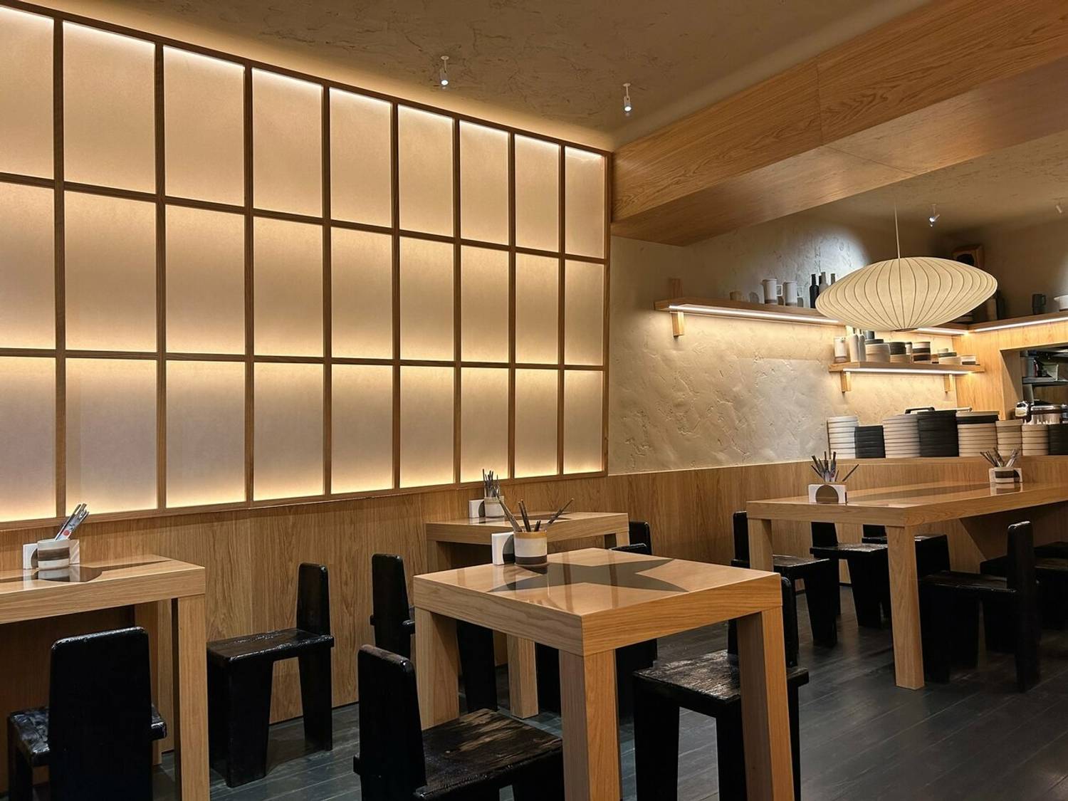 Атмосфера. Интерьер здесь сдержанный и светлый: деревянная отделка, мягкий свет, небольшие столики, черные табуретки — все работает на то, чтобы создать спокойную, почти медитативную атмосферу. Акцентная бежевая объемная люстра напоминает китайский фонарь, а на полке примостилась азиатская маска — детали, которые добавляют пространству характера. Суши-бар небольшой, больше подходит для камерной обстановки.