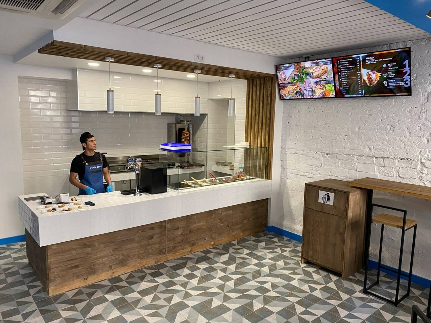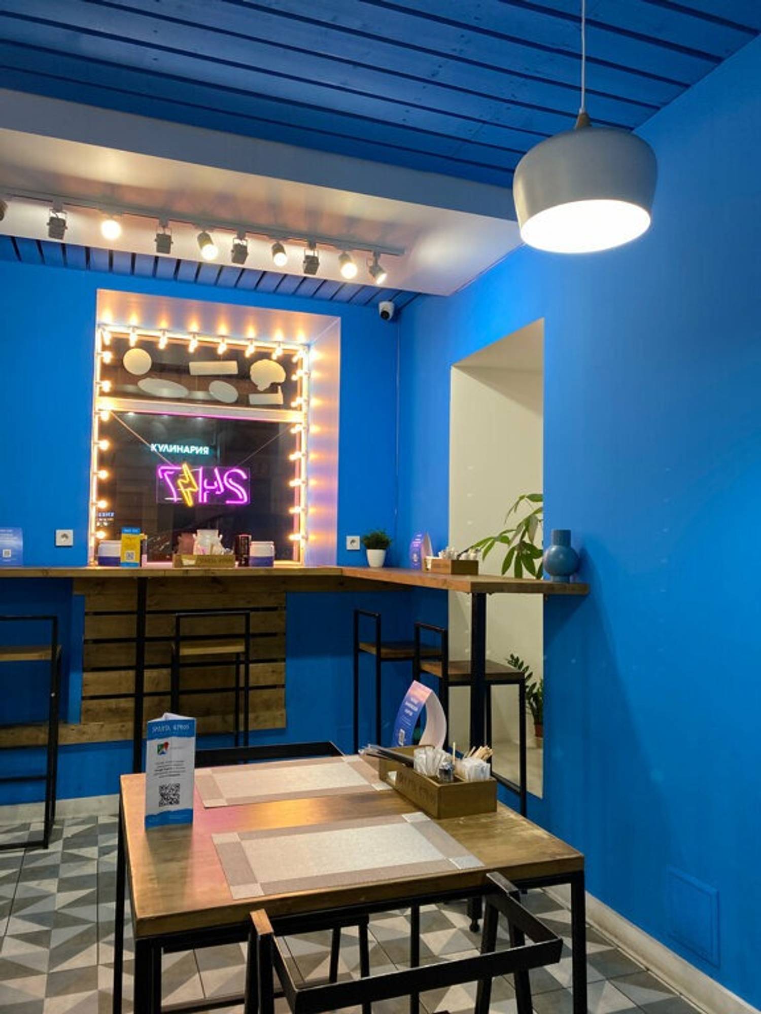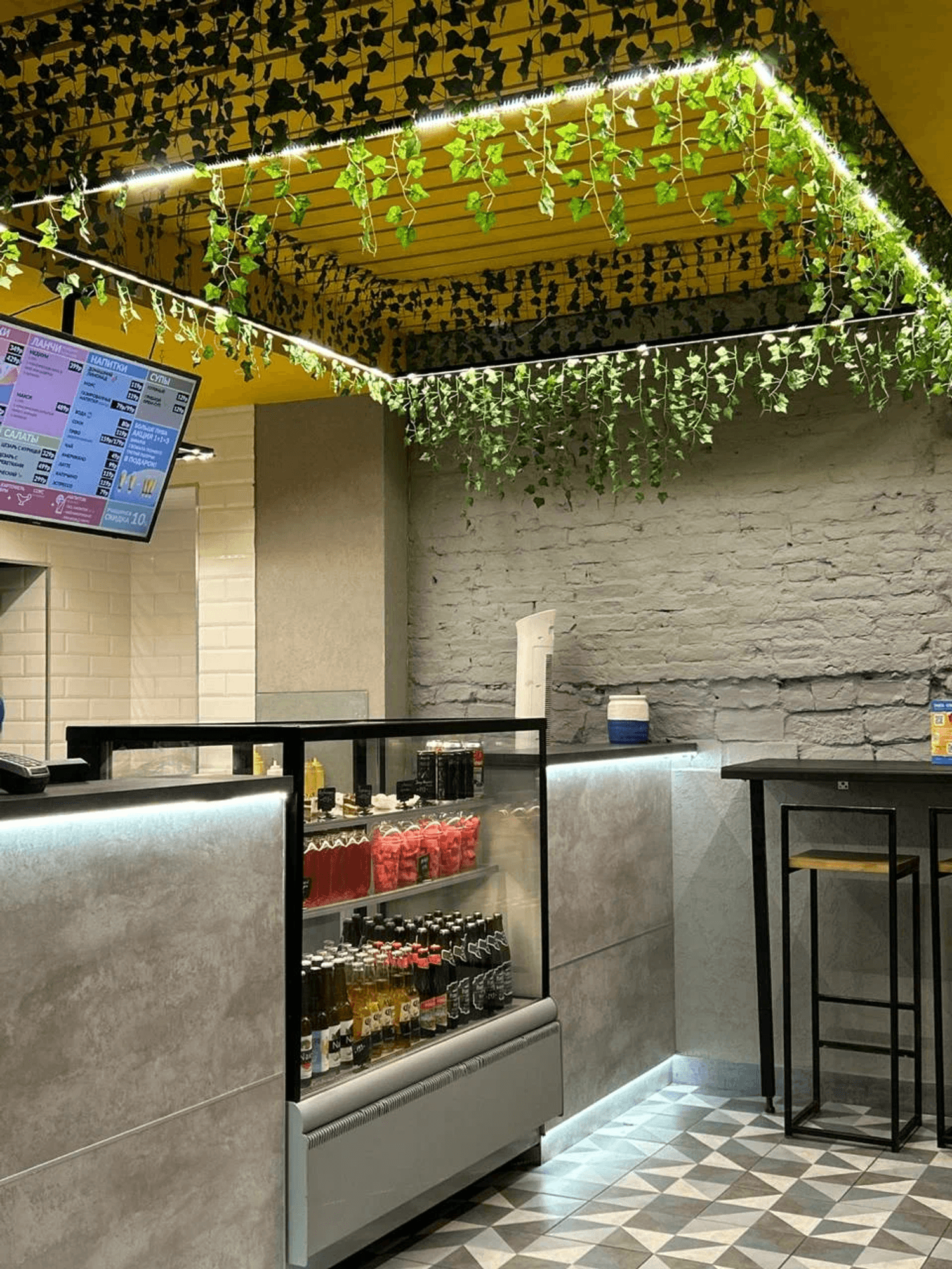 Атмосфера. Яркий интерьер с неоновой вывески с изображением шавермы на стене, зеркало с подсветкой визуально расширяет пространство. Внутри квадратная люстра, украшенная растениями, высокие столы и барные стулья.