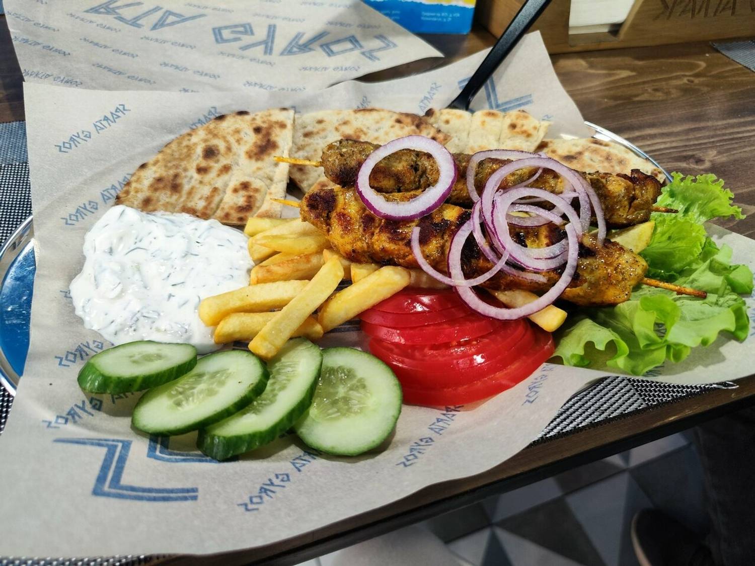 Еда и напитки. В меню — классические гирос с курицей, свининой или фалафелем, которые подают в лаваше с овощами, соусом и картофелем. Его готовят как в пите, так и в киприаки. Также можно заказать греческий салат, картофель по-деревенски и напитки. Из напитков есть сок, лимонад, пиво, чай и классический кофе.