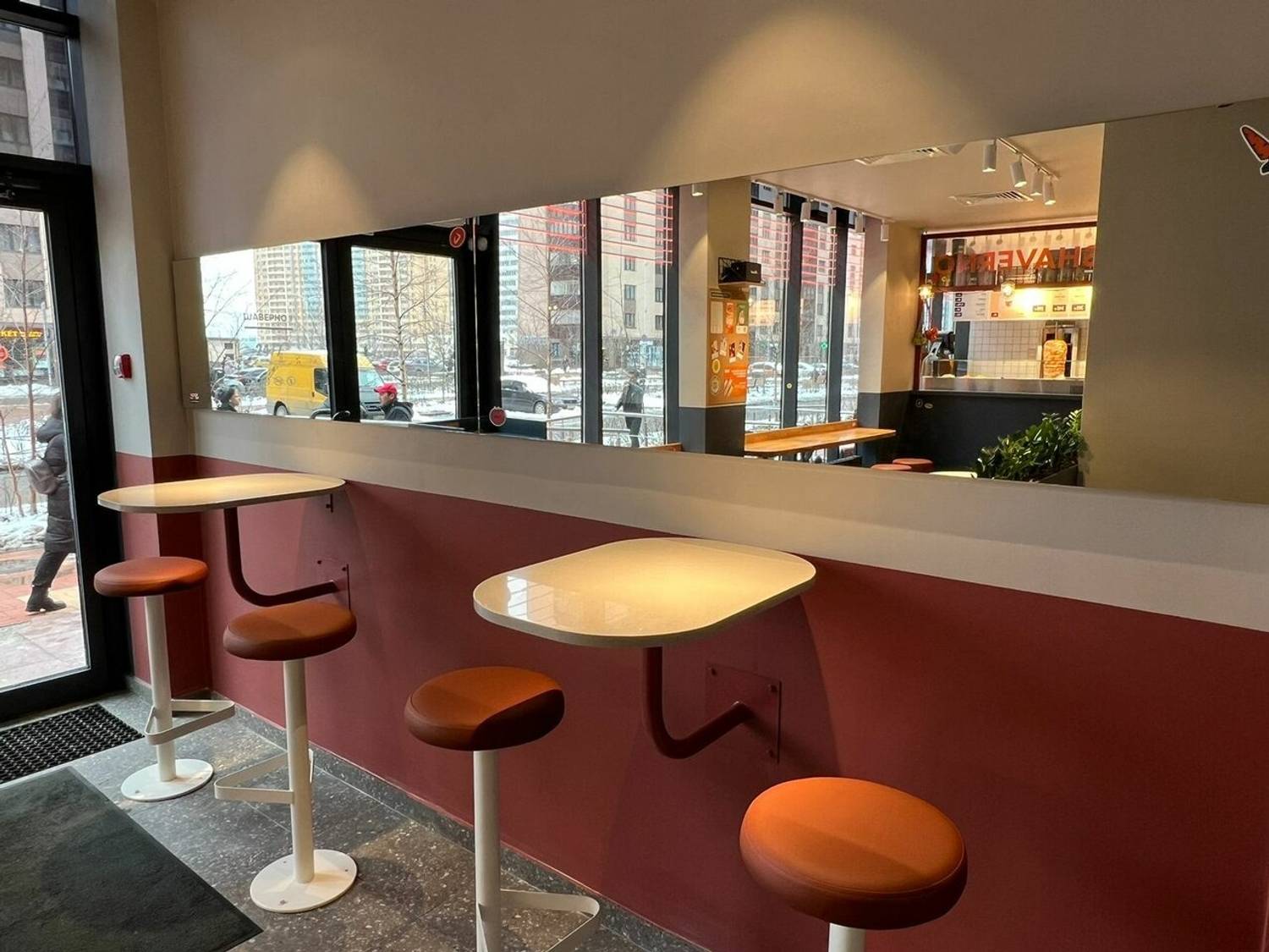 Атмосфера. Пространство оформлено в стильной контрастной гамме: черные диваны и белые круглые столы формируют элегантную основу, а оранжевые круглые пуфики добавляют яркий акцент. Большое прямоугольное зеркало во всю стену визуально расширяет помещение и наполняет его светом.