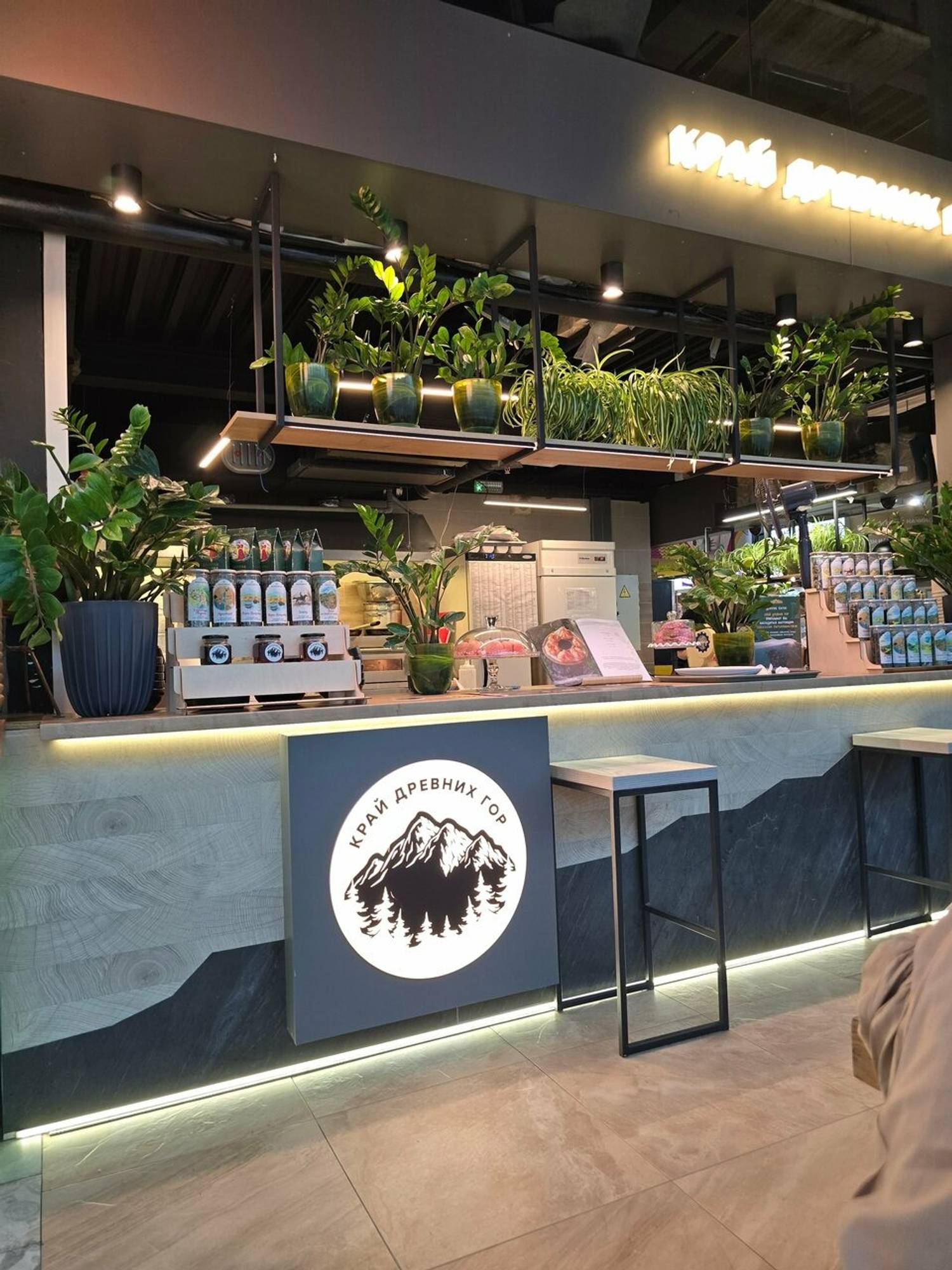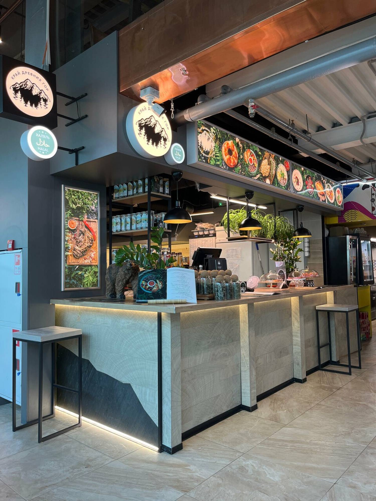 Атмосфера. На фудкорте торгового центра эта стойка выделяется своим дизайном — серая стойка с фирменным логотипом напоминает о скалистых склонах. А на ней нанесен фирменный логотип.