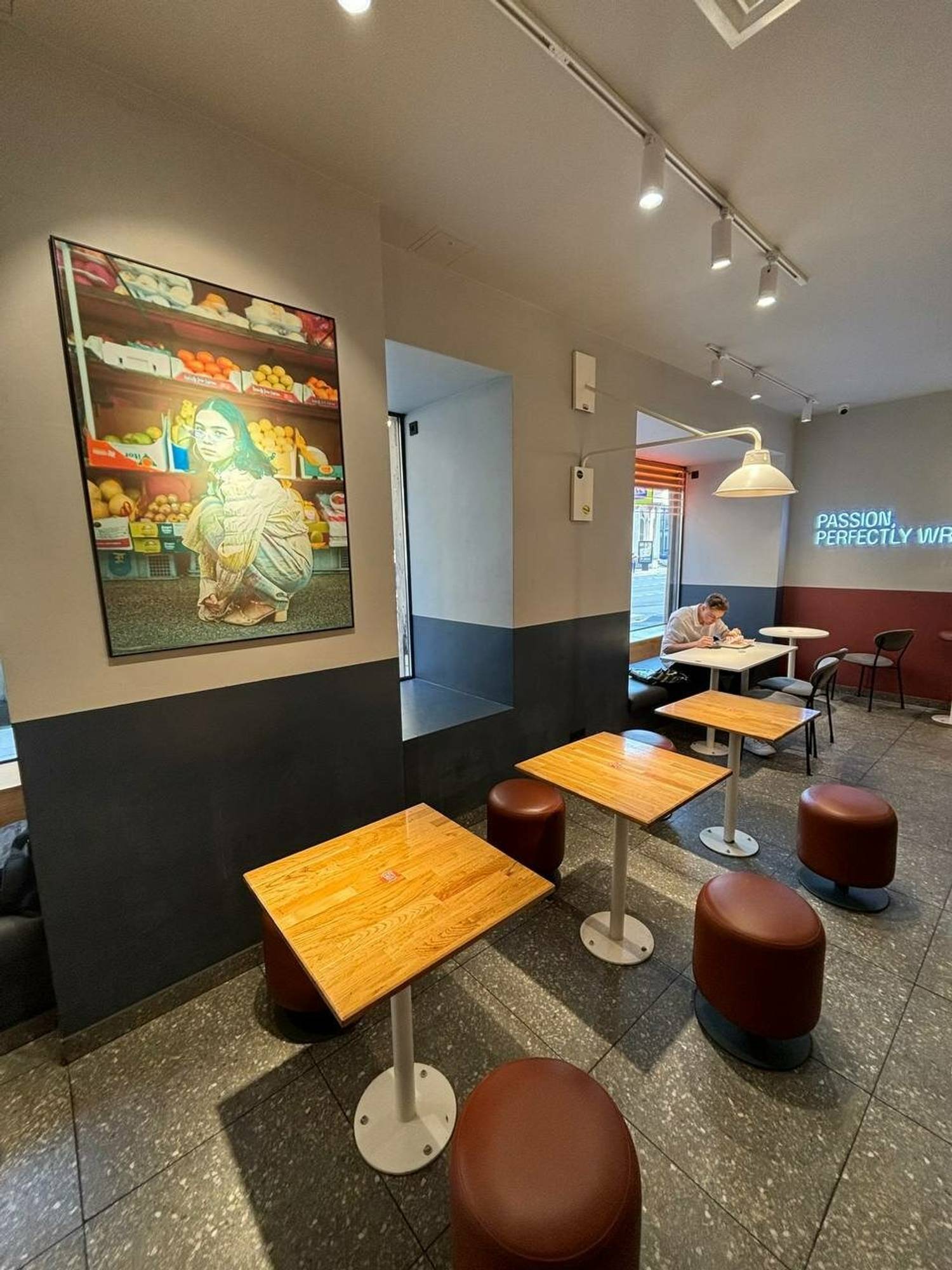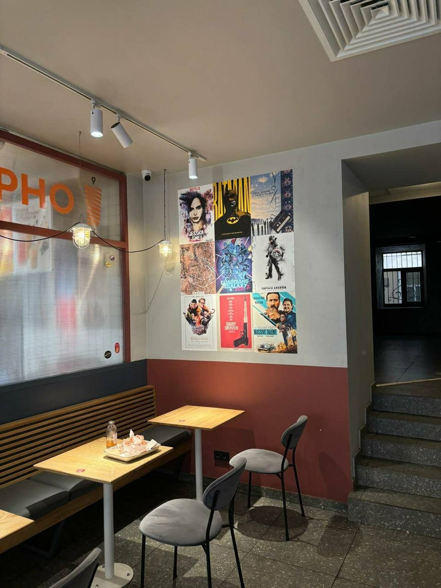 Атмосфера. Яркий интерьер с синей стойкой заказов и ярко-желтыми столами. Дополняют интерьер тематические киноплакаты на стенах.