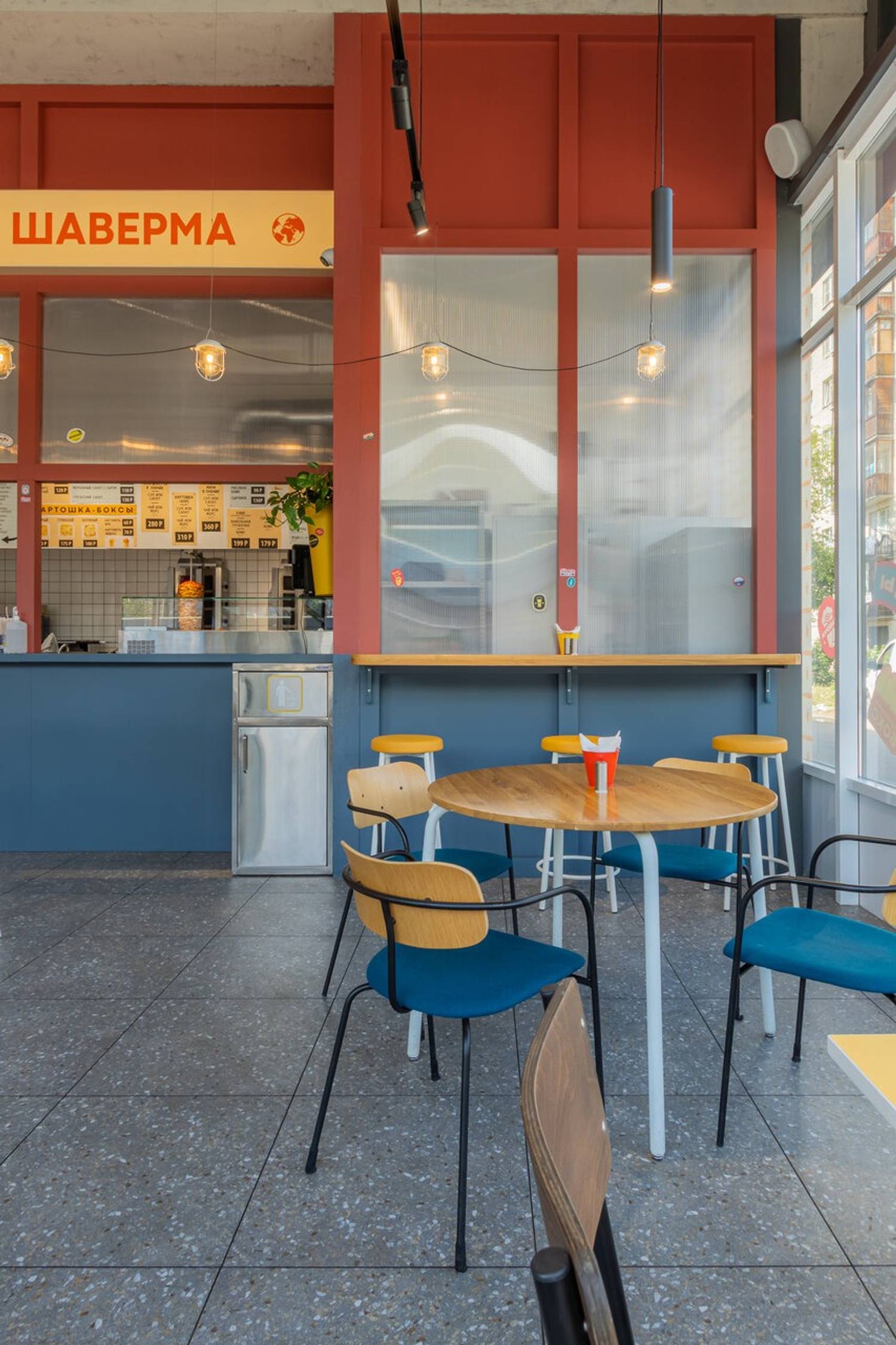 Атмосфера. Интерьер построен на контрасте насыщенных цветов: желтые столы и стулья, синяя стойка заказов. Гости могут расположиться как на высоких столах и стульях, так и за стандартными столами и длинных скамейках.