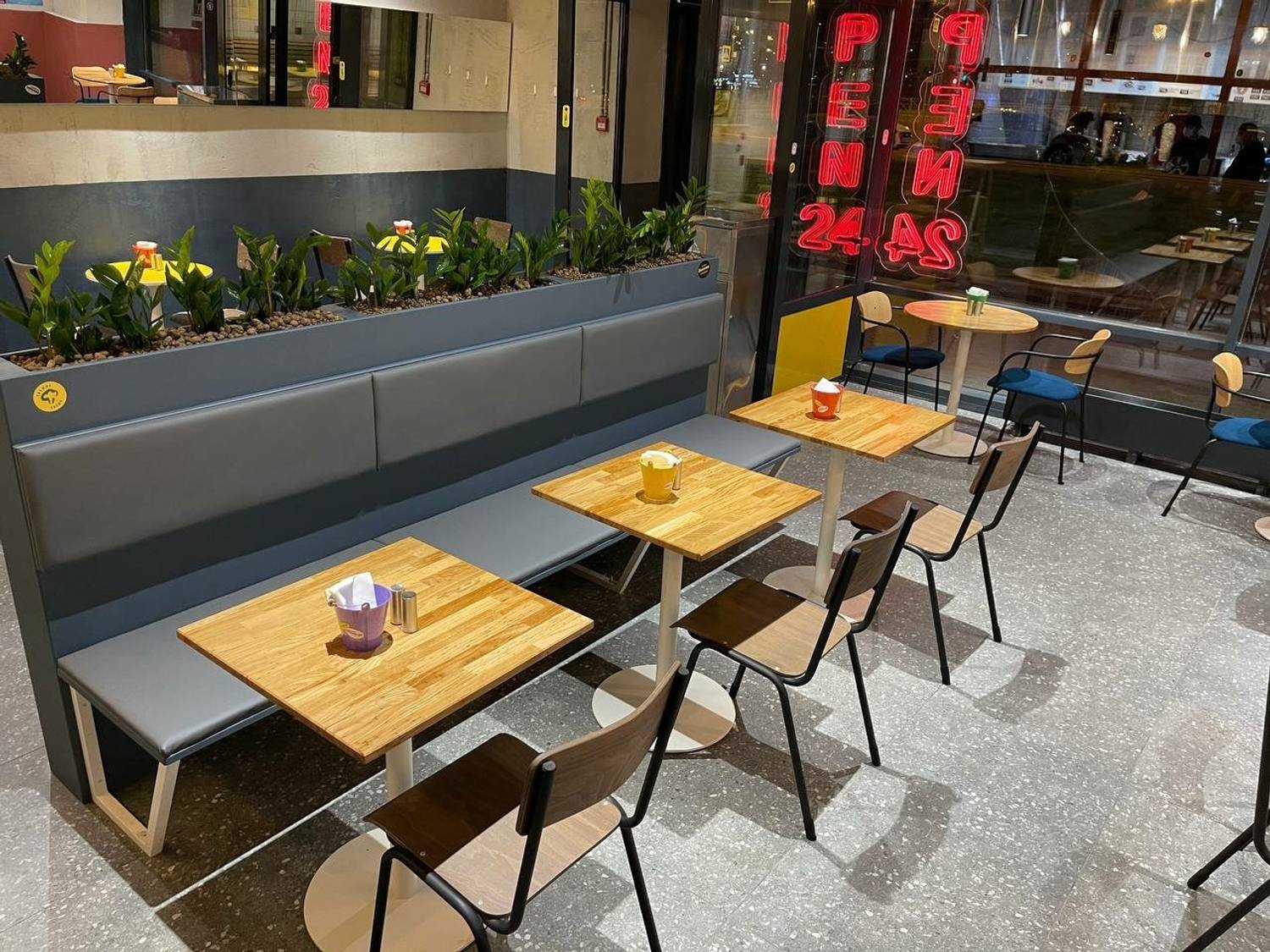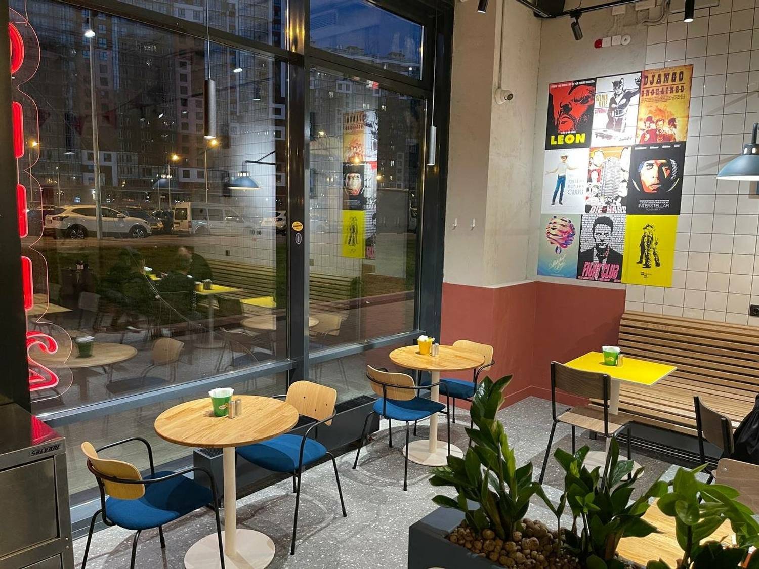 Атмосфера. Здесь воссоздано урбанистичное пространство с бетонными стенами, желтыми столами и рельефной плиткой в отделке. Яркие плакаты в стиле стрит-арт и точечные светильники дополняют динамичную атмосферу городского фуд-корнера.