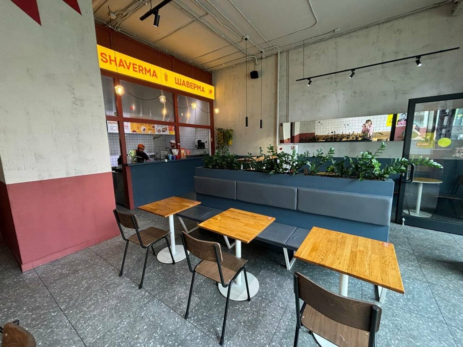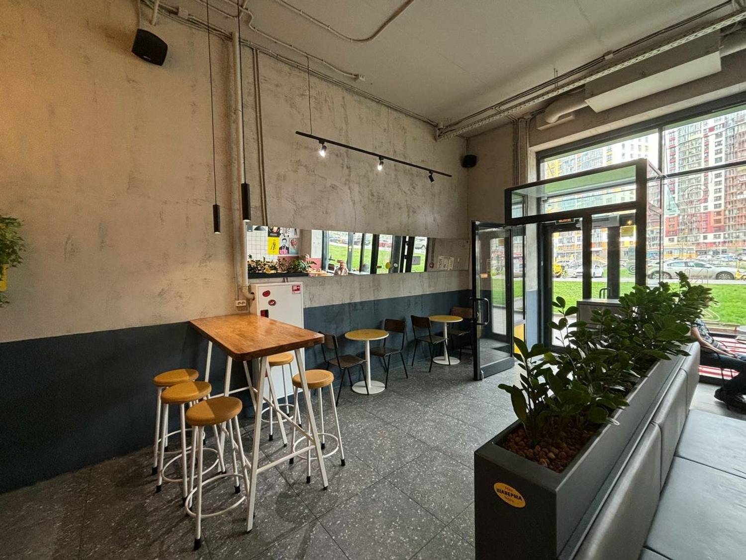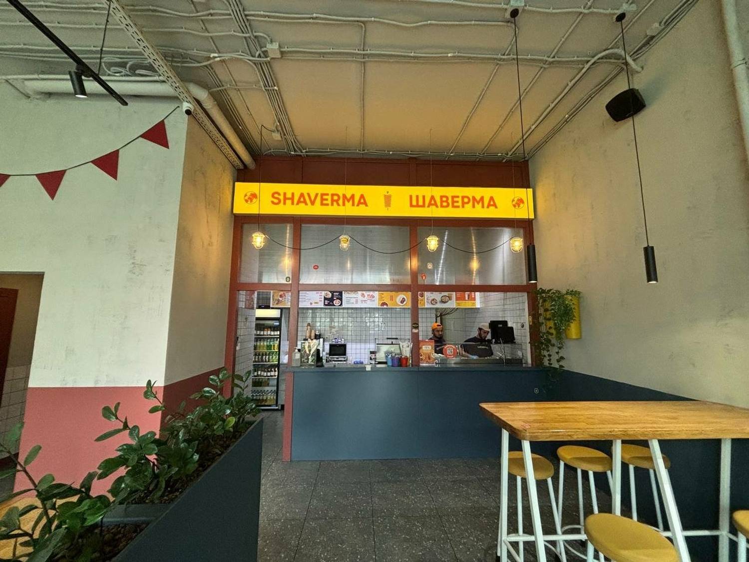 «Шаверно» по адресу Комендантский проспект, 56 — круглосуточная шаверменная с индустриальным дизайном.
