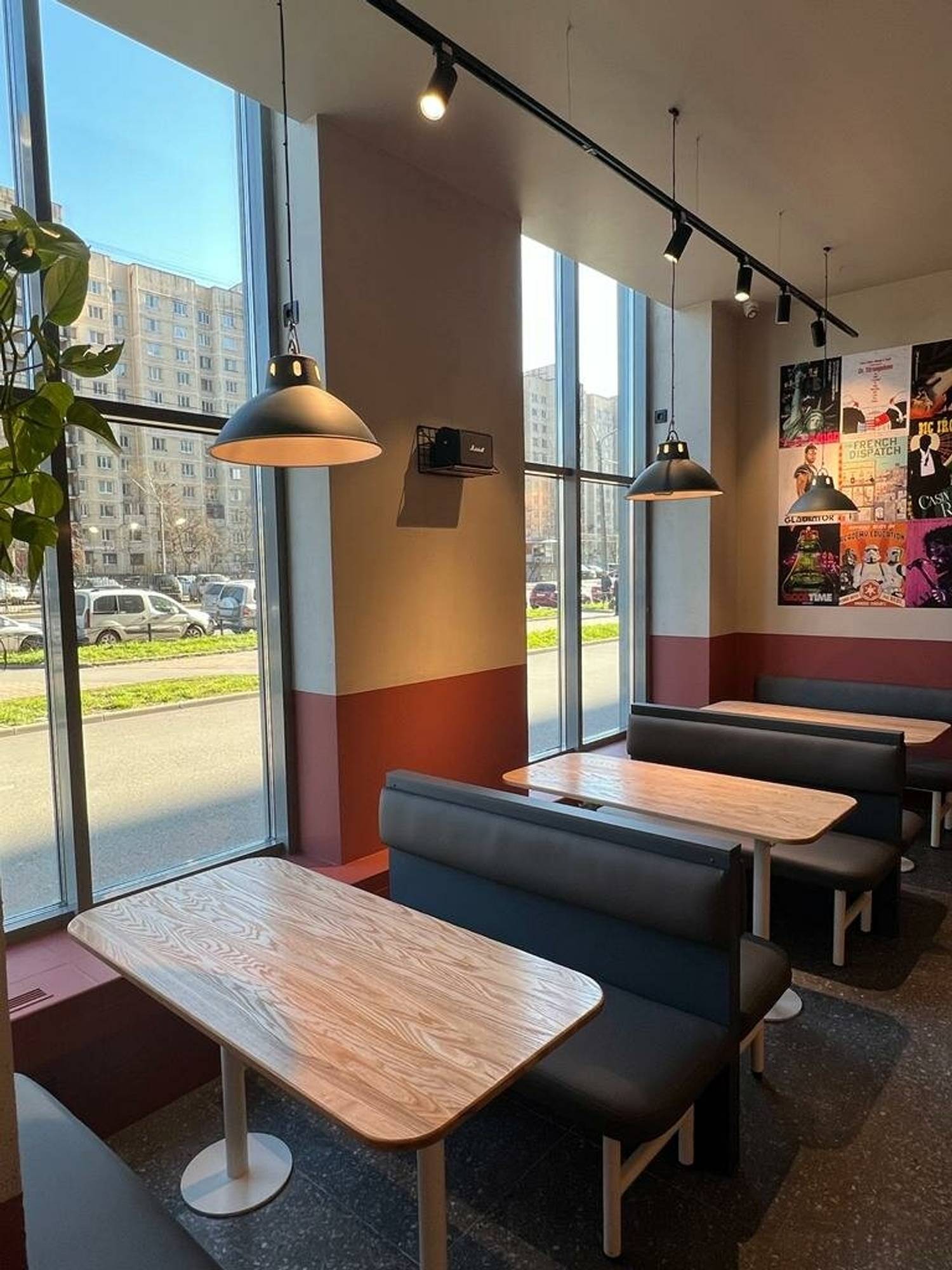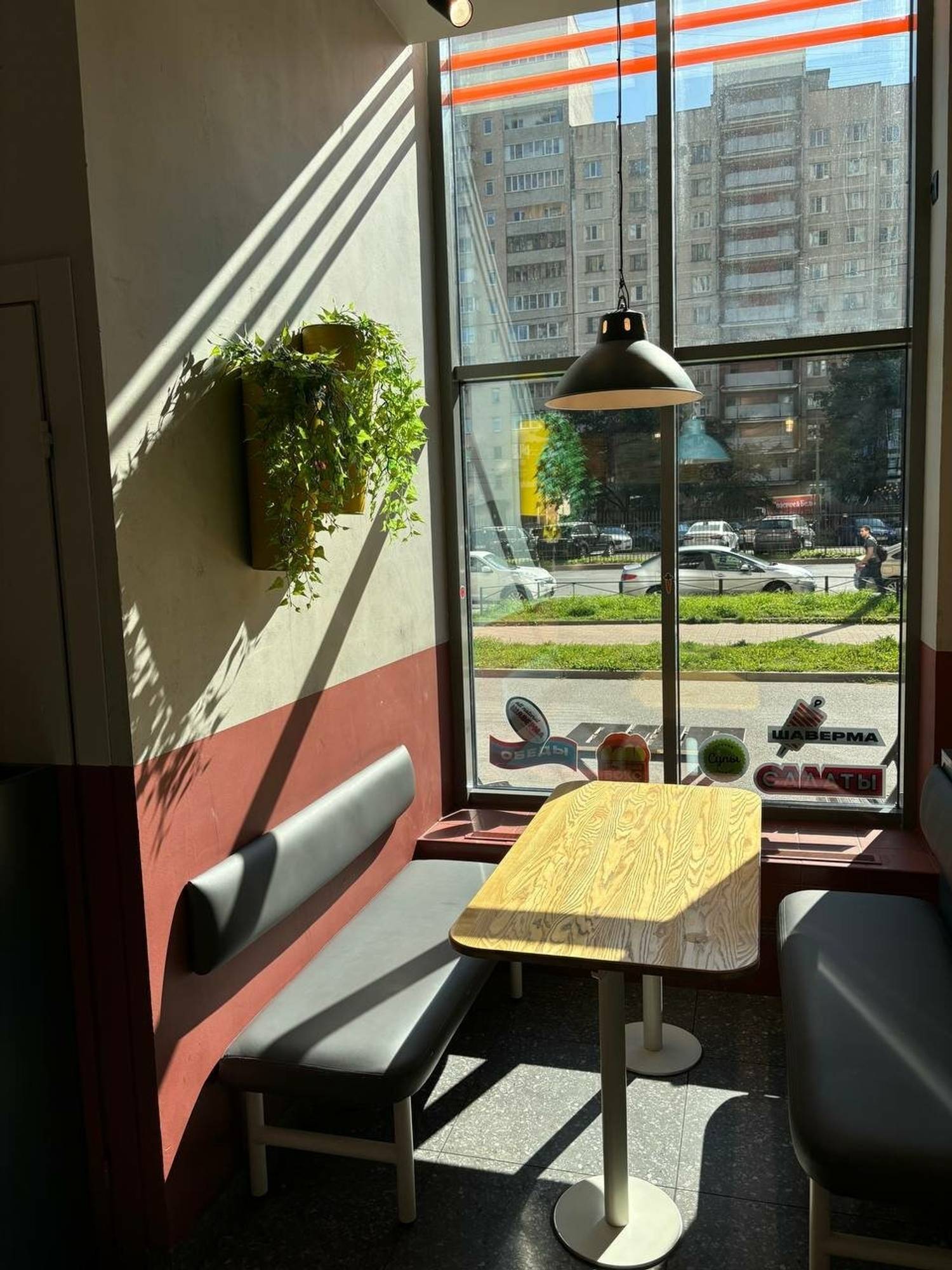 Атмосфера. Здесь создано светлое пространство с панорамными окнами и декоративным козырьком, имитирующим уличную террасу и создающим эффект уличного дворика. Сочетание светлого дерева, зелени и промышленных светильников создает ощущение летнего кафе даже в помещении.