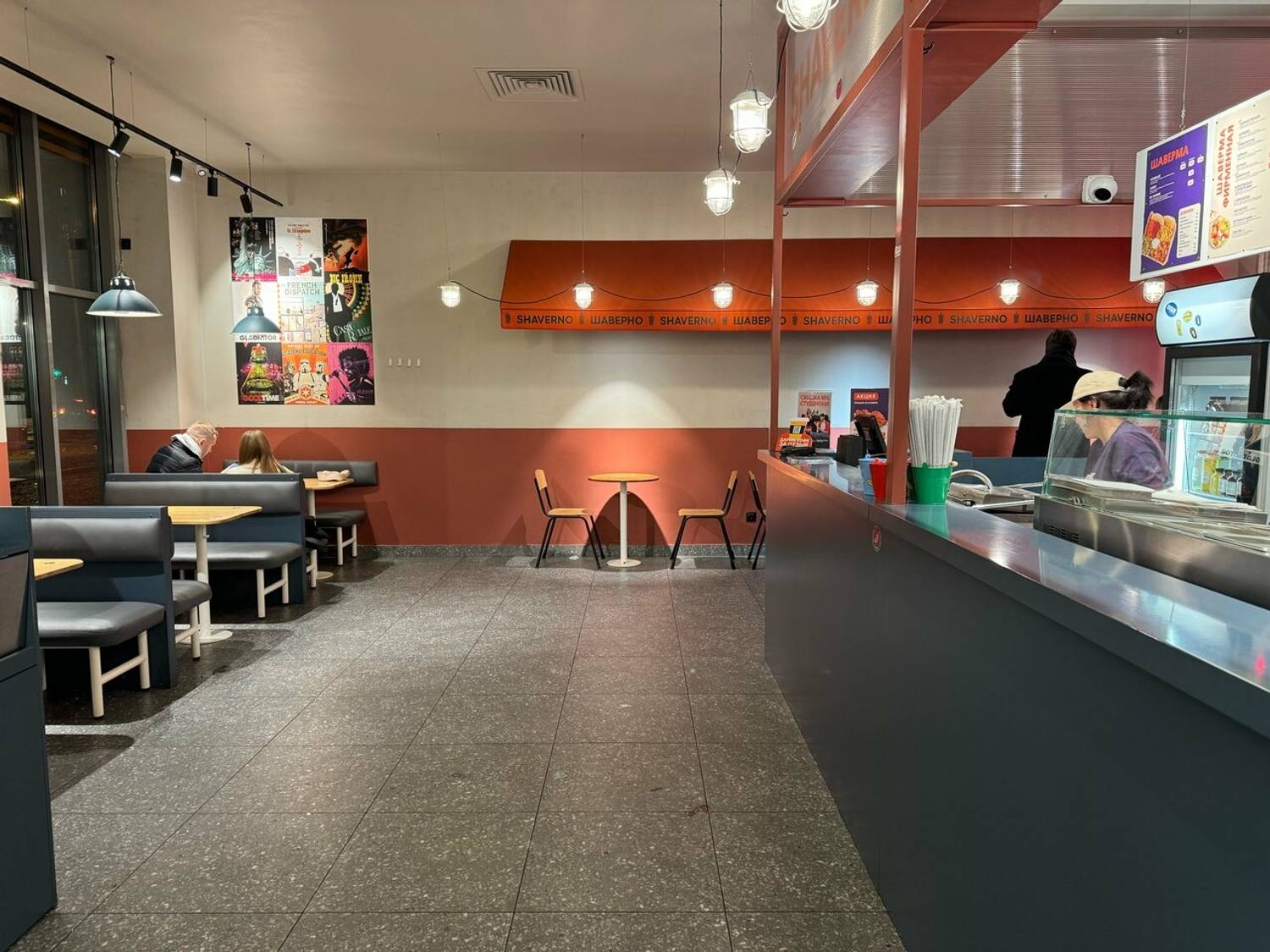 Еда и напитки. В меню — шаверма в лаваше, пите и на тарелке. Также представлены донеры, картофель фри, салат «Оливье», комбо-наборы и горячие блюда: котлета по-киевски, плов с курицей, паста карбонара. Из напитков — морсы, лимонады и чай, а на десерт можно взять трайфлы в стаканчиках.