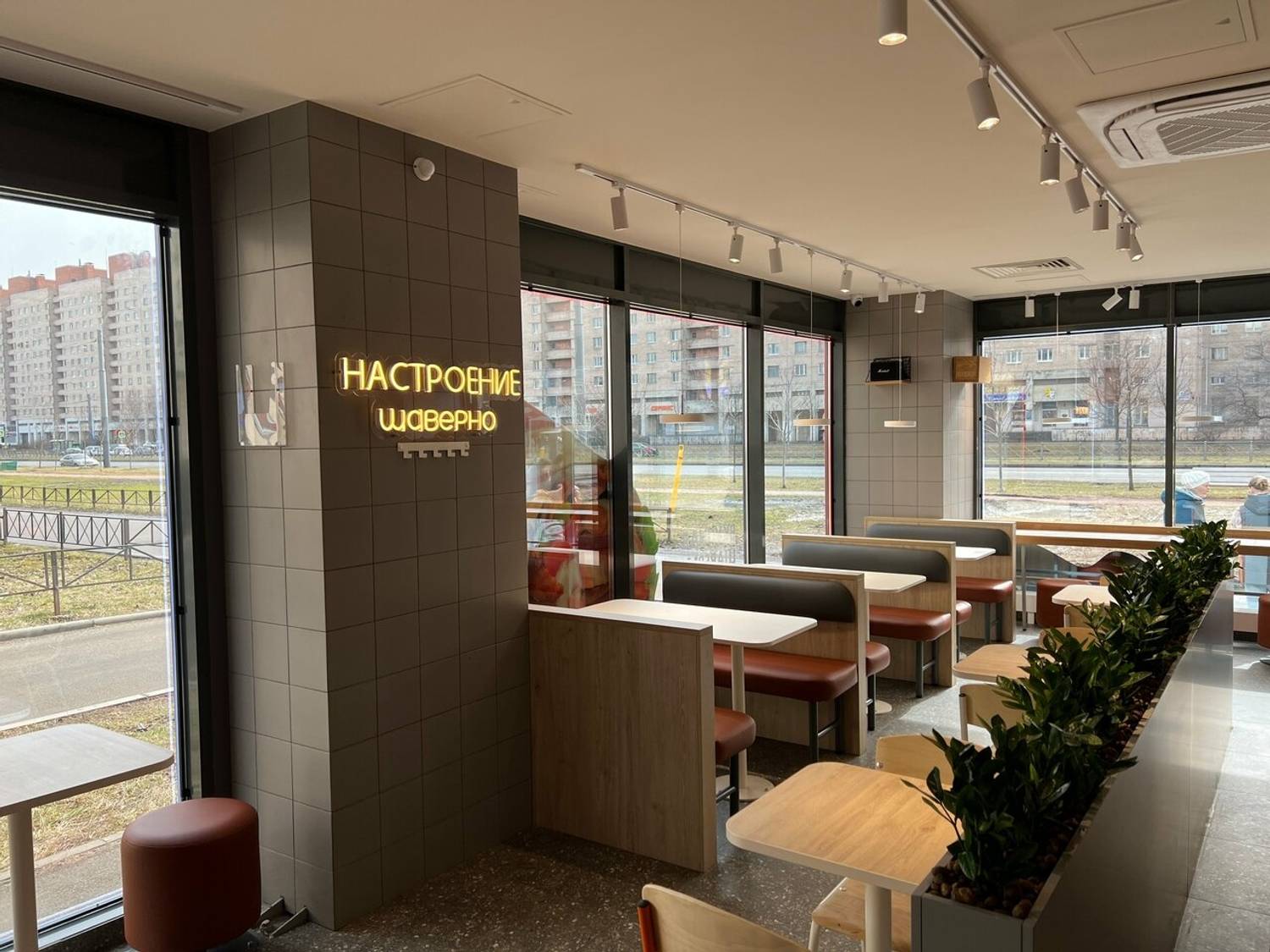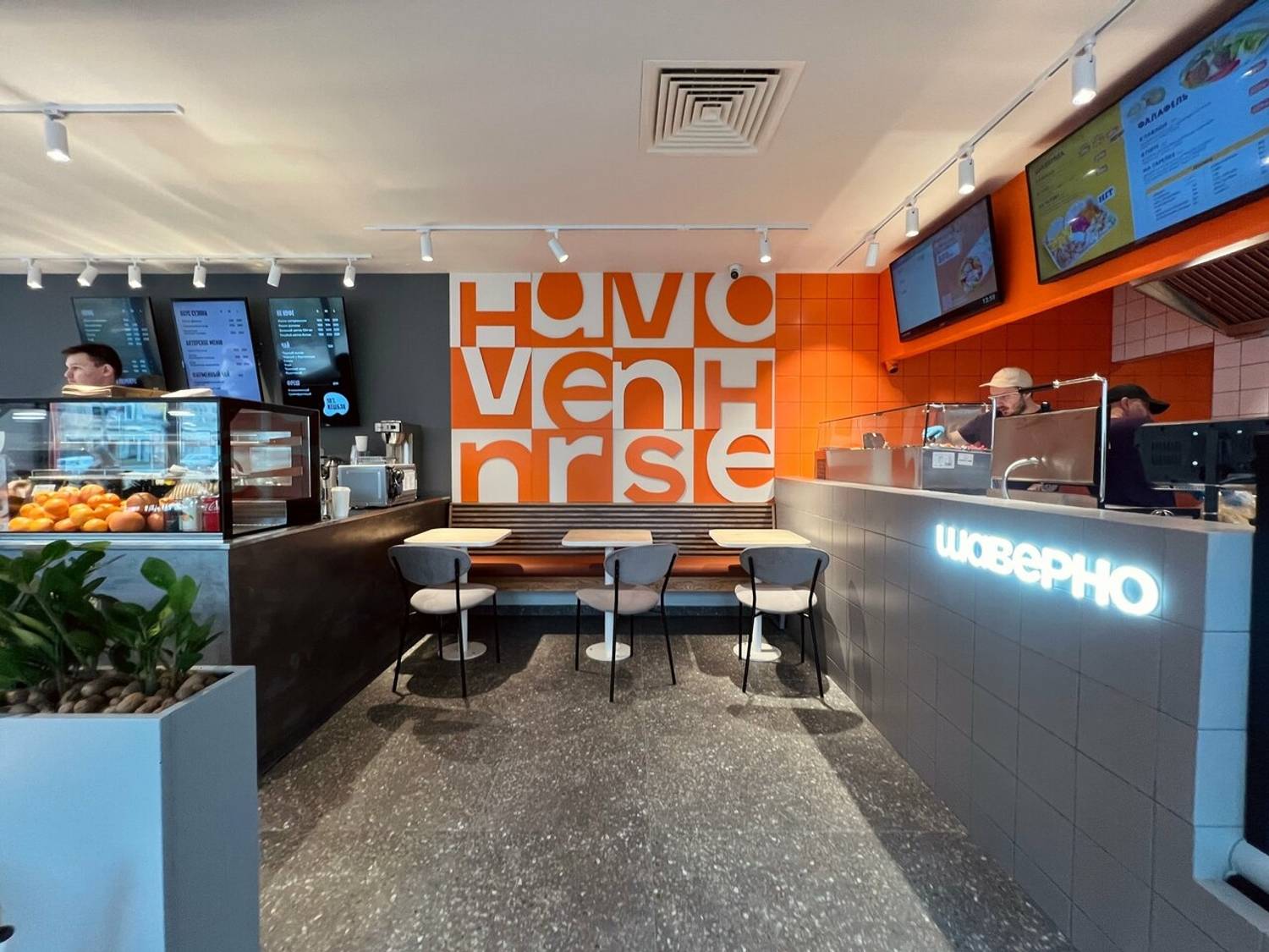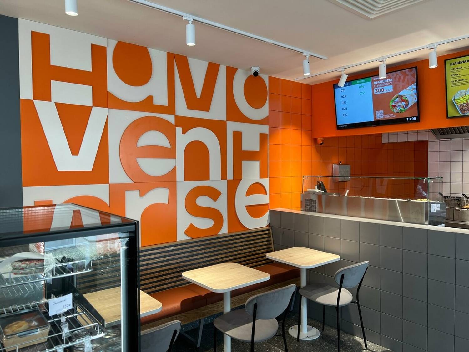 Еда и напитки. Здесь действует классическое меню сети: шаверма в разных вариантах подачи, донеры, картофель фри, комбо-наборы. Из горячих блюд — куриный шницель со спагетти и свинина по-французски с рисом. Из напитков предлагают лимонады, морсы и компоты, а в меню завтраков включены блинчики и сырники.