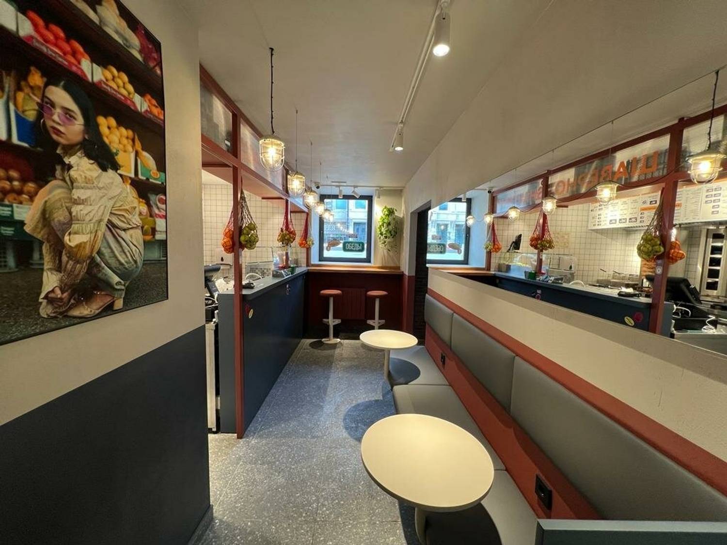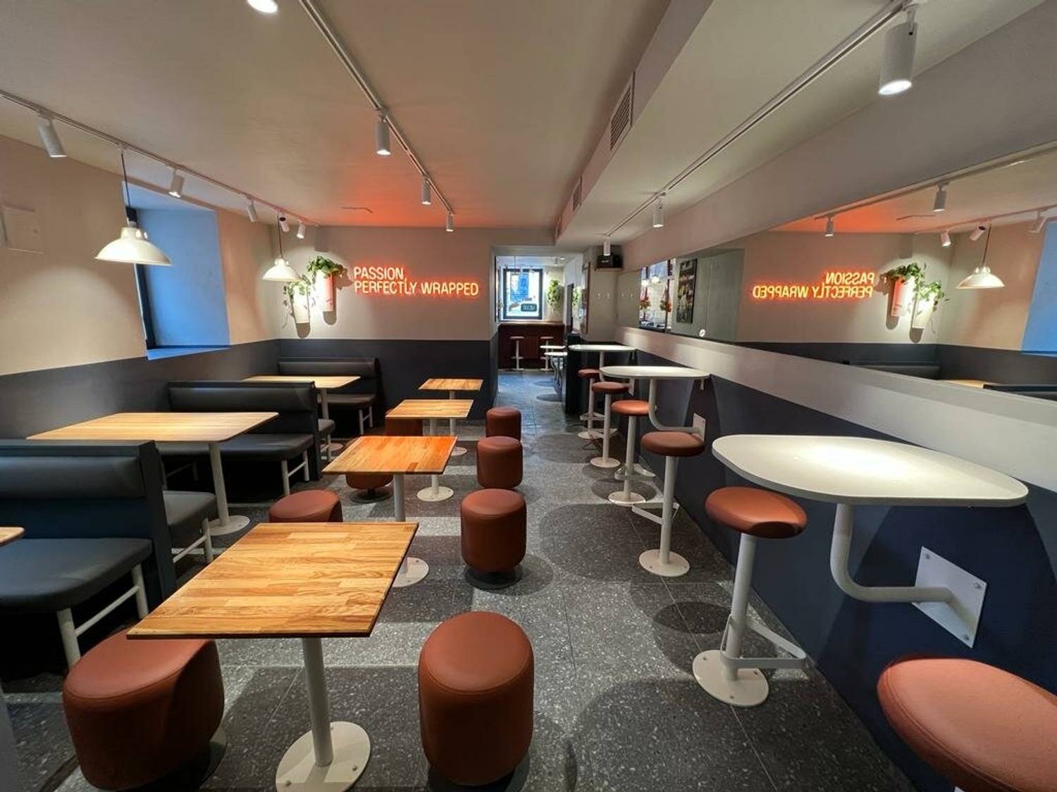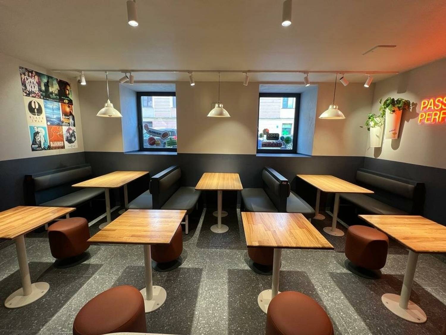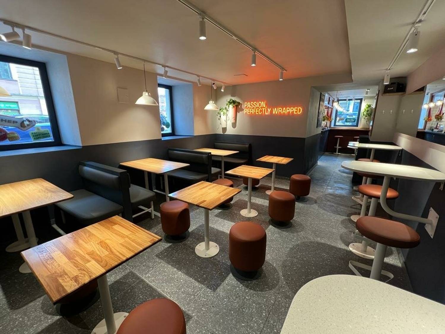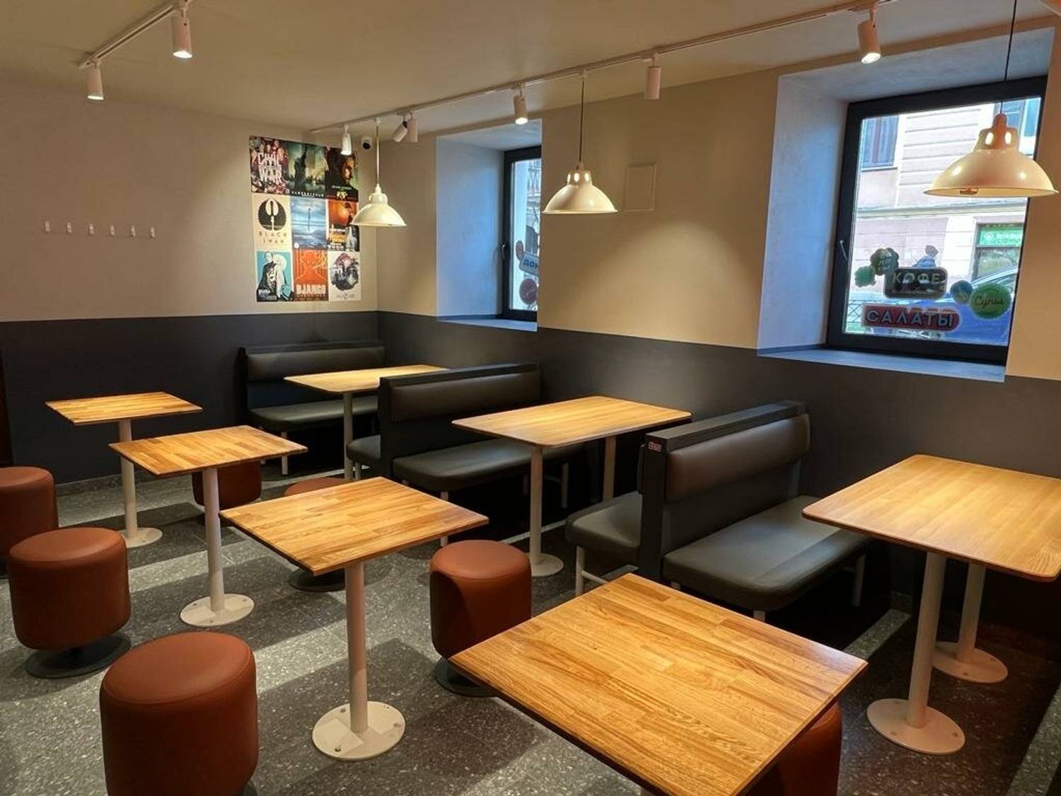 Атмосфера. Пространство рядом с ТЦ «Галерея» сочетает в себе функциональность и комфорт: мягкие диванчики у панорамных окон, высокие столы с барными стульями и компактные столики для одиночных посетителей. Светлые тона, деревянные поверхности и фирменные желтые акценты создают гармоничную среду, где приятно задержаться и перекусить.